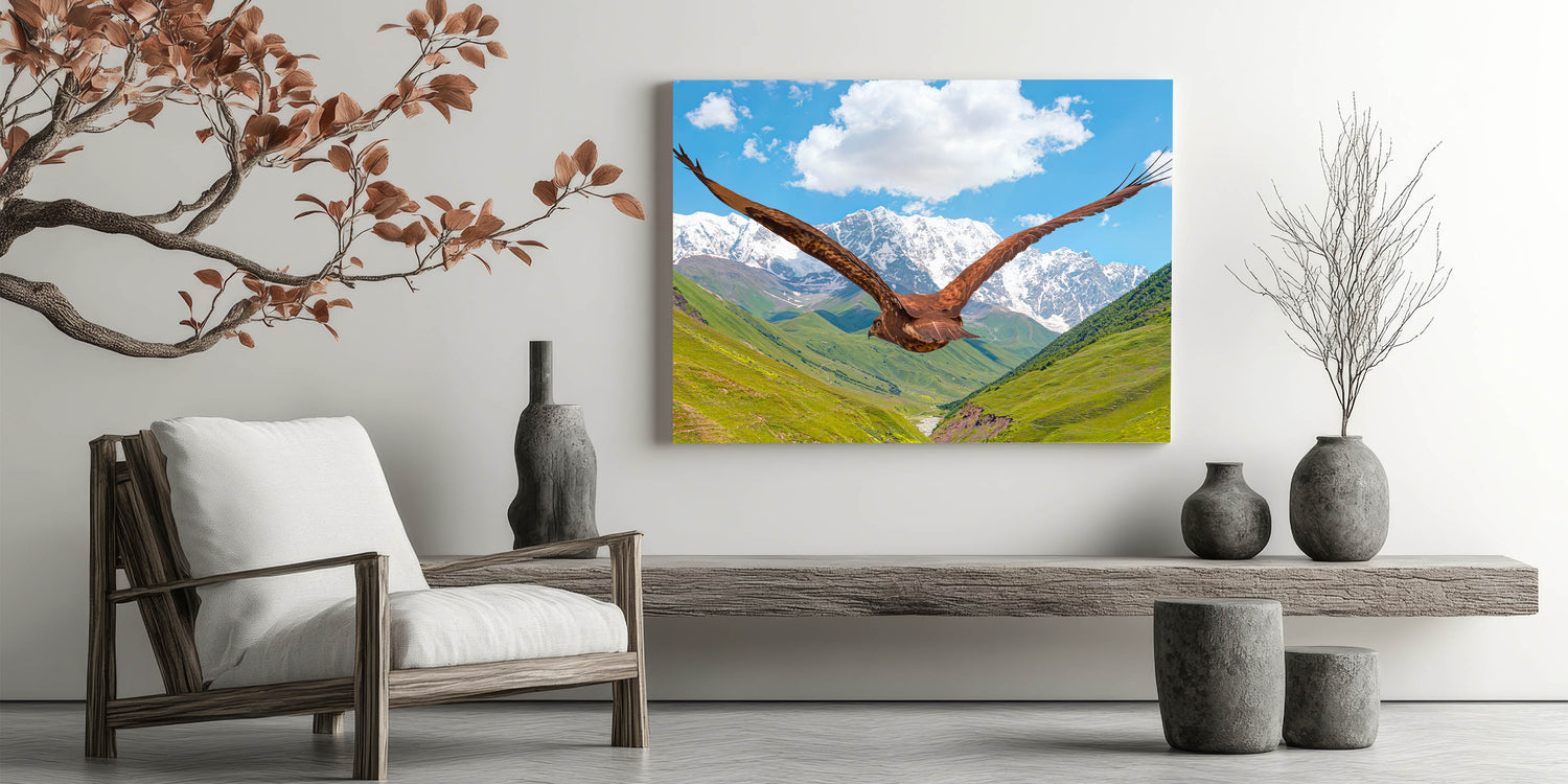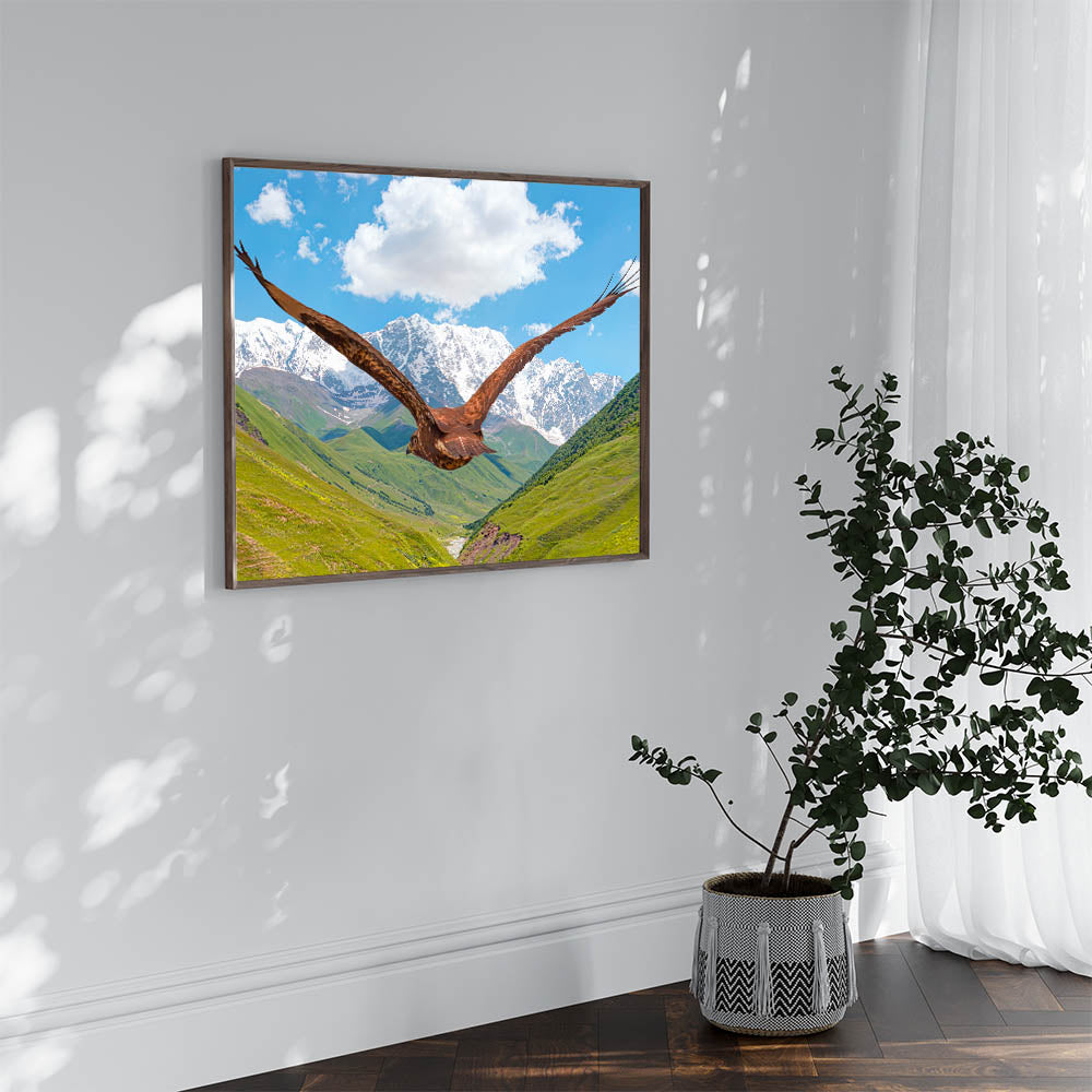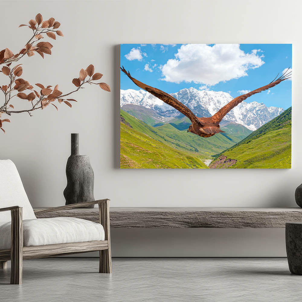 Perfect for nature enthusiasts and those looking to add a touch of grandeur to their decor, this artwork brings the vastness of the mountains and the grace of the hawk into your home. The combination of the expansive valley, clear skies, and majestic bird creates a visually stunning composition that inspires a sense of adventure and tranquility.