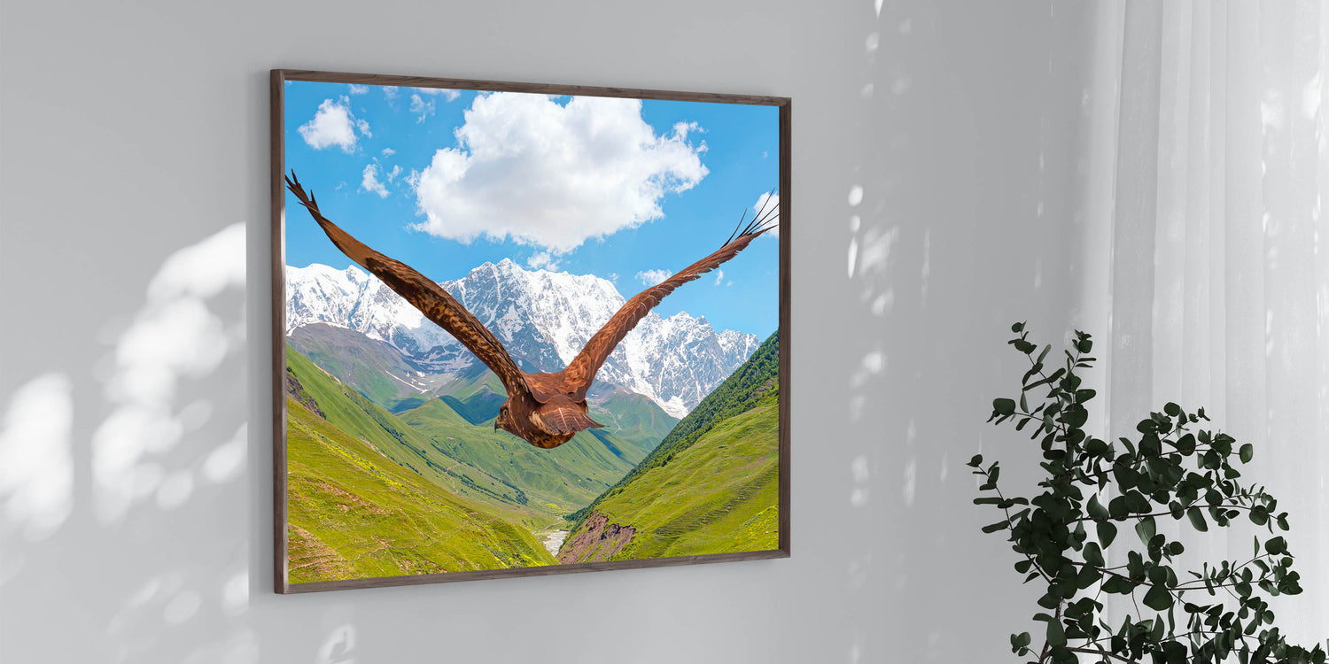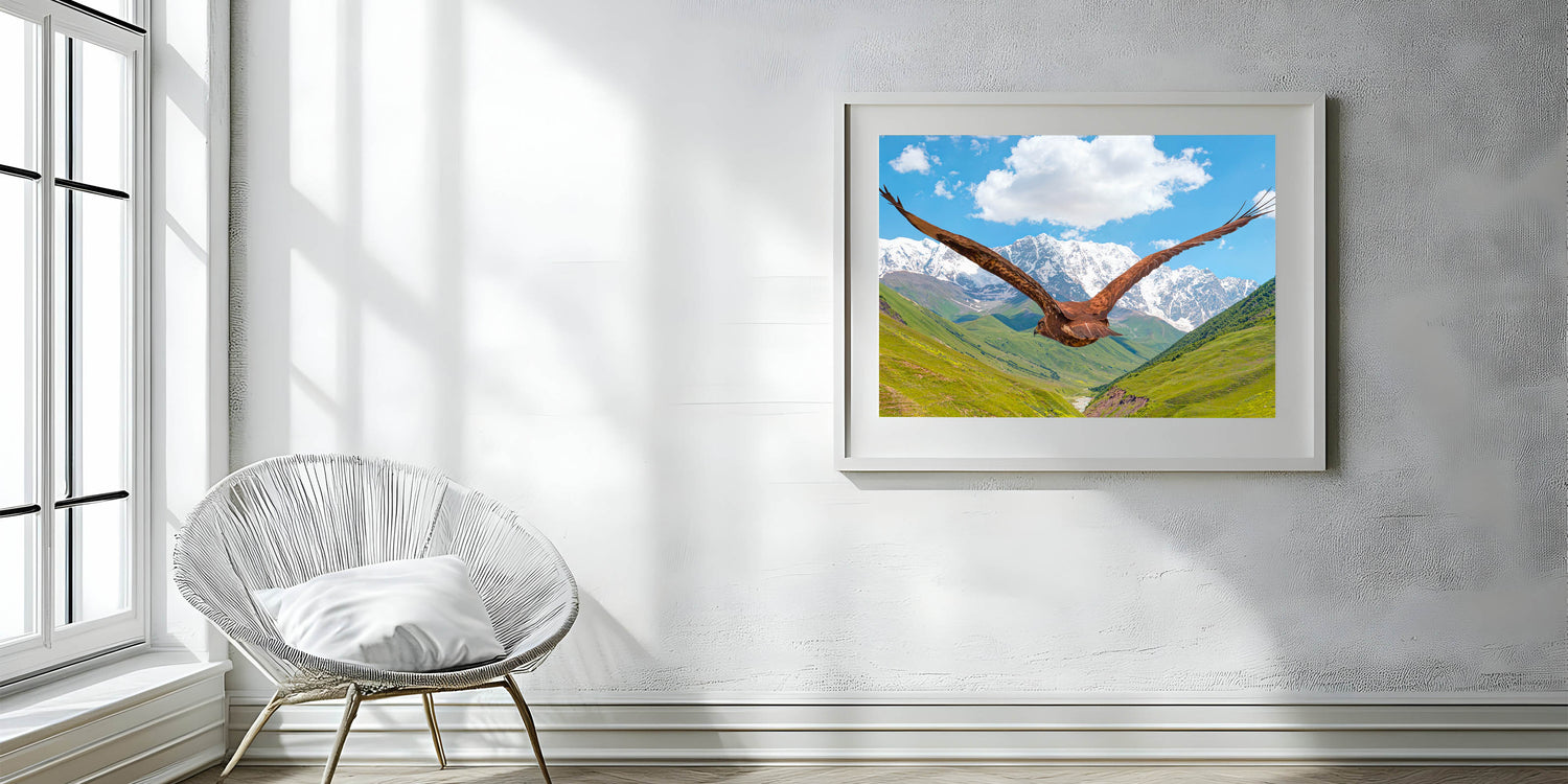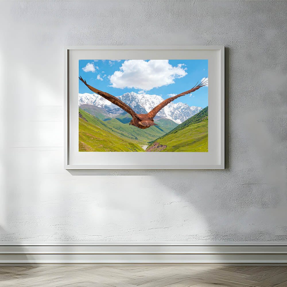 Perfect for nature enthusiasts and those looking to add a touch of grandeur to their decor, this artwork brings the vastness of the mountains and the grace of the hawk into your home. The combination of the expansive valley, clear skies, and majestic bird creates a visually stunning composition that inspires a sense of adventure and tranquility.
