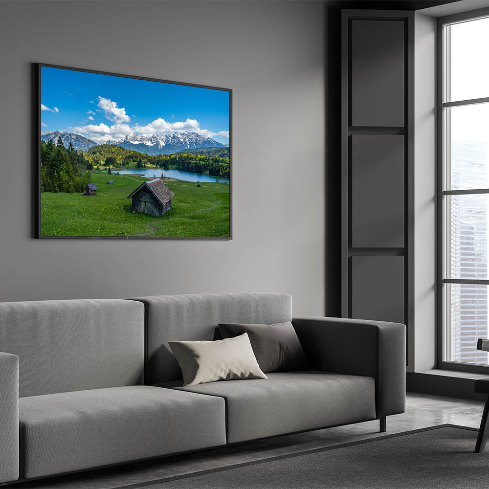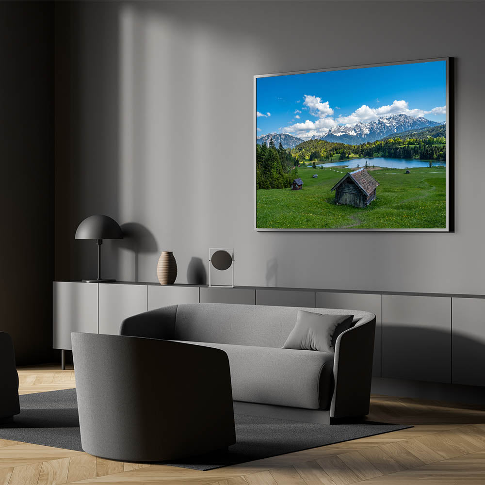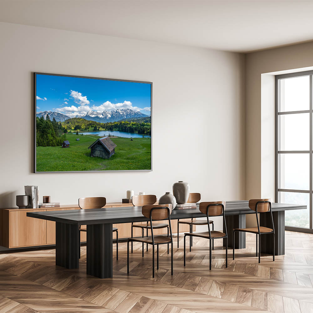 This stunning artwork captures the peaceful beauty of Bavaria's iconic landscape, featuring a rustic cabin nestled in a lush green meadow with the majestic Bavarian Alps in the background. The clear blue skies and picturesque lake complete the scene, offering a tranquil view that brings the serenity of Germany’s countryside into your home. Ideal for those who love outdoor adventures and the natural beauty of alpine regions, this artwork makes a perfect addition to any space.