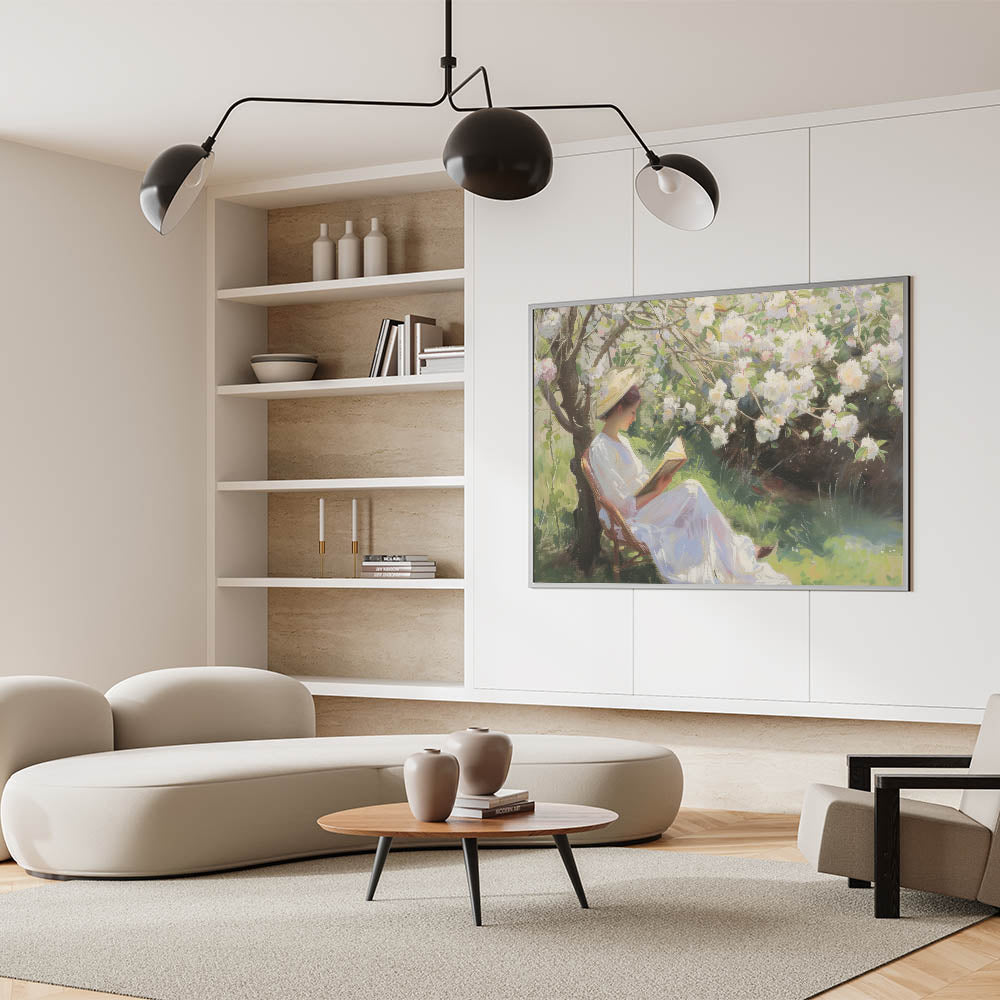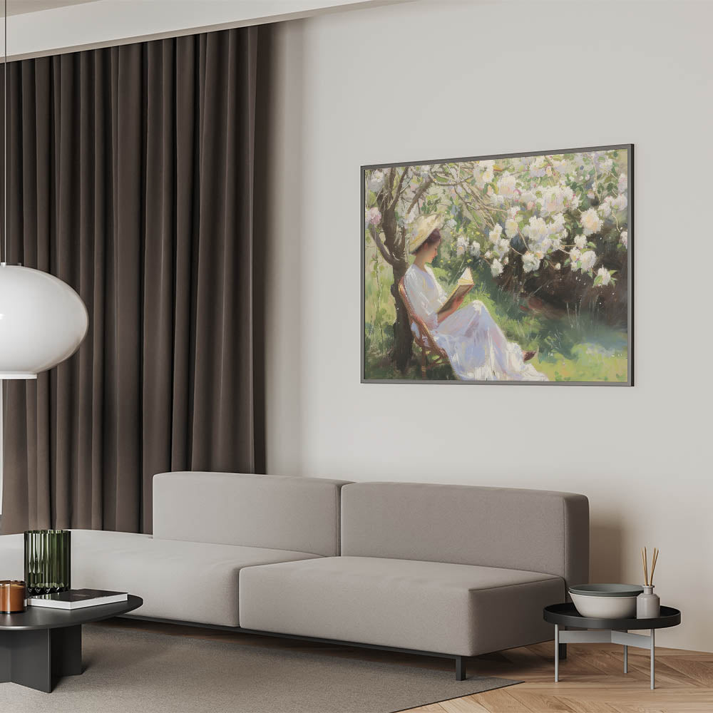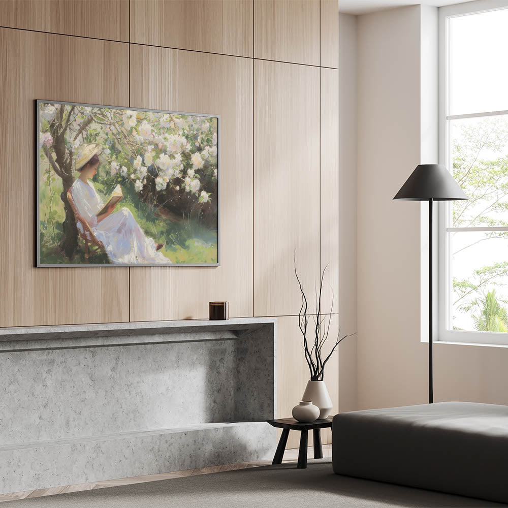 Elevate your decor with this stunning piece of abstract figurative art, capturing a serene outdoor scene. This design features a woman reading under a blossoming tree, painted in vibrant, impressionistic strokes. Perfect for creating a calm, artistic atmosphere in your space.