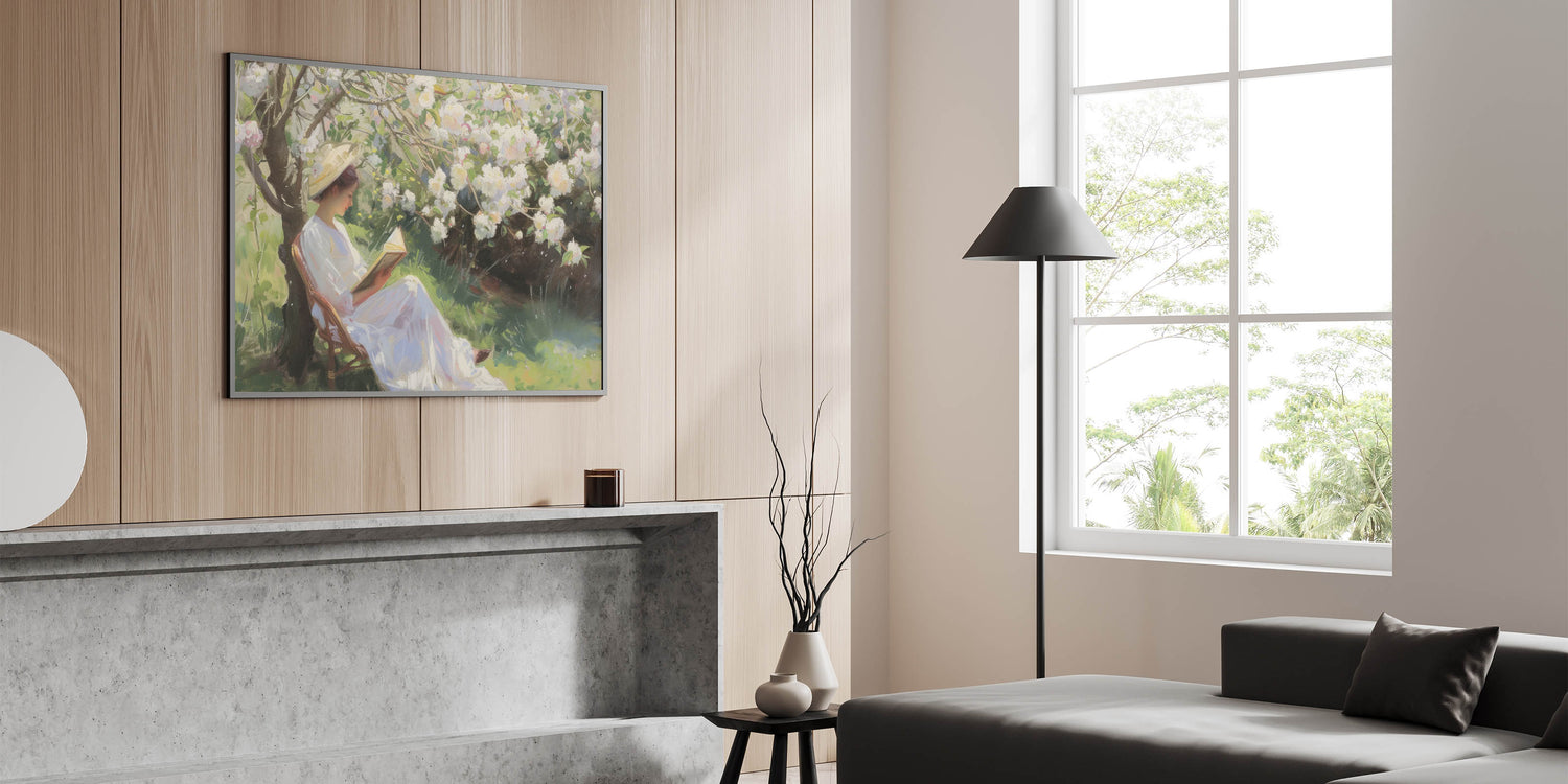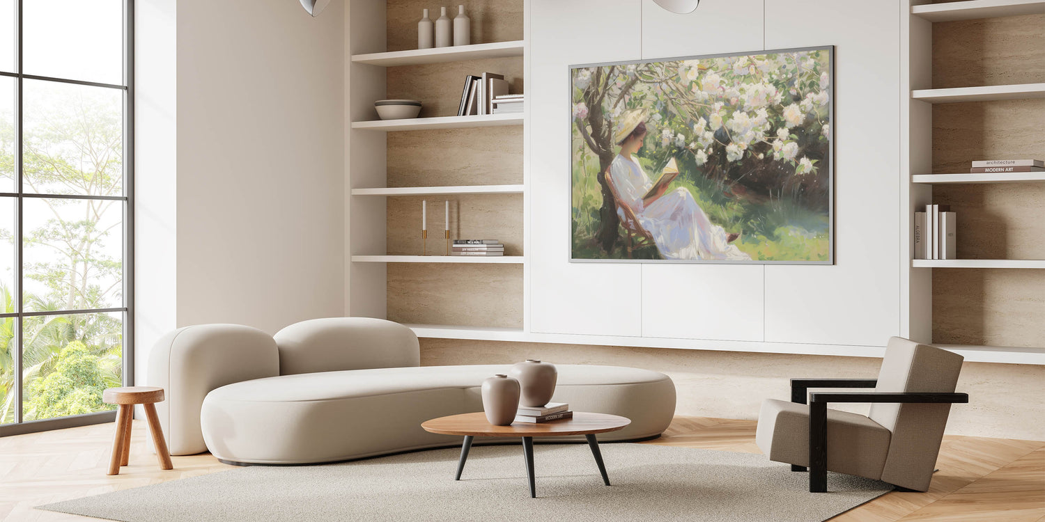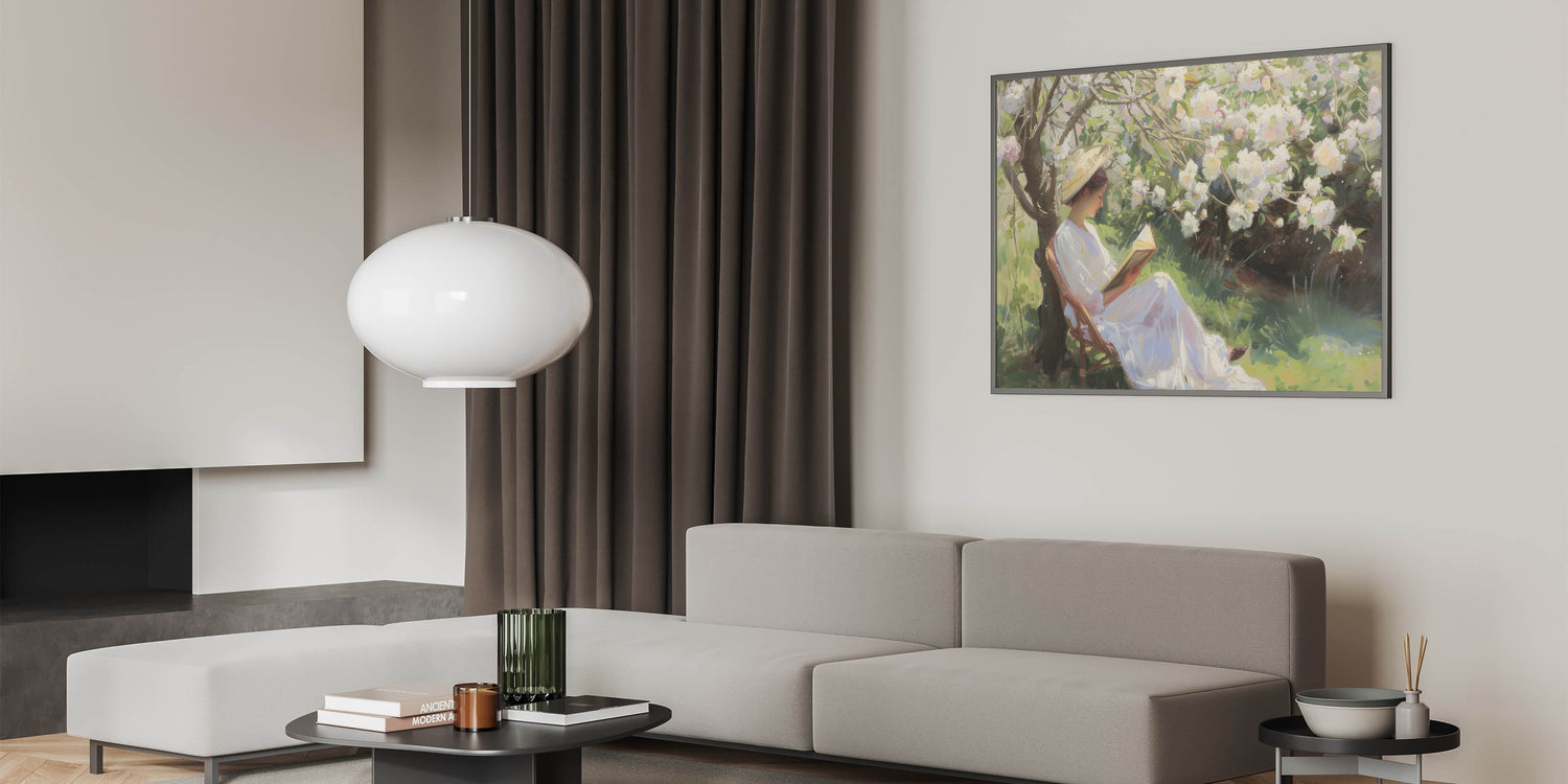 Elevate your decor with this stunning piece of abstract figurative art, capturing a serene outdoor scene. This design features a woman reading under a blossoming tree, painted in vibrant, impressionistic strokes. Perfect for creating a calm, artistic atmosphere in your space.