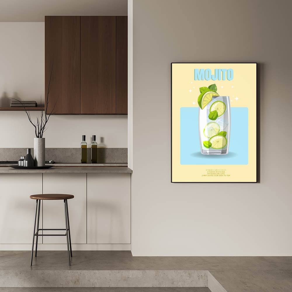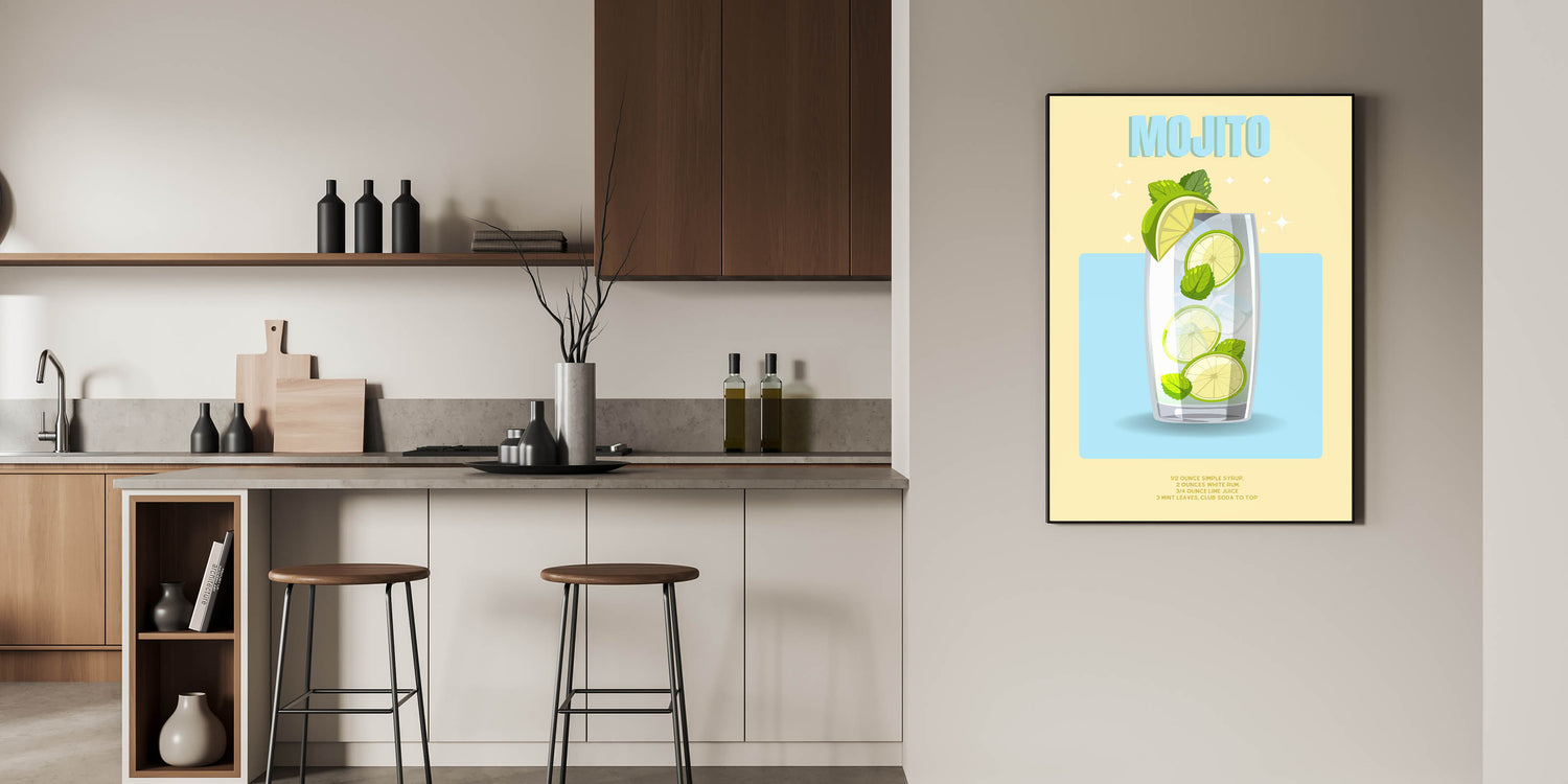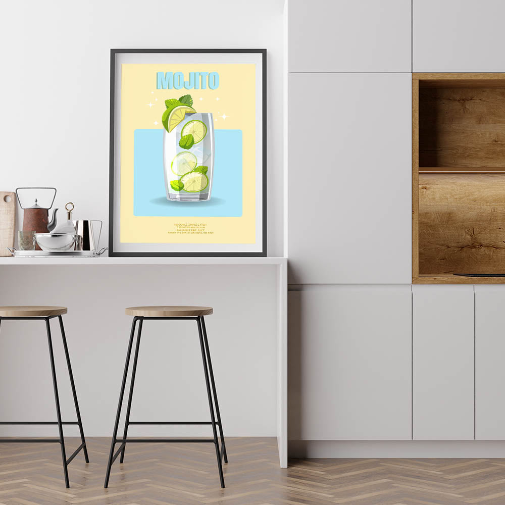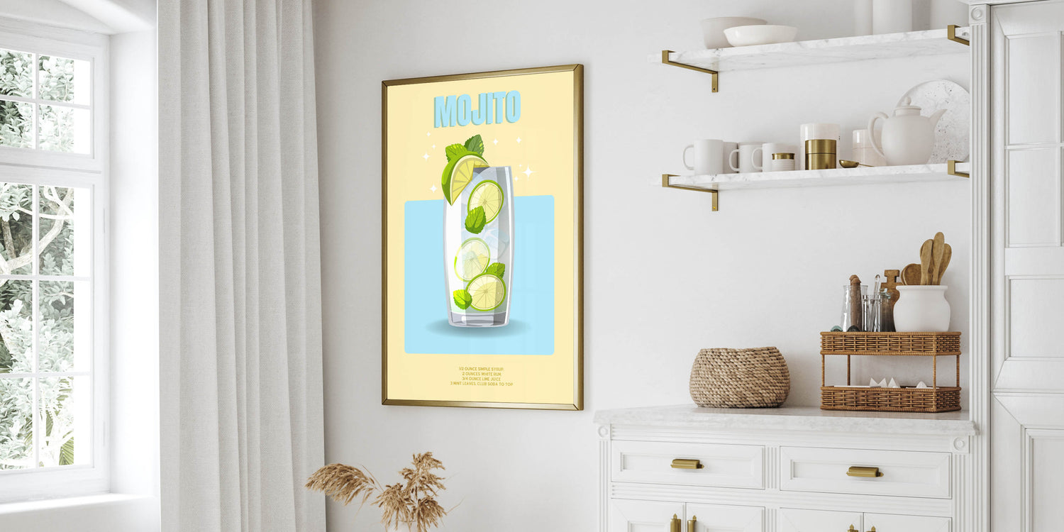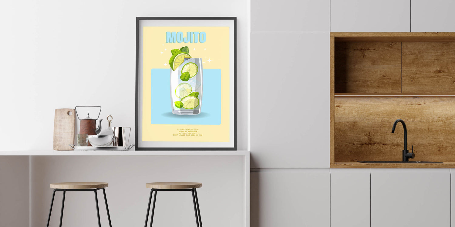 - Drink-Themed Art Prints: A cocktail art print that celebrates the classic mojito, perfect for beverage art decor.