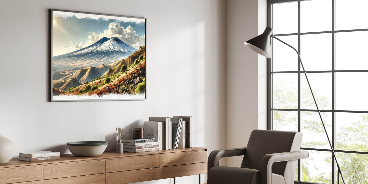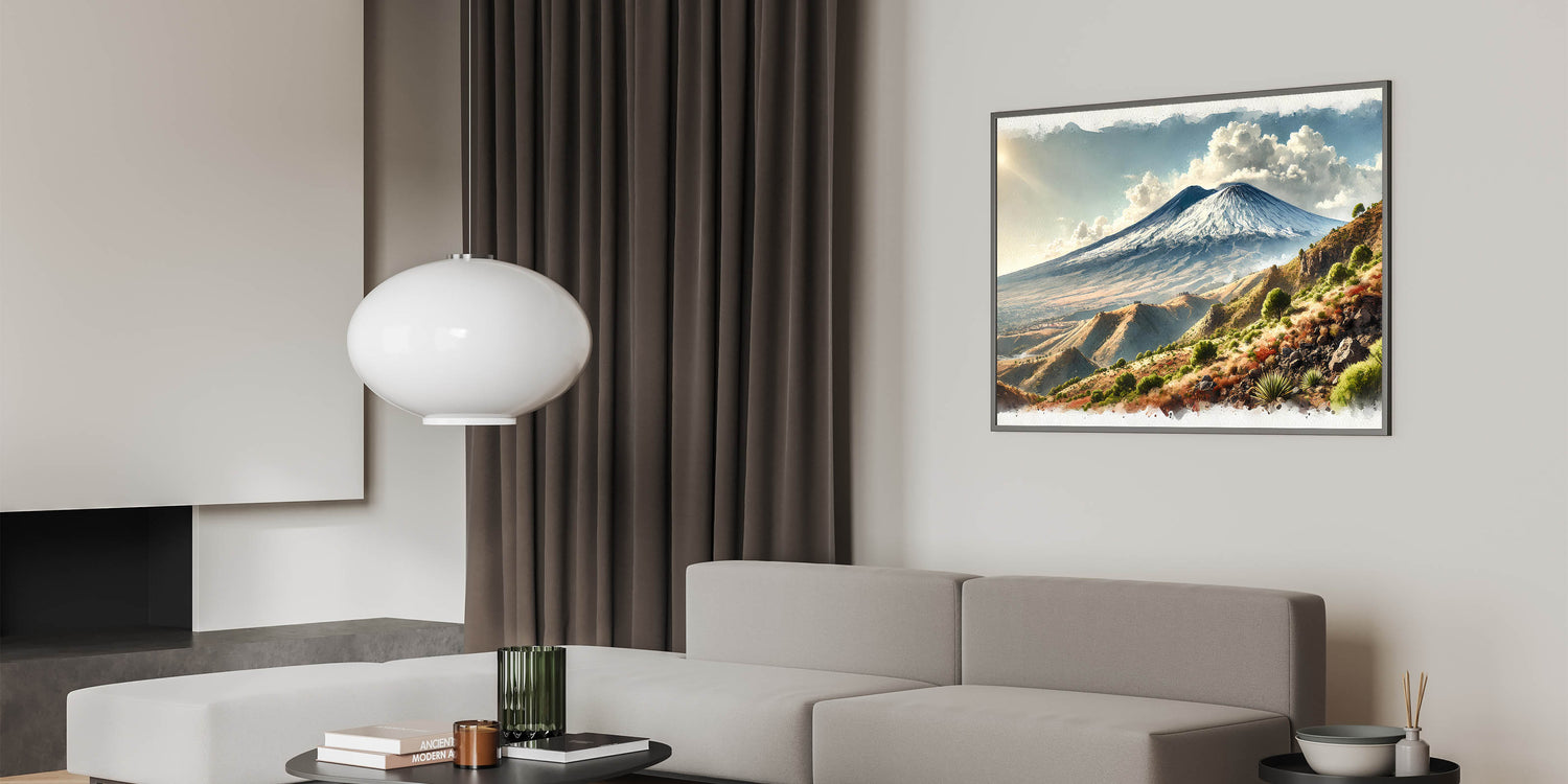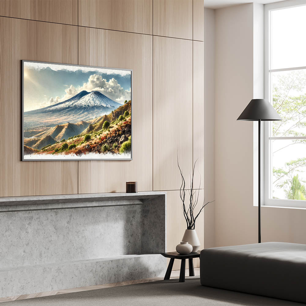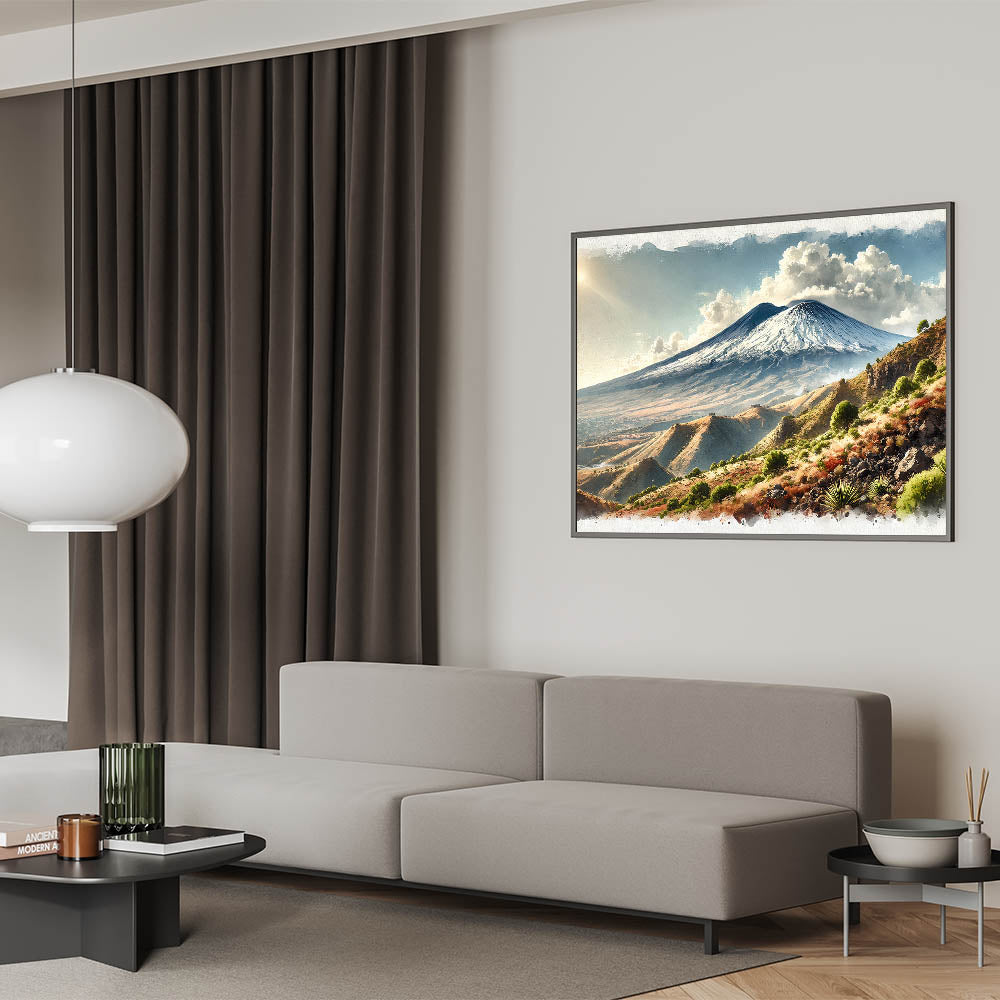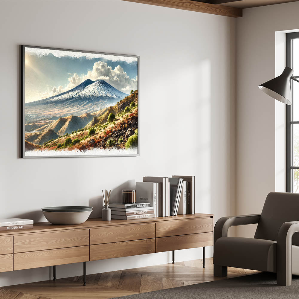 This serene Mount Etna landscape painting is perfect for creating a peaceful and calming ambiance in your space. Whether placed in a living room or study, it will bring a sense of the natural world into your home.