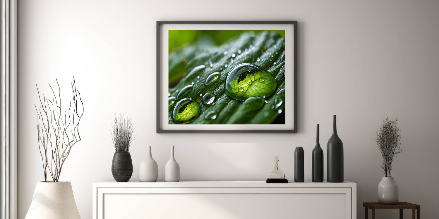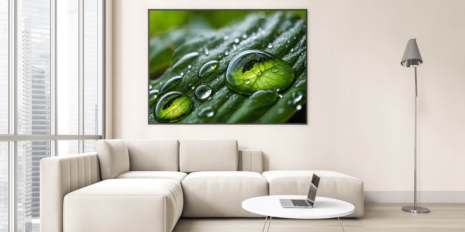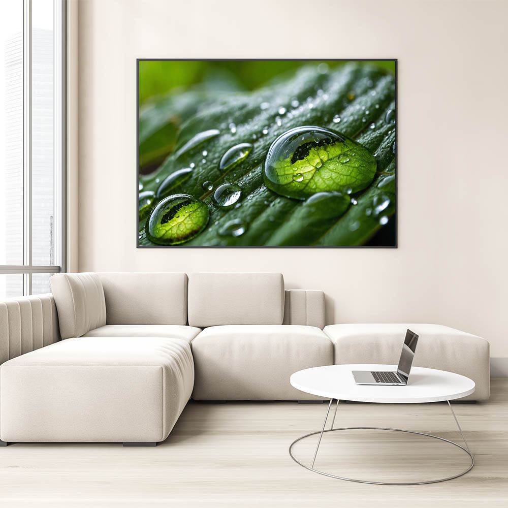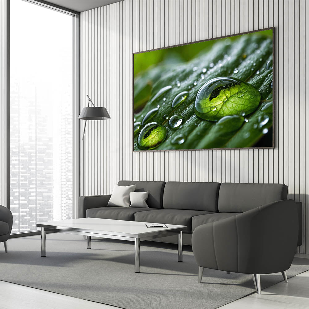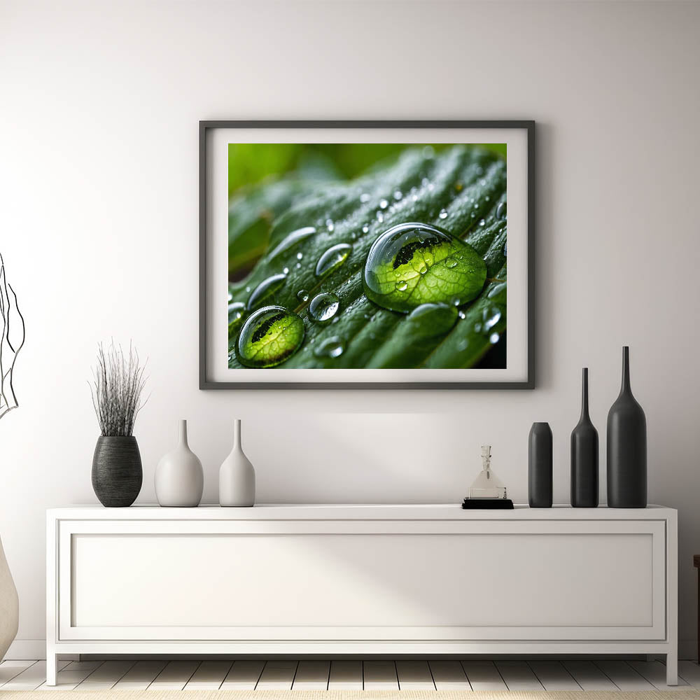 Add a touch of nature’s elegance to your decor with this beautiful water-inspired wall art. Featuring close-up photography of water droplets on a vibrant green leaf, this artwork captures the serenity and detail of nature in stunning clarity. The fresh greens and reflective water droplets bring a calming and refreshing element to any space, making it ideal for water-themed wall decor.