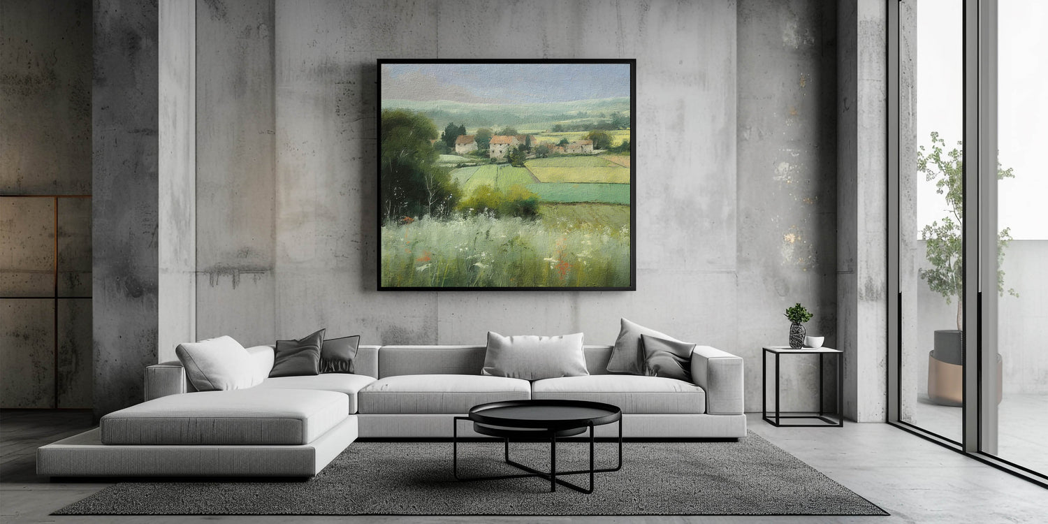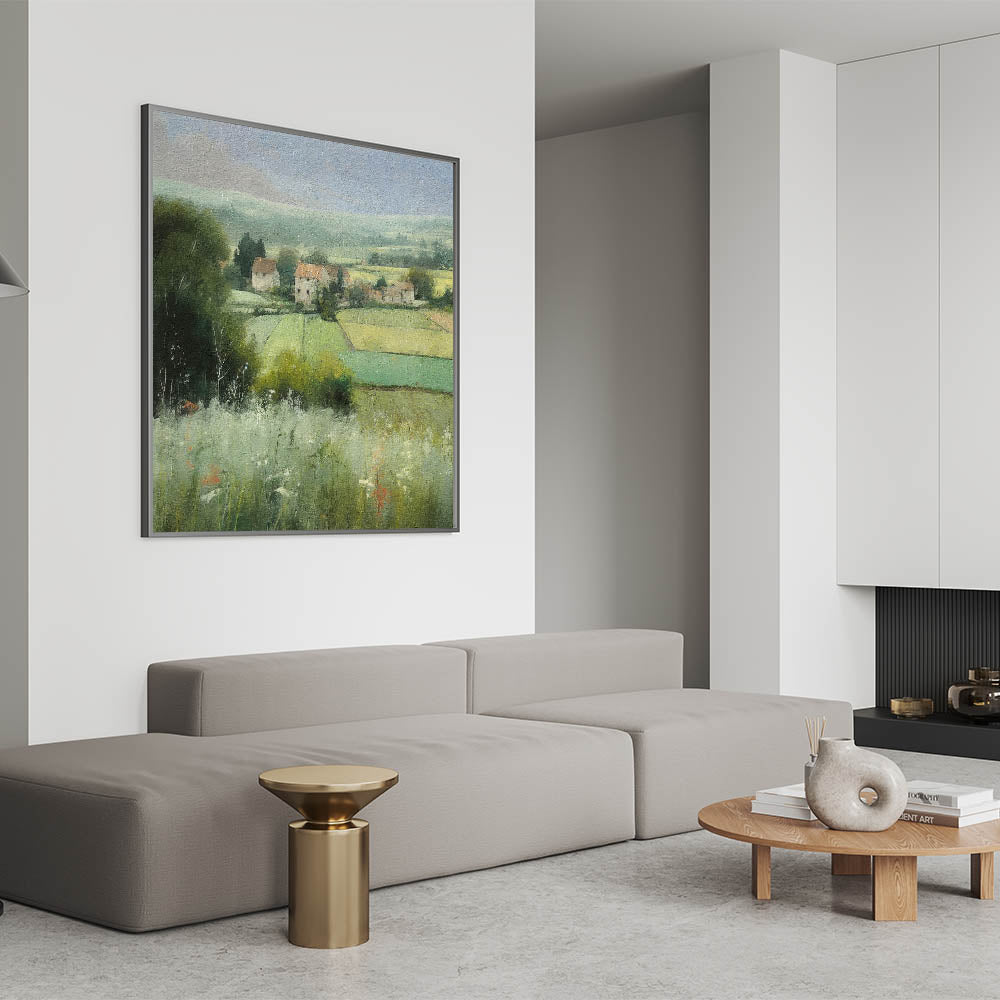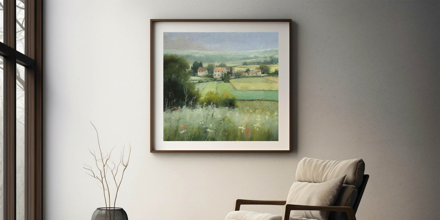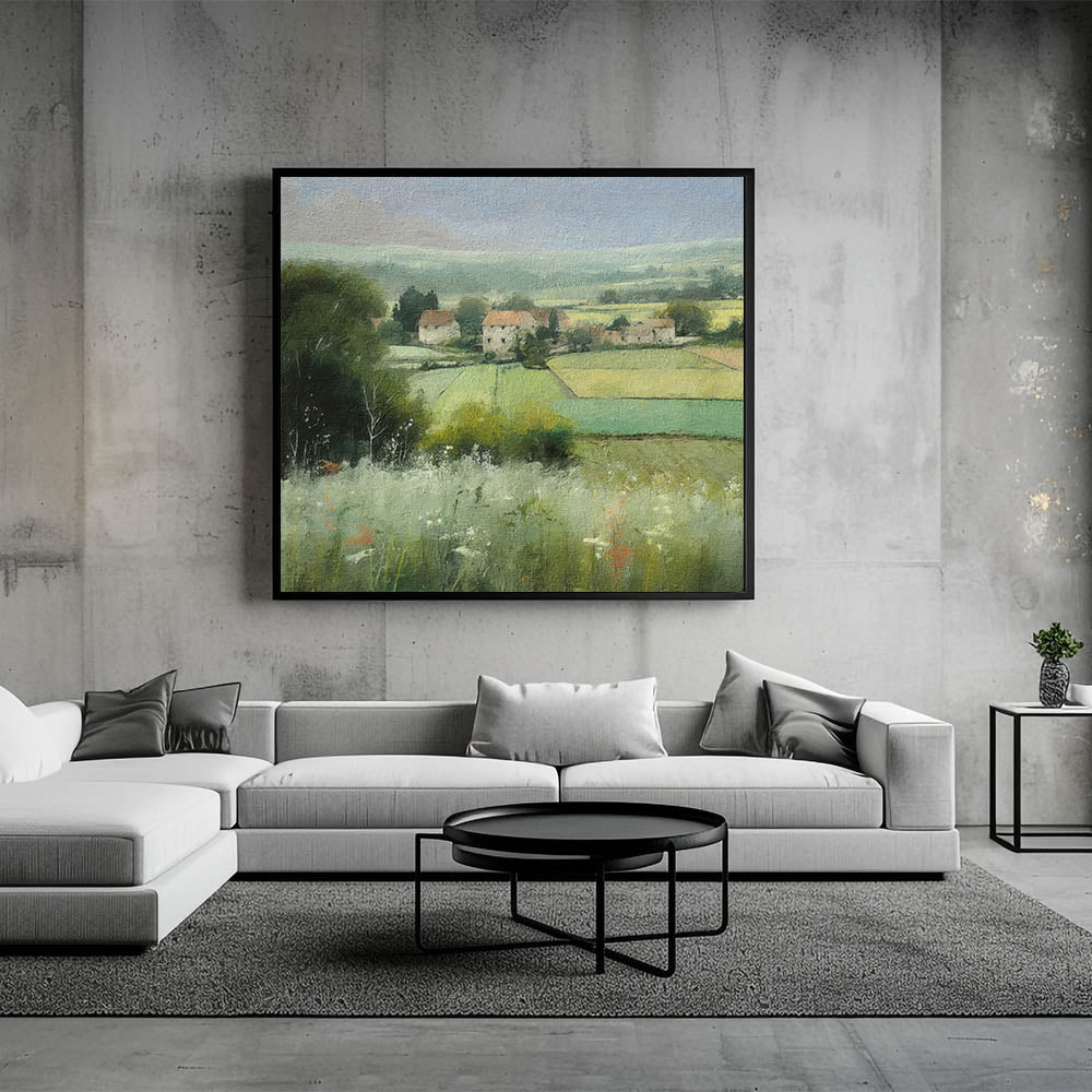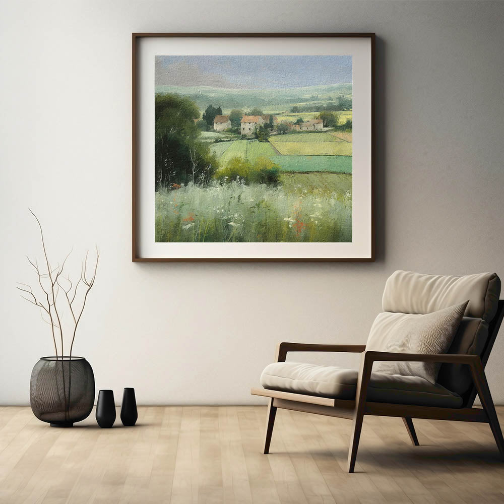 Transform your living space with this serene and captivating piece of countryside wall art. Featuring a peaceful rural landscape, this print brings the charm of the countryside into your home, making it perfect for those who love rustic farmhouse decor. The painting beautifully captures rolling fields and quaint houses, evoking the calm and tranquility of country life.