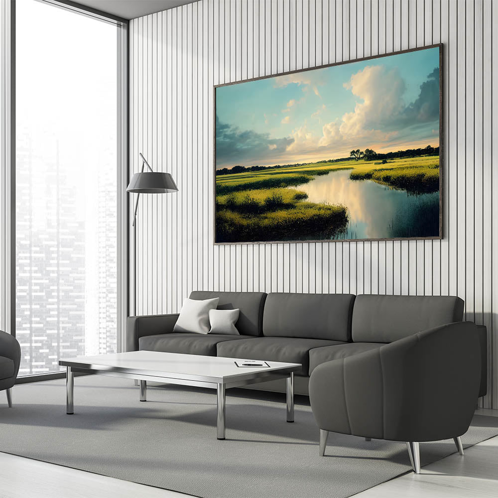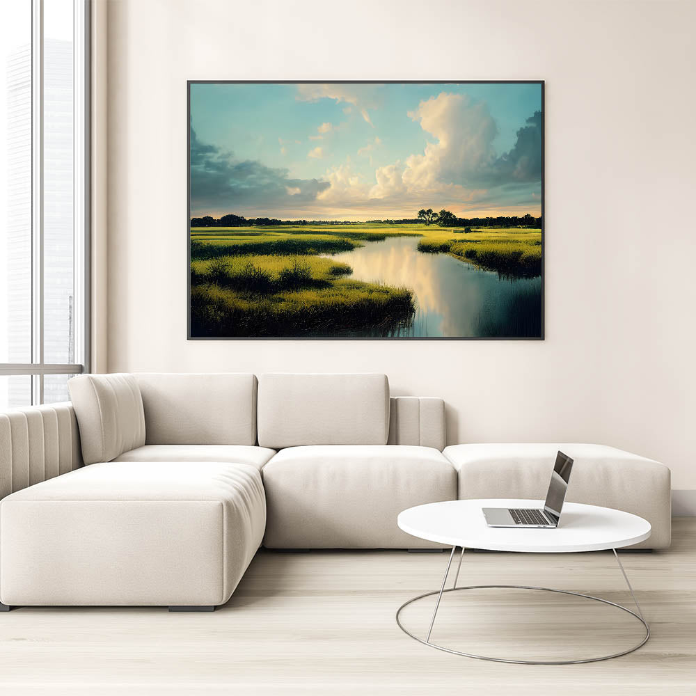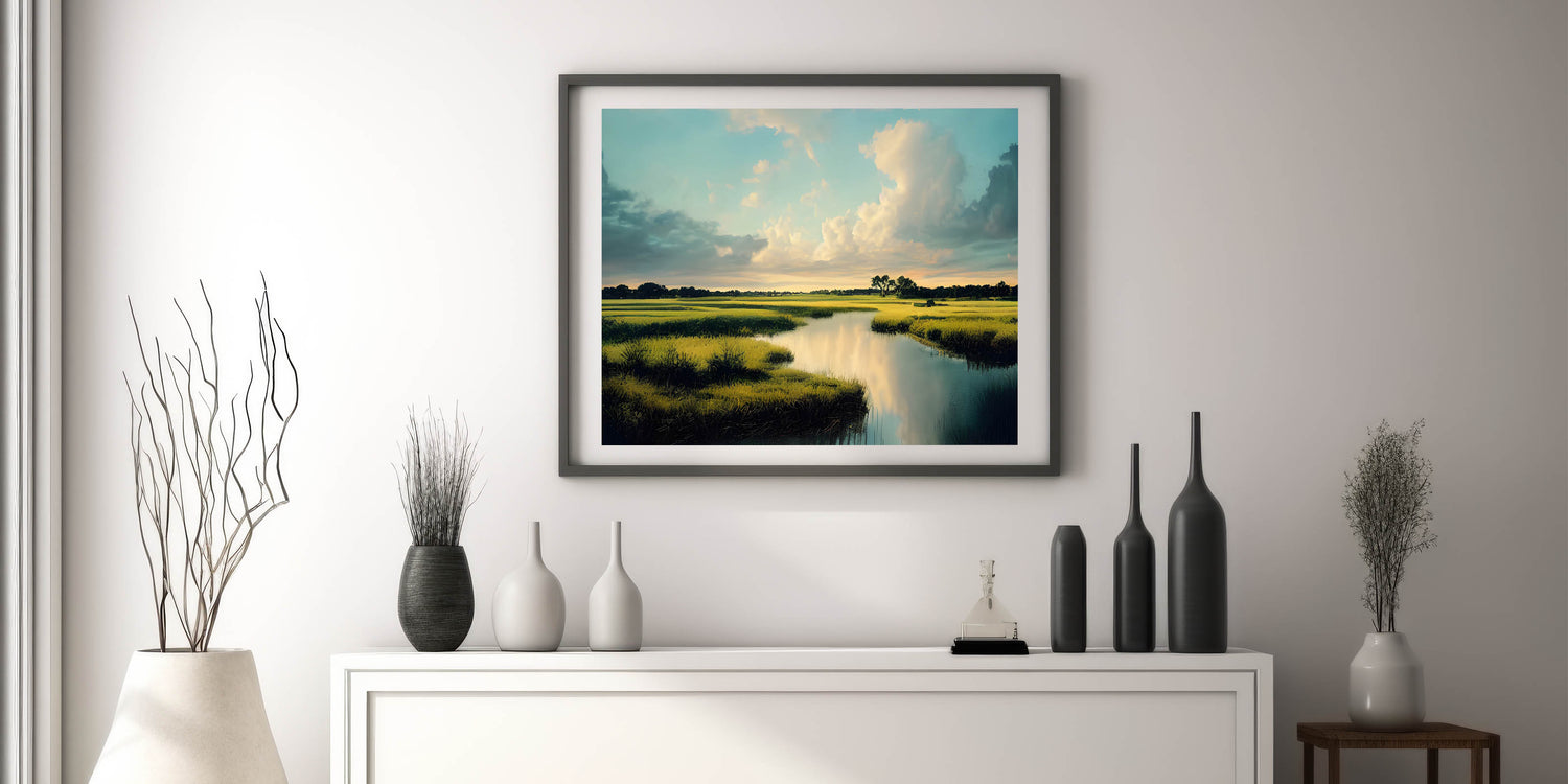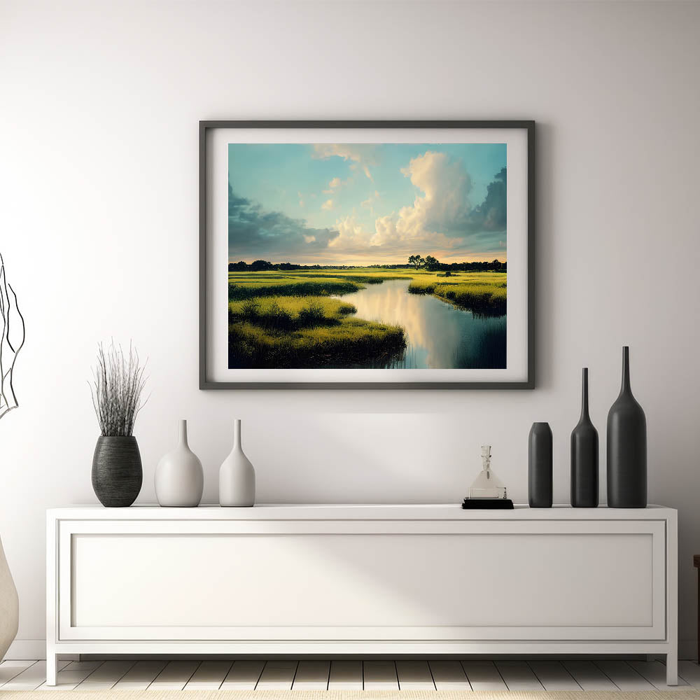 Bask in the serenity of this marsh and swamp wall art, featuring a tranquil marshland landscape under a vast, blue sky. The gentle clouds, mirrored in the still waters, create a peaceful and expansive scene, making this artwork an ideal addition for those seeking a calming and natural aesthetic in their home or office.