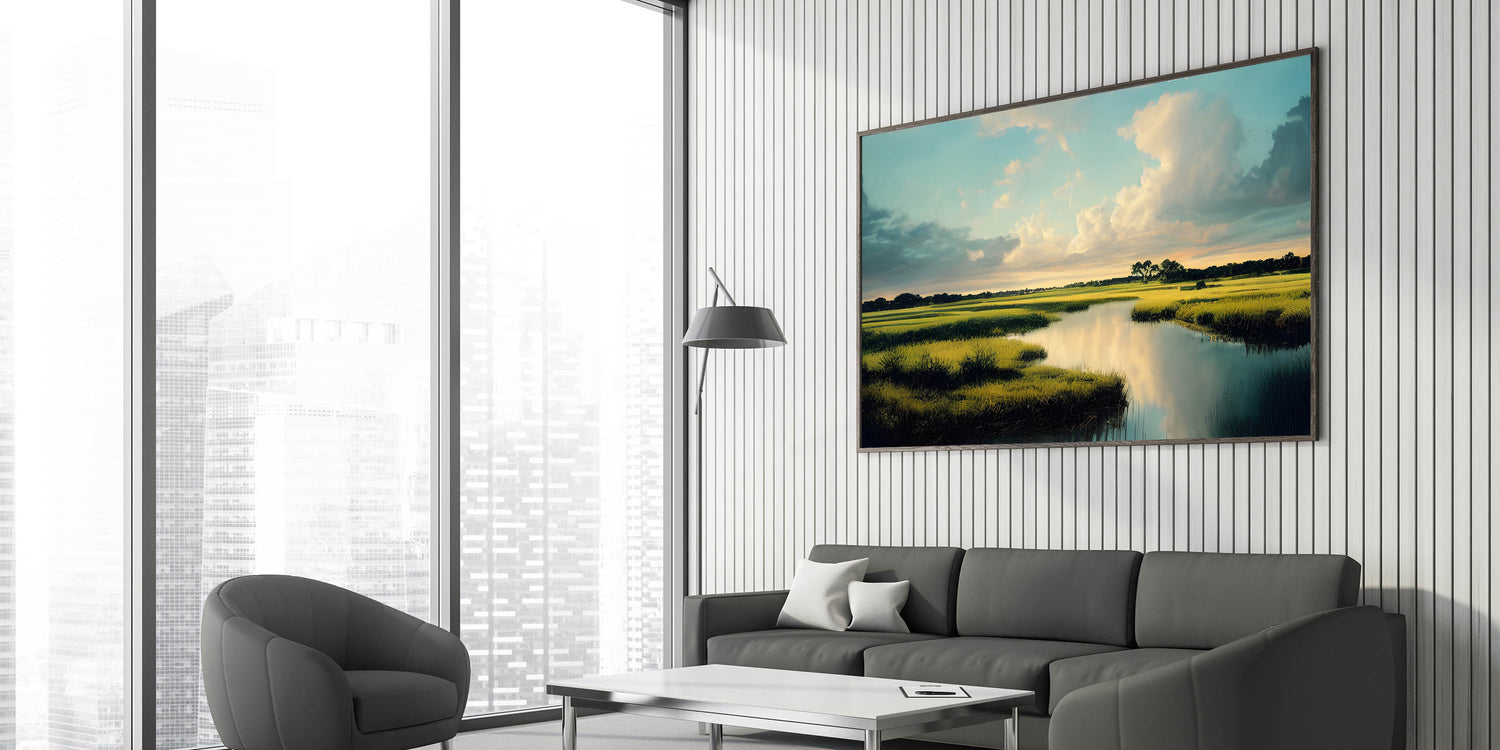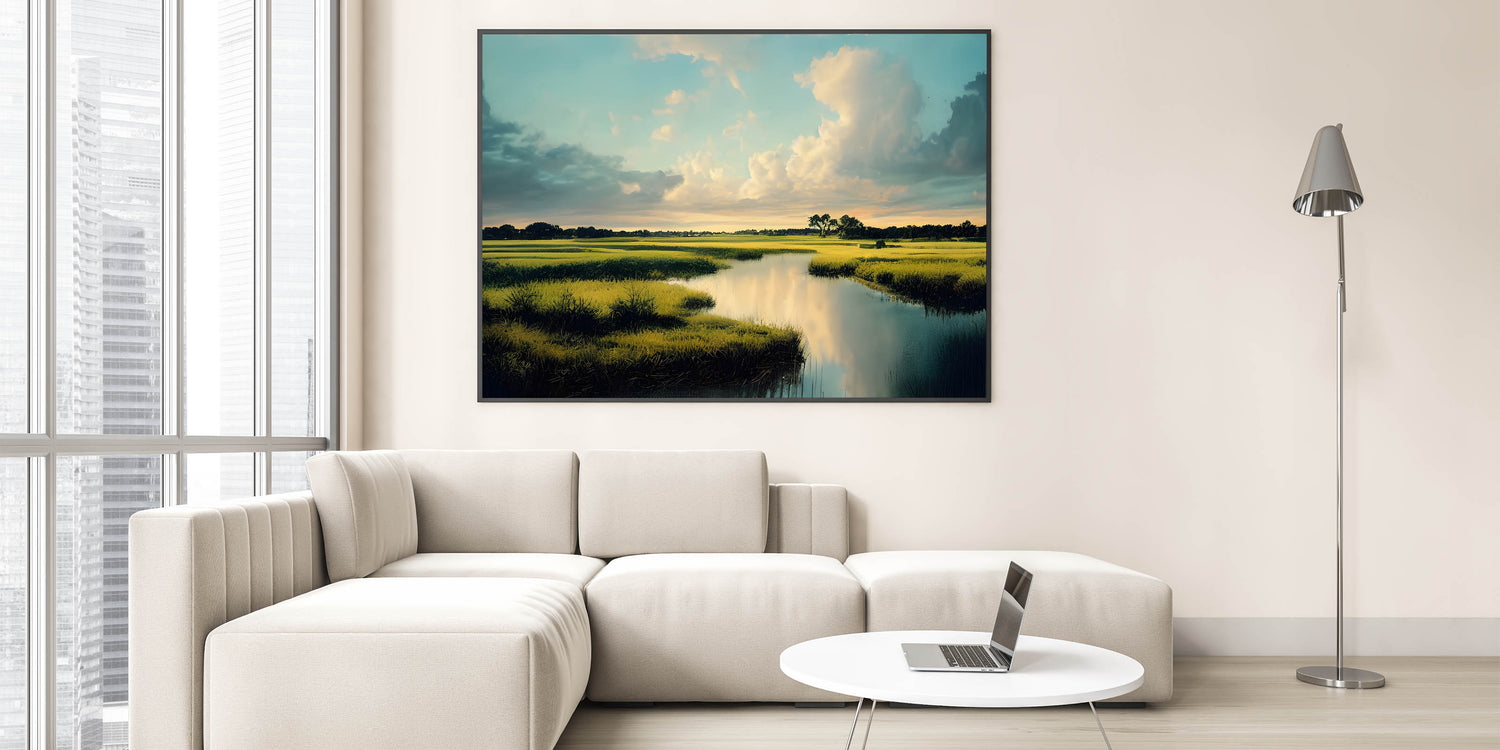 Enhance your living space with this serene marshland view, where the interplay of light and water creates a soothing and refreshing ambiance. Perfect for nature lovers and those looking to add a peaceful, expansive element to their decor. Discover our full collection of marsh and swamp wall art to find the perfect piece for your home.