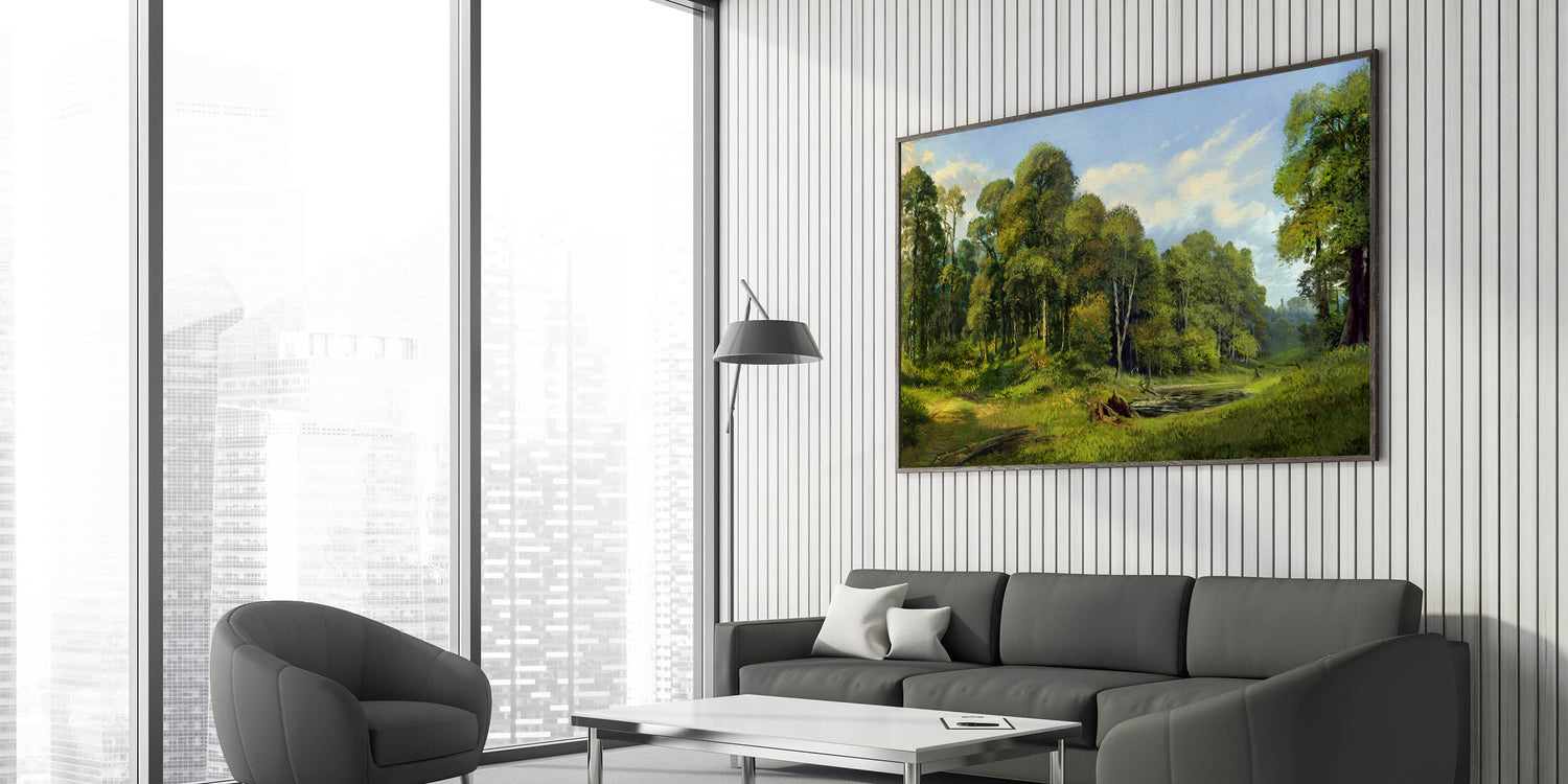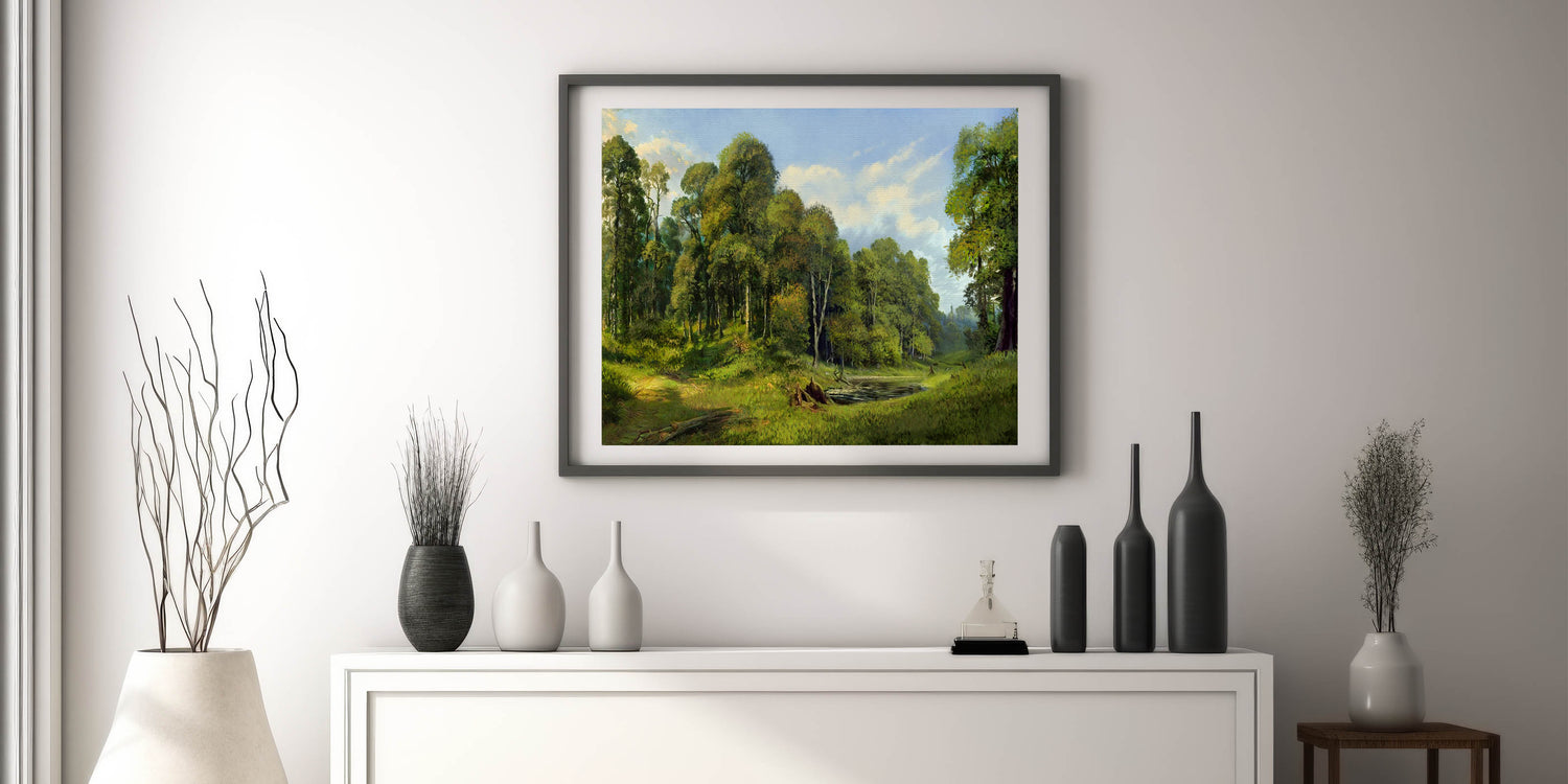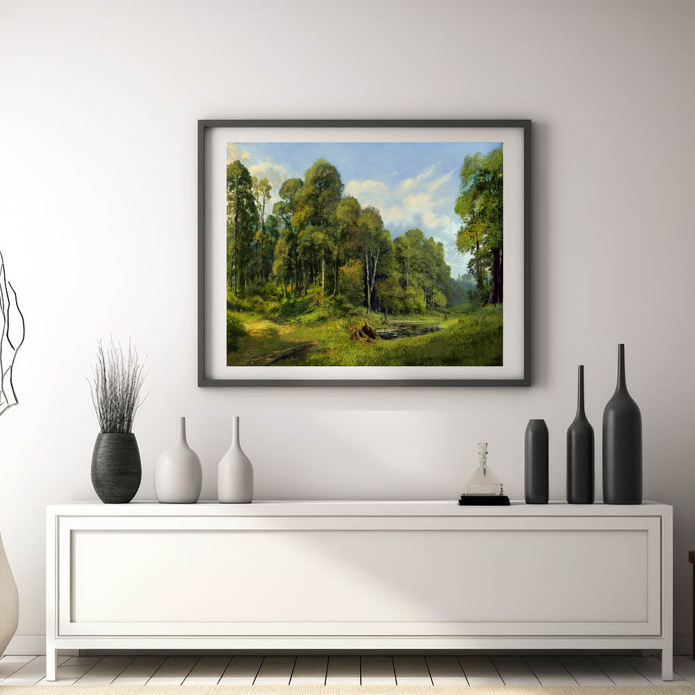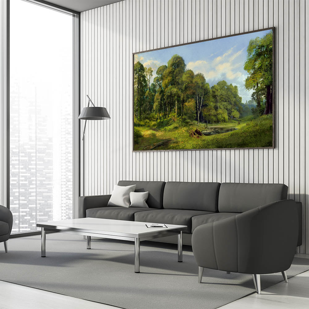 - Vivid Imagery: The lush green trees and the soft blue sky are rendered with stunning clarity, enhancing any room's decor.
