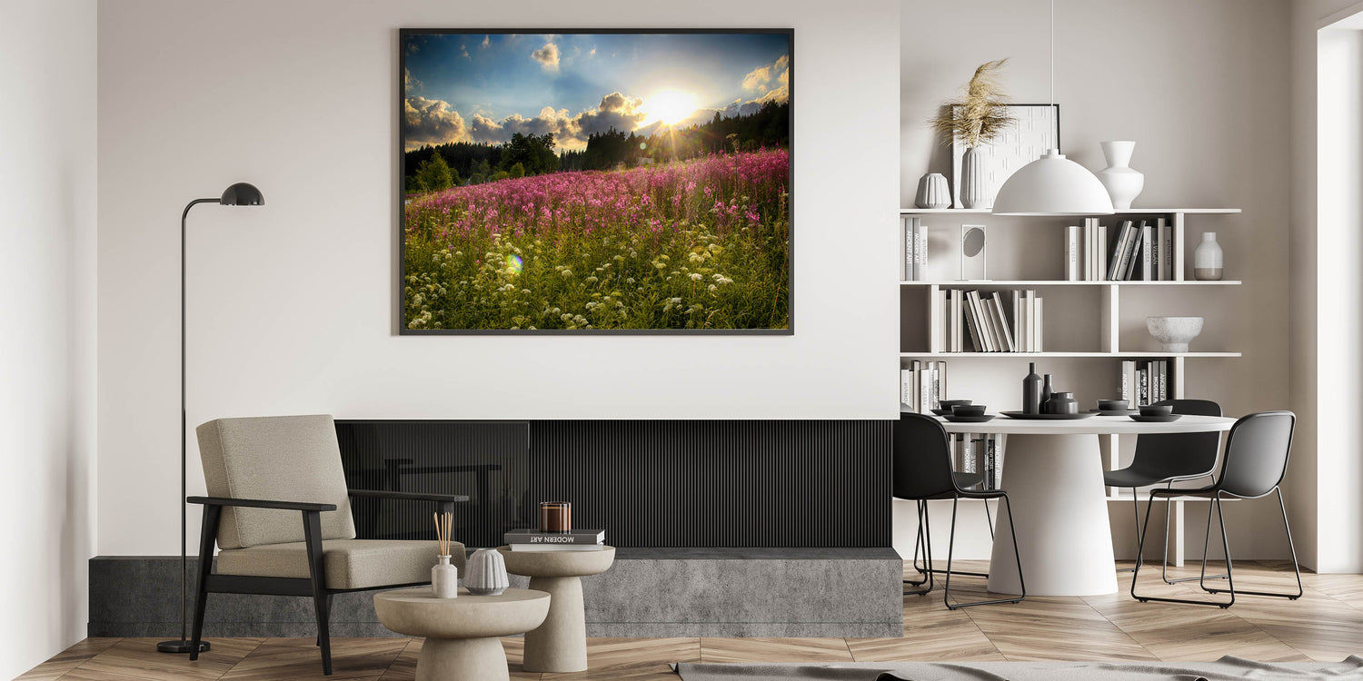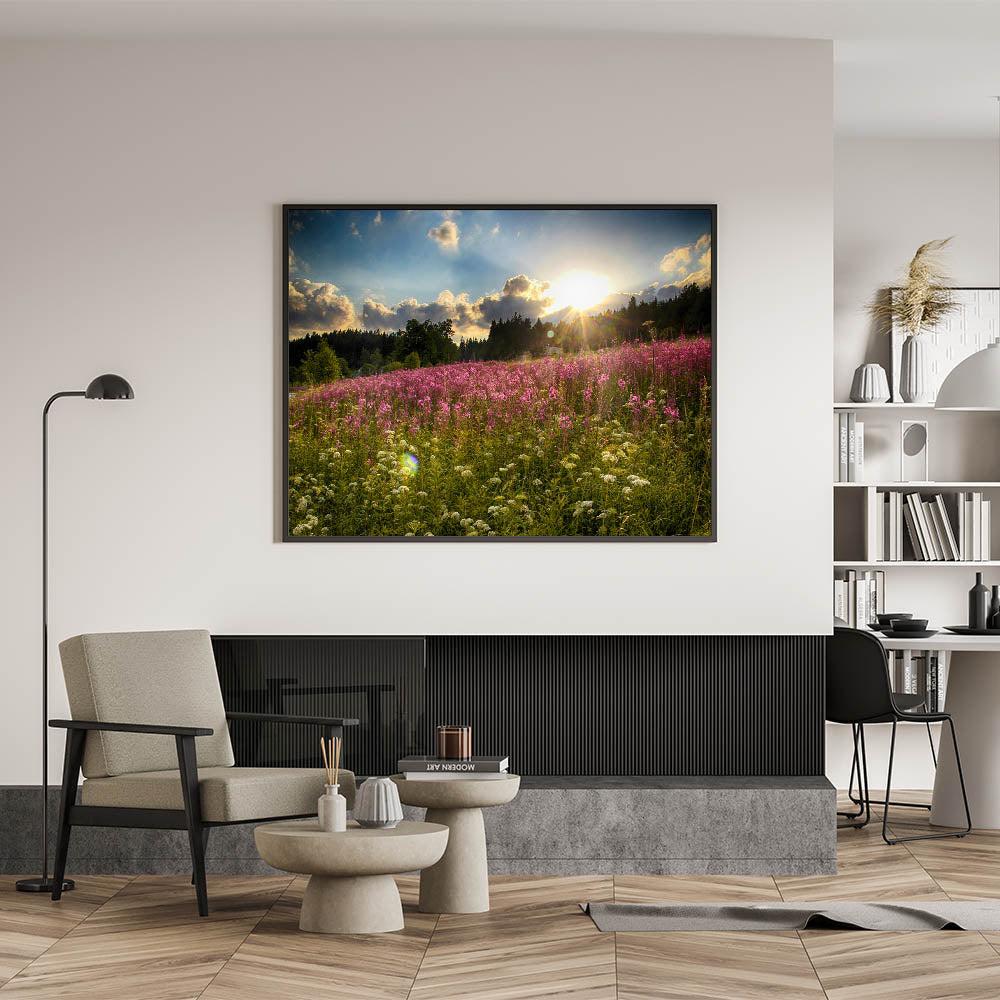 Capture the serene beauty of the Czech countryside with this stunning wall art featuring a sunlit flower field in full bloom. The golden rays of the setting sun cast a warm glow over the vibrant pink and white flowers, creating a peaceful and calming atmosphere. This piece perfectly captures the natural beauty of the Czech Republic, making it ideal for nature lovers and anyone looking to bring a touch of tranquility into their home.