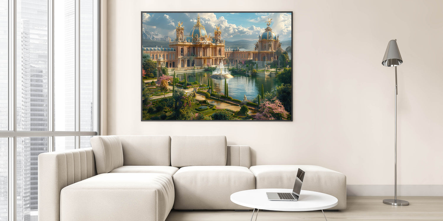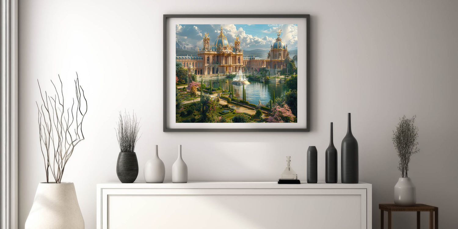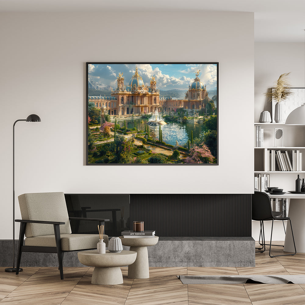 - Exquisite Detailing: The print showcases the intricate design of the palace, complemented by the vibrant gardens and water features, bringing the scene to life.