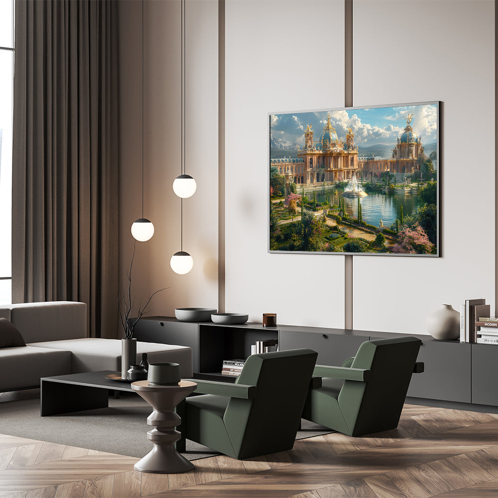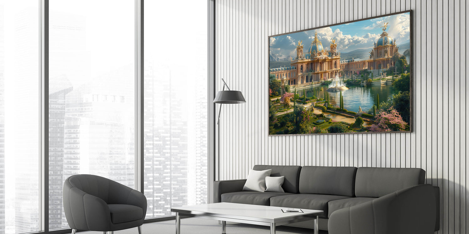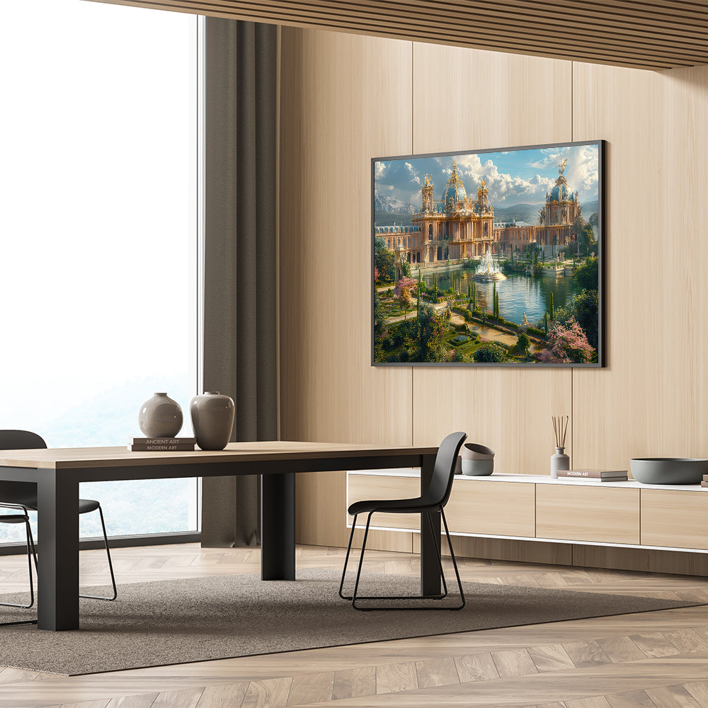 - Exquisite Detailing: The print showcases the intricate design of the palace, complemented by the vibrant gardens and water features, bringing the scene to life.