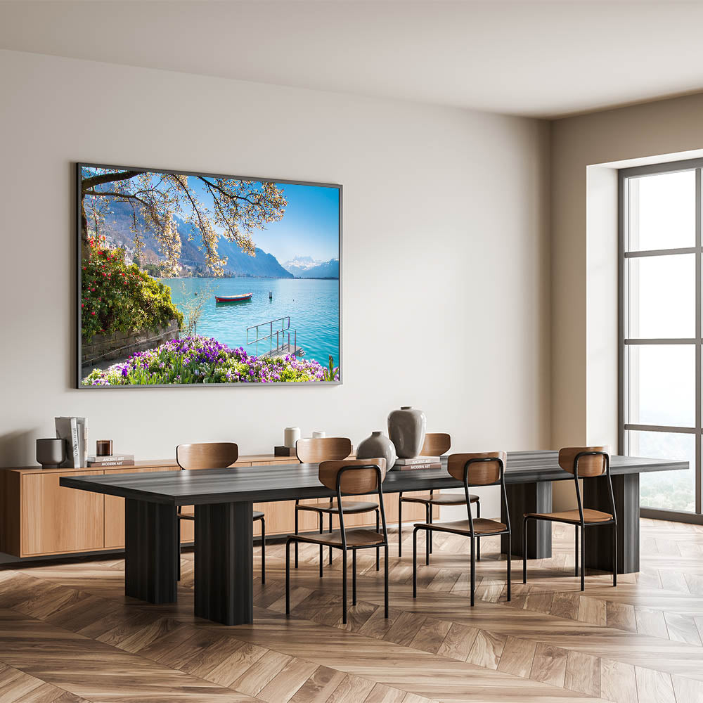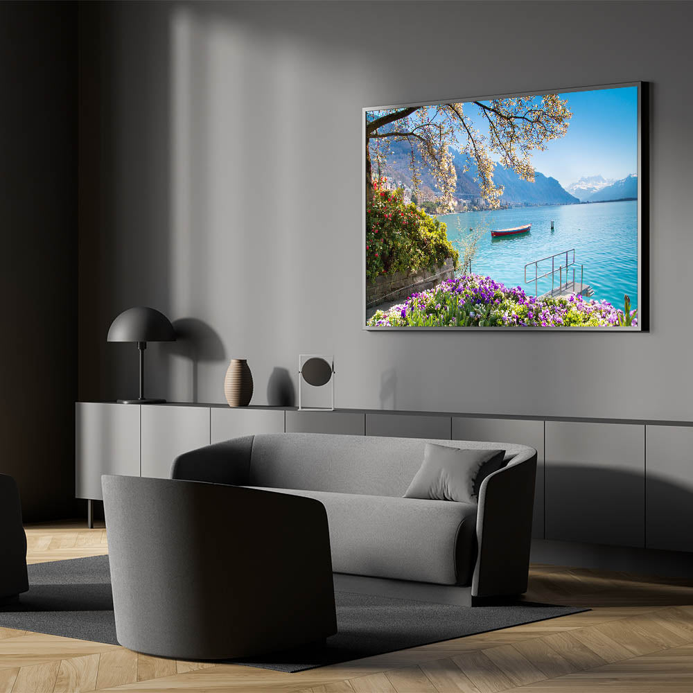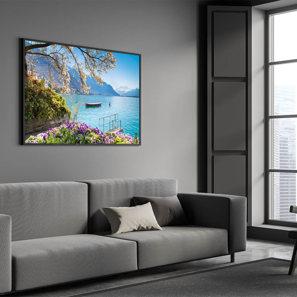 Transport yourself to the tranquil beauty of Switzerland with this stunning lakeside scenery wall art. This piece captures a vibrant spring day by the lake, framed by lush flowers and majestic mountains in the background. The crystal-clear waters and the quaint boat add a touch of serenity, making it a perfect piece to bring a sense of peace to any room.