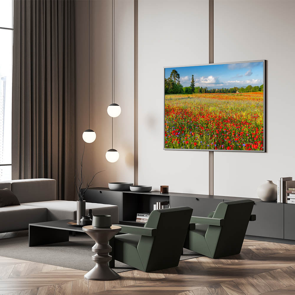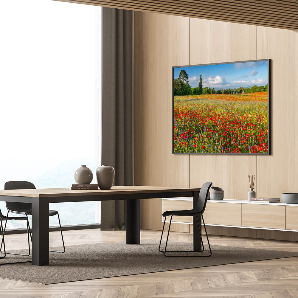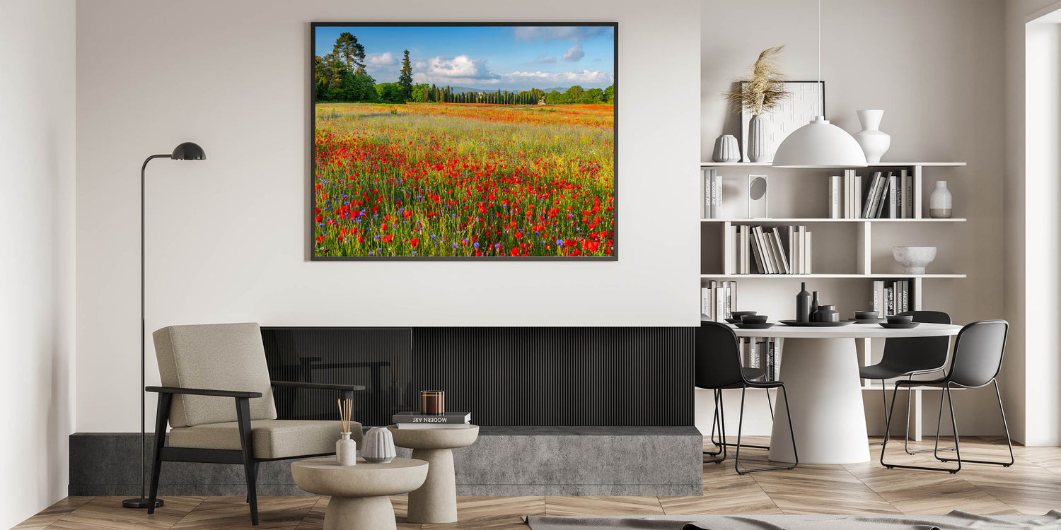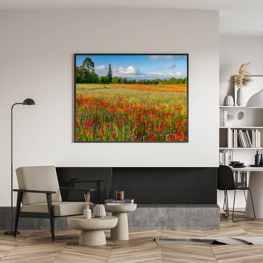 Embrace the vibrant beauty of the Tuscan countryside with this Tuscany wall art. Featuring a stunning field of colorful flowers in full bloom, framed by iconic cypress trees, this Tuscan landscape print captures the essence of a peaceful Italian spring. The rich reds, greens, and blues make this Italy scenery art a perfect choice for anyone looking to brighten their space with the natural beauty of Tuscany. Ideal for living rooms, bedrooms, or offices, this piece brings the vibrant charm of Italy into any home.