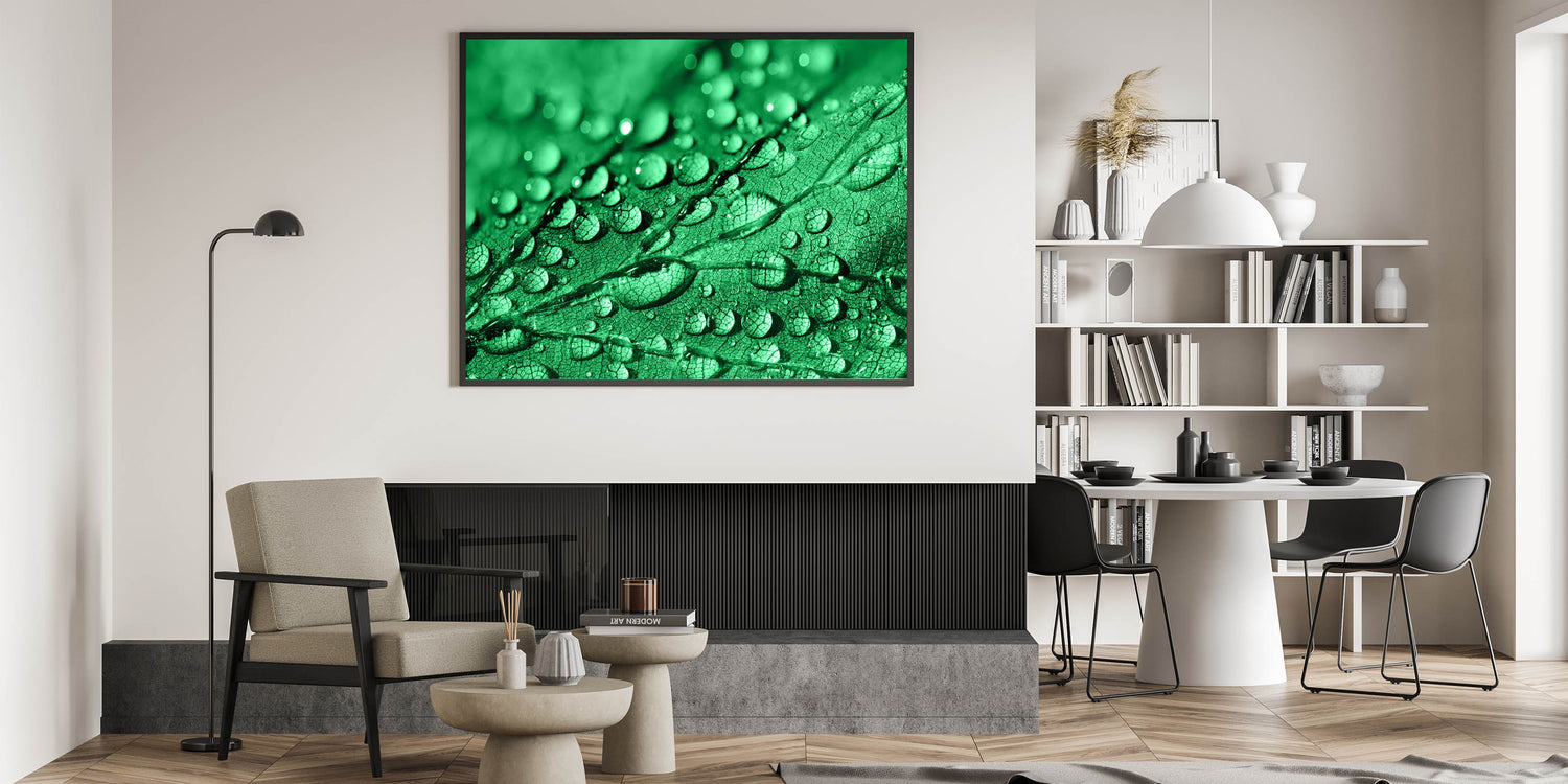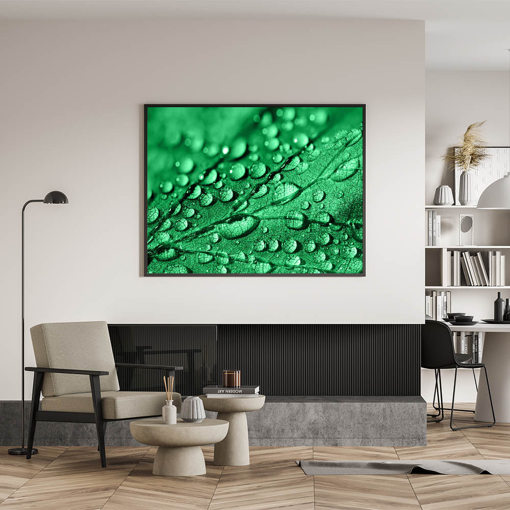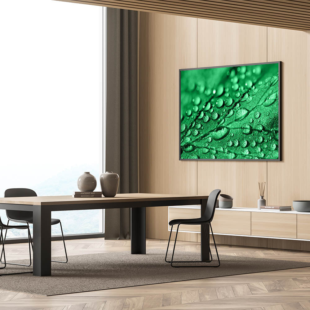 This piece of high-quality water-inspired art adds a refreshing touch of nature to your decor. The vibrant green tones combined with the delicate water droplets make this artwork a focal point for those who appreciate the beauty of nature's details.