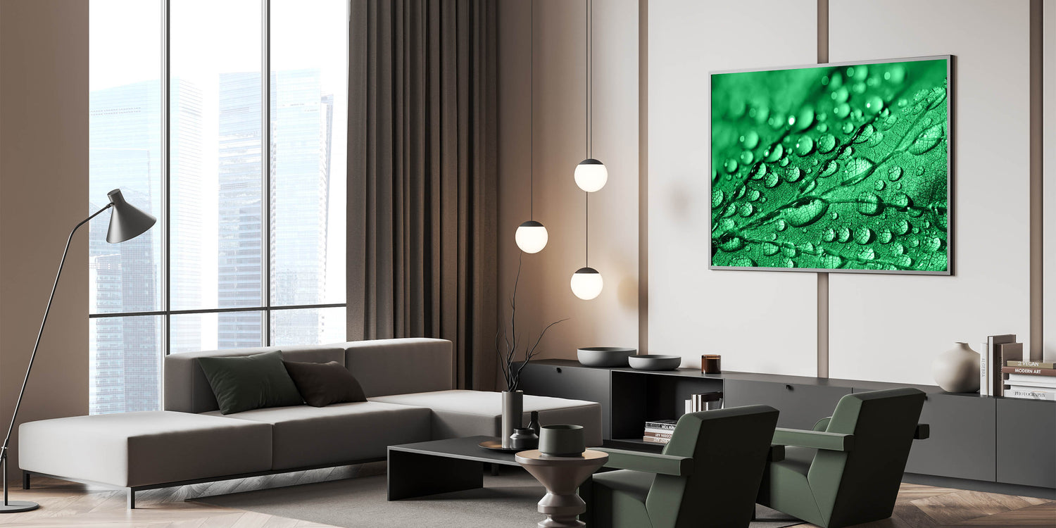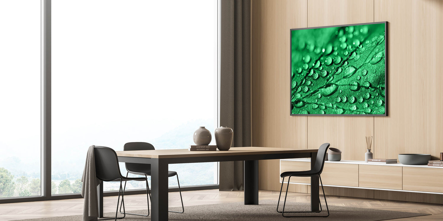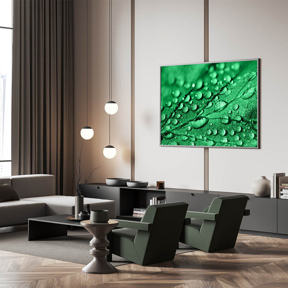 This piece of high-quality water-inspired art adds a refreshing touch of nature to your decor. The vibrant green tones combined with the delicate water droplets make this artwork a focal point for those who appreciate the beauty of nature's details.