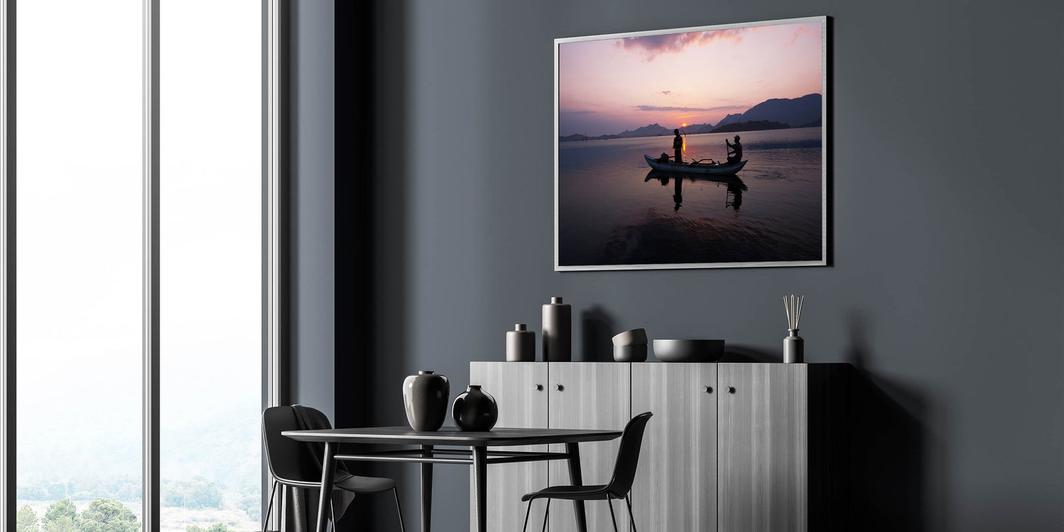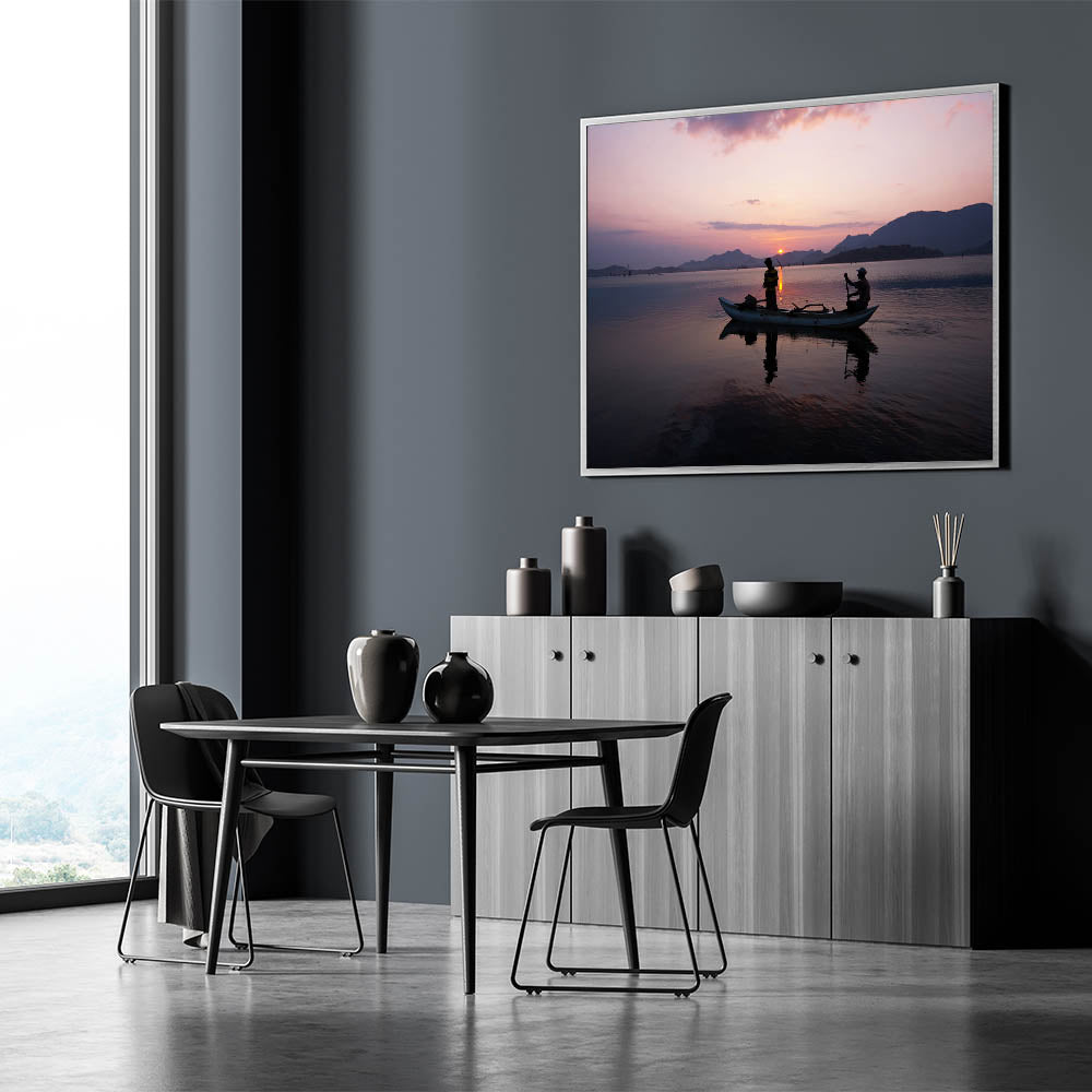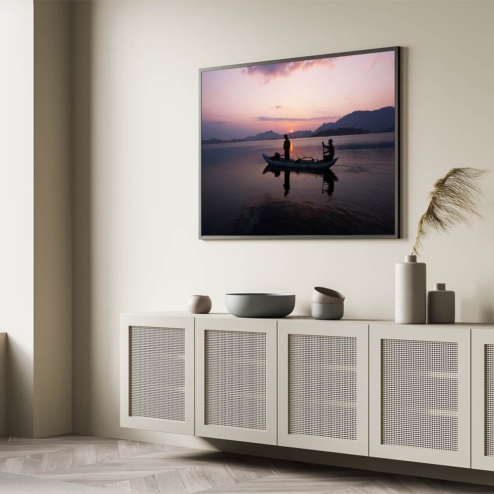 Immerse yourself in the captivating beauty of Sri Lanka with this breathtaking wall art depicting a serene lake at sunset, complete with local fishermen on a traditional boat. This stunning Sri Lanka wall art captures the essence of authentic Sri Lankan scenery, bringing a touch of tropical tranquility to your space.