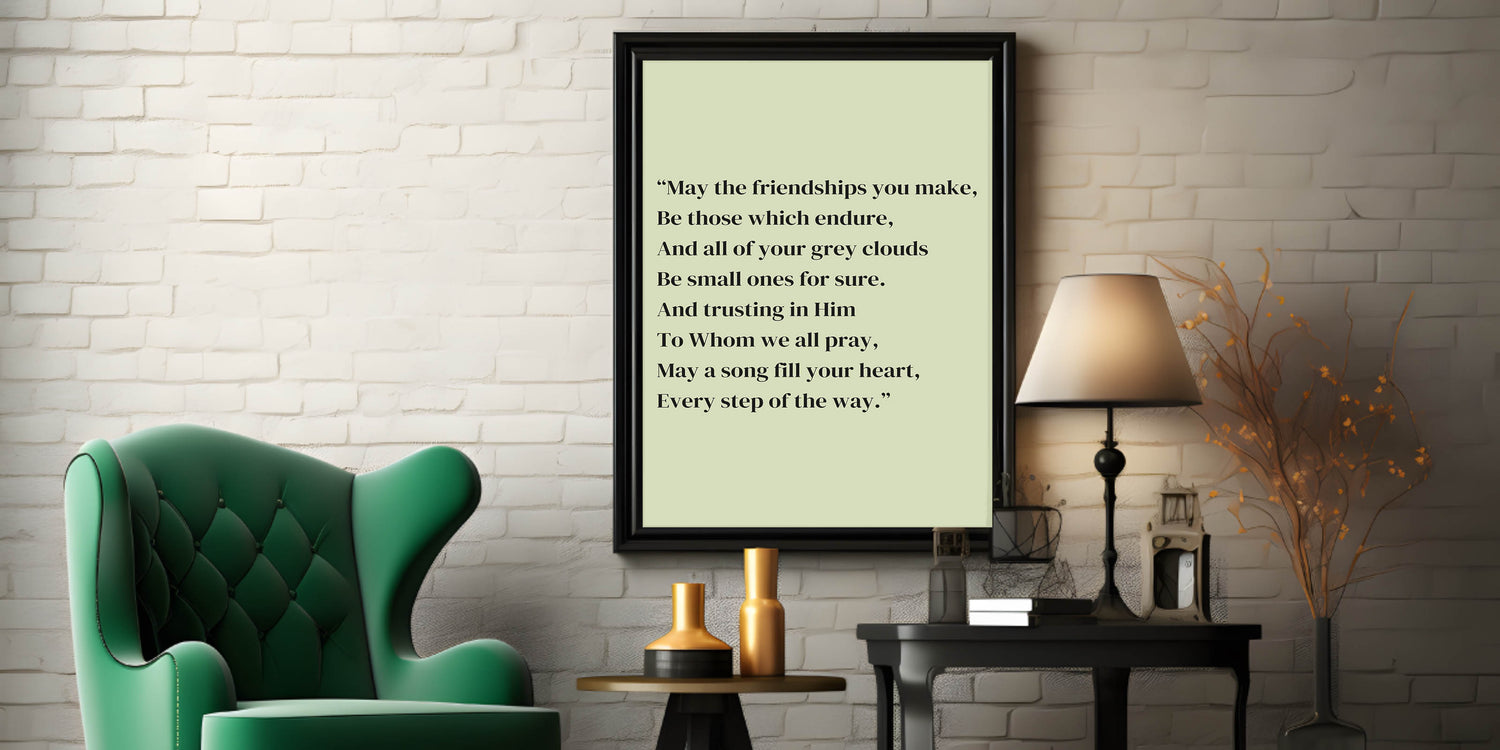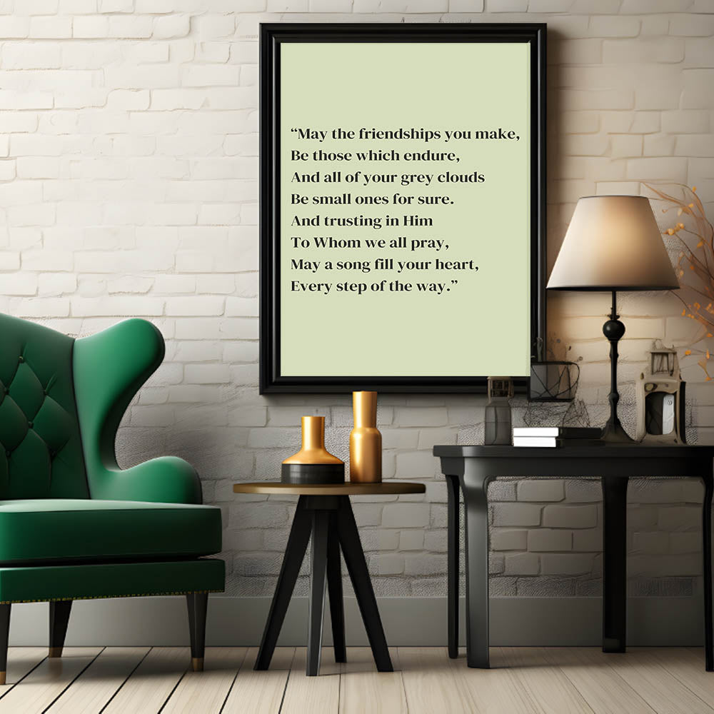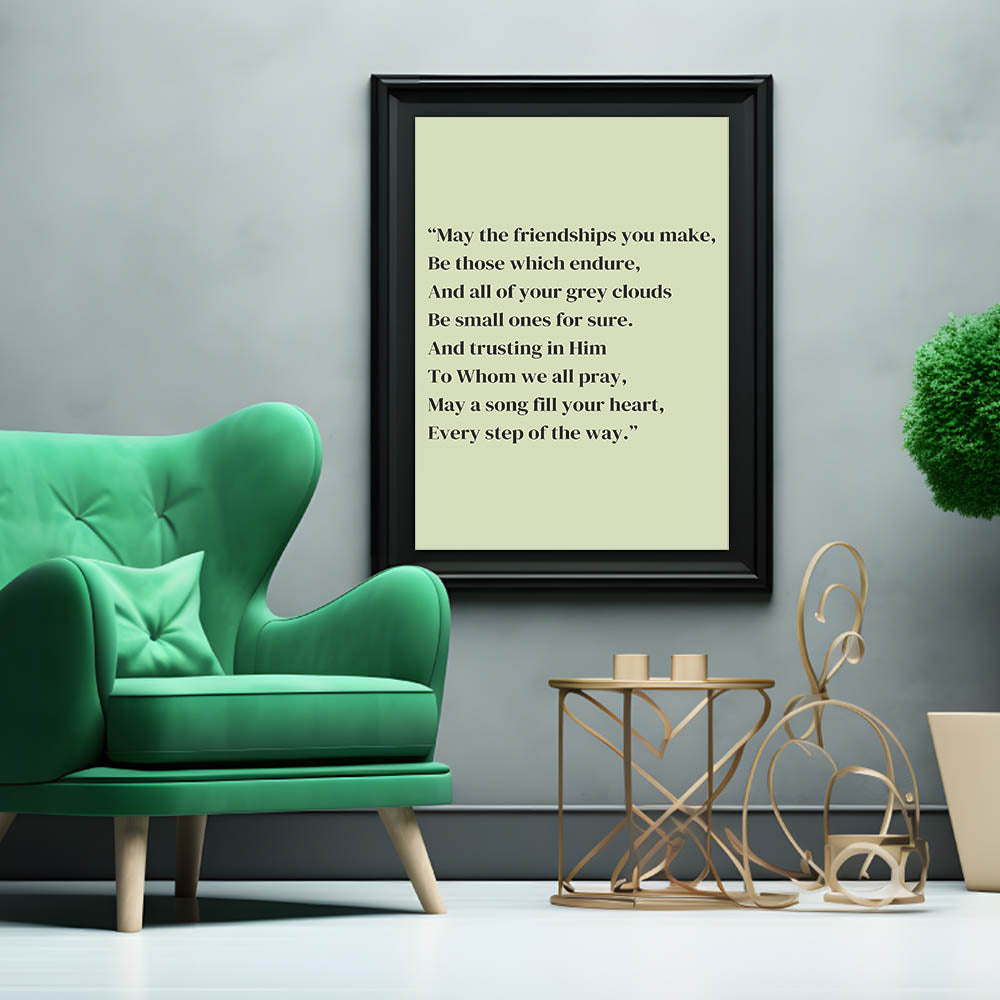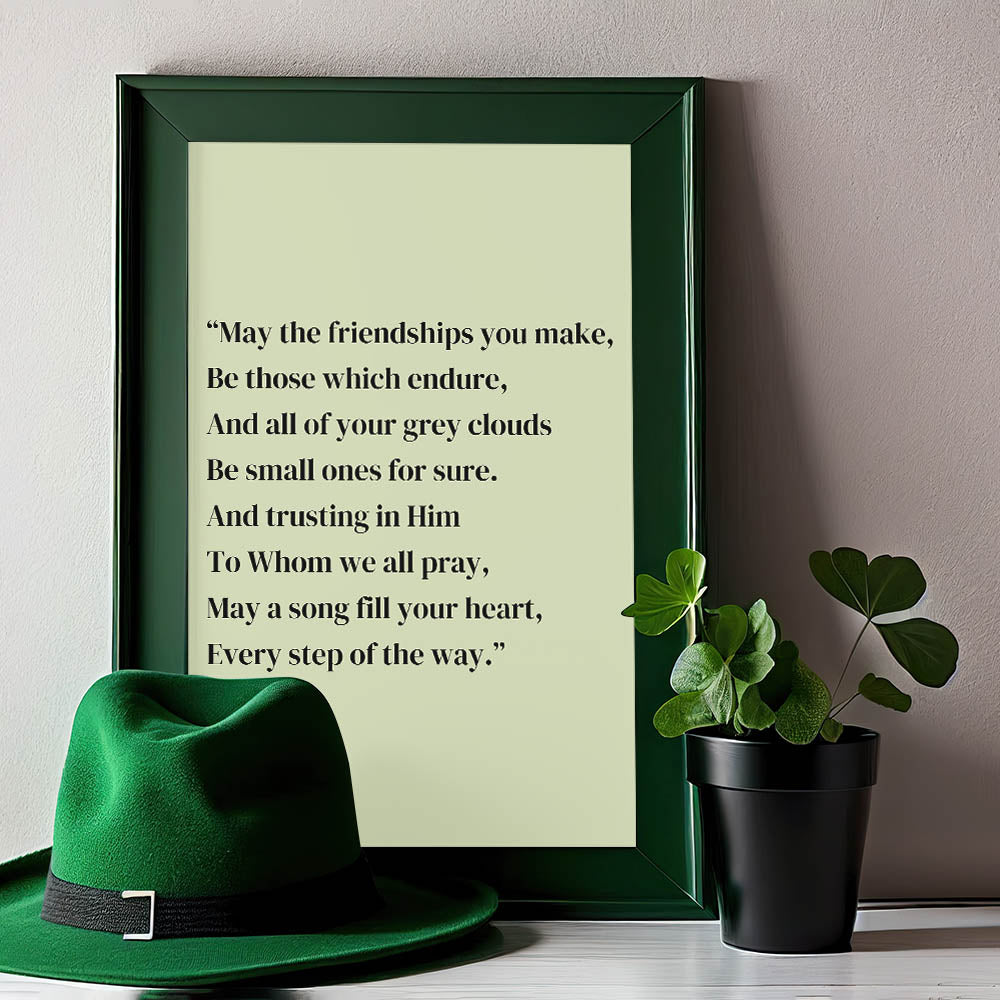 Celebrate the beauty of Irish traditions with this St. Patrick’s Day wall art, featuring a heartfelt Irish blessing. This elegant design showcases a traditional Celtic-inspired poem, offering warmth, friendship, and faith. Set against a soft green background with bold typography, this Irish wall art piece is a timeless symbol of luck, love, and spirituality.