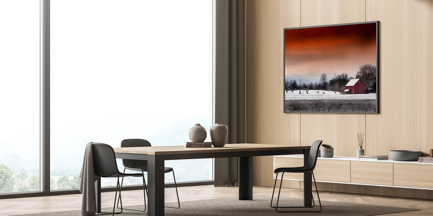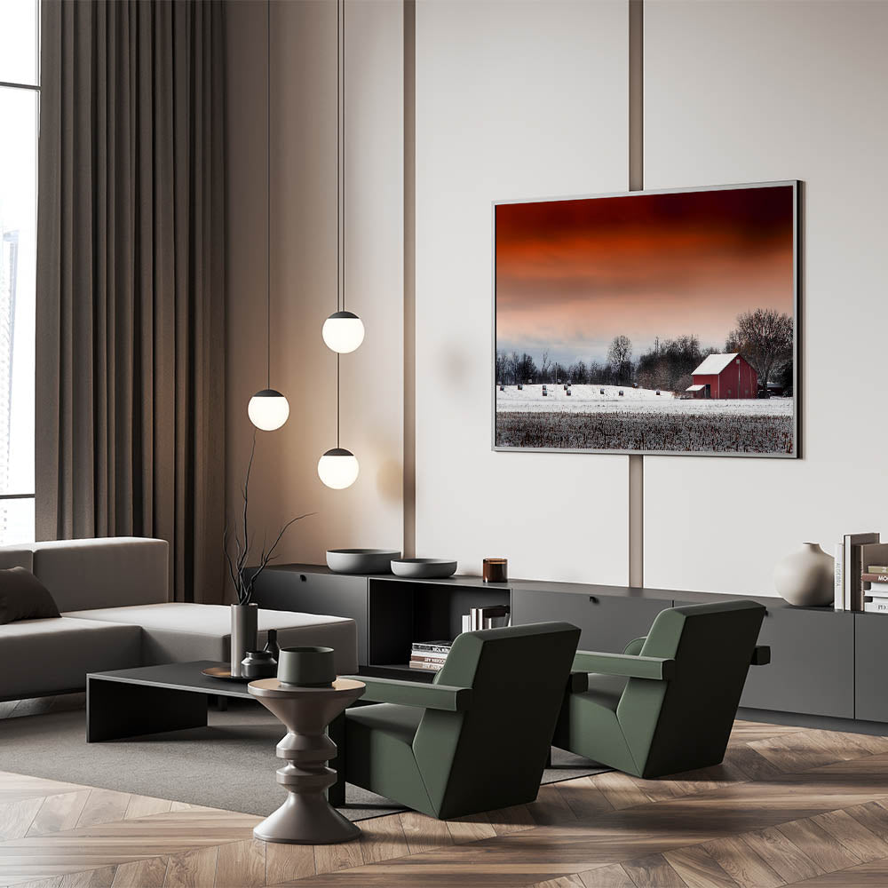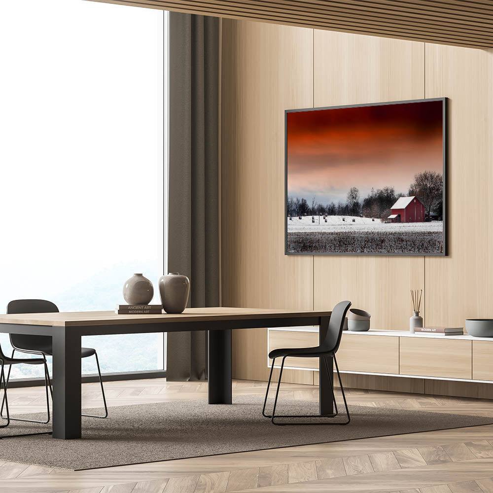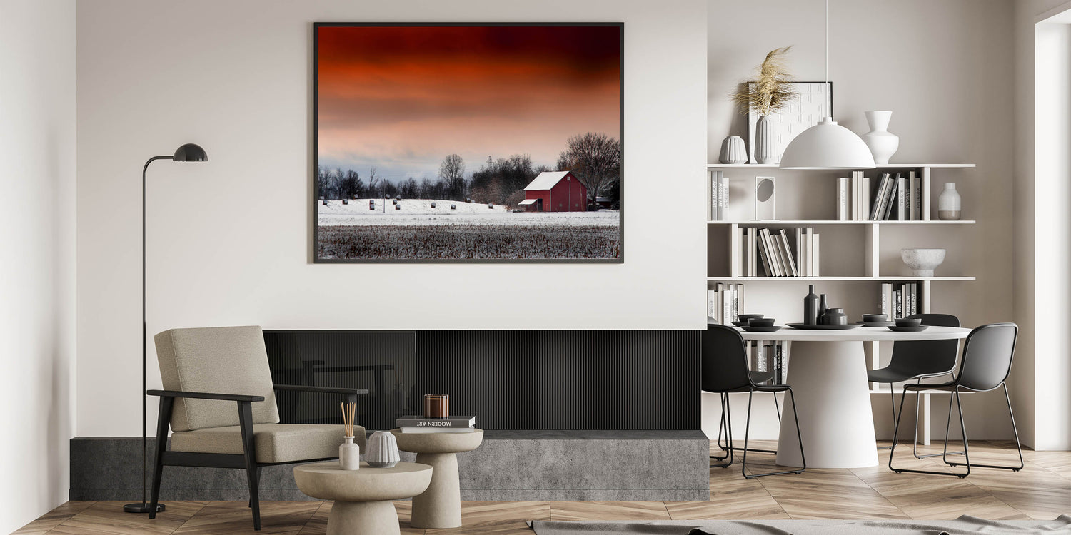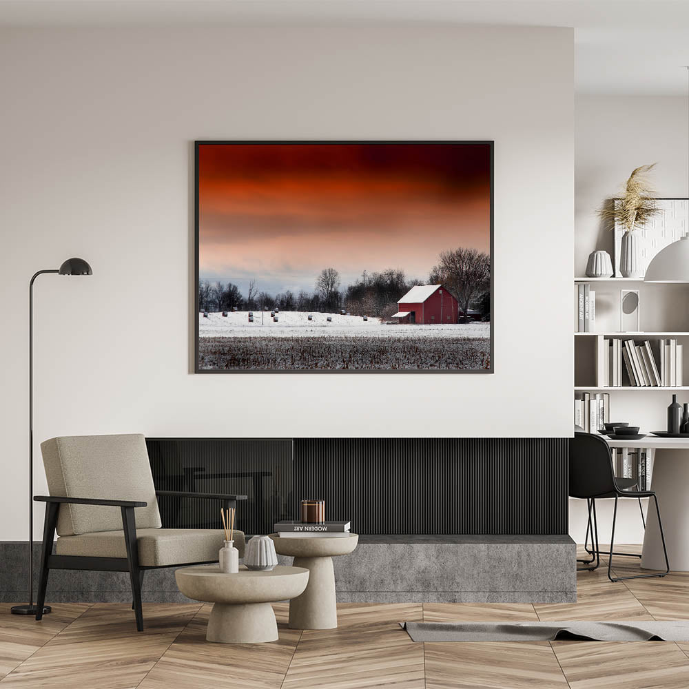 Add a touch of Scandinavian charm to your living space with this stunning wall art showcasing a tranquil winter scene from Stockholm. The vivid red barn stands in contrast against a snowy landscape, beneath a rich, orange-hued sky, creating a perfect blend of warmth and coolness. This Stockholm wall art beautifully captures the serenity of rural Sweden and is available in a variety of formats to suit any decor style.