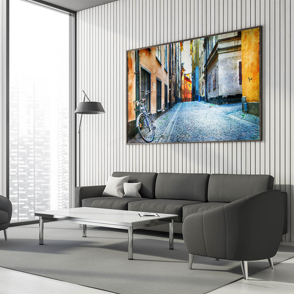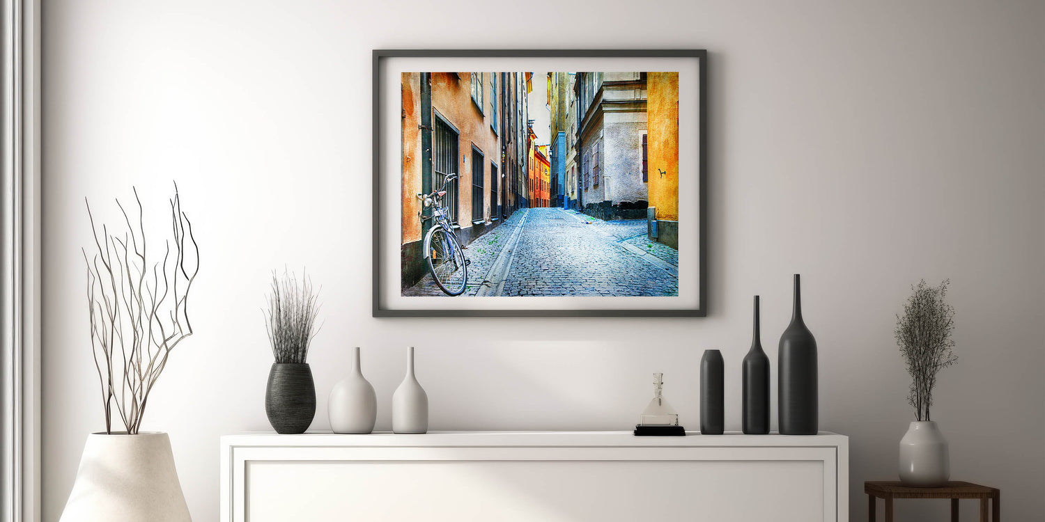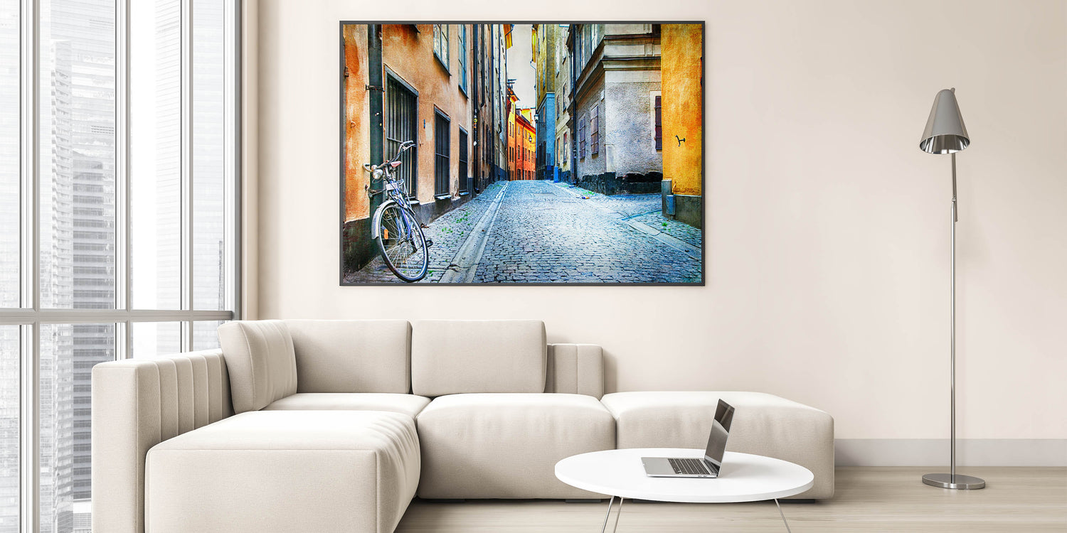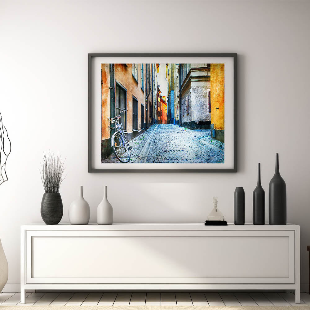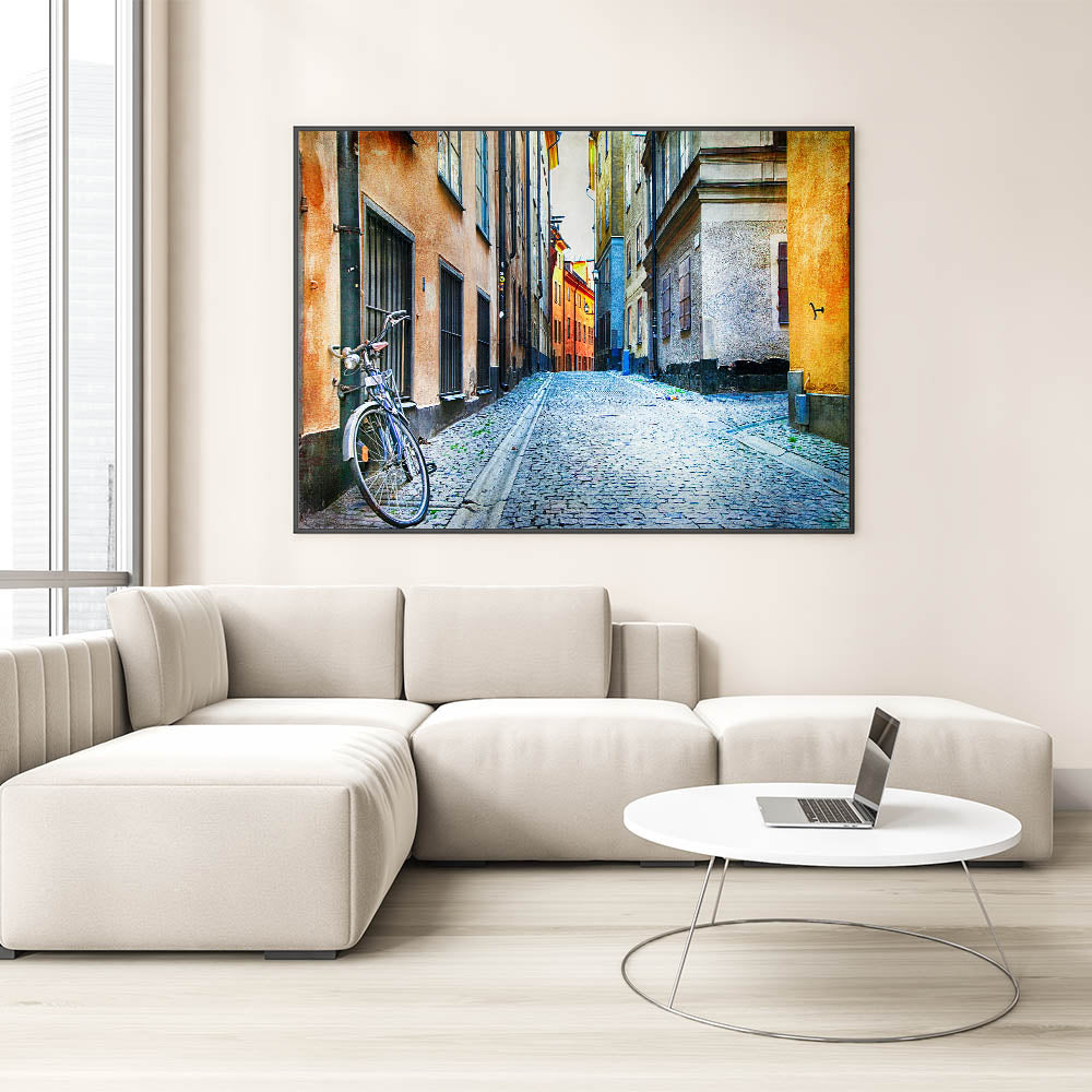Step into the vibrant streets of Stockholm's Old Town with this stunning cityscape wall art. This piece captures the essence of a quiet cobblestone alley, complete with charming historical buildings and a bicycle leaning against the wall. The warm tones of the buildings contrast beautifully with the cool street, making this artwork ideal for those who want to bring a bit of Scenic Stockholm charm into their home. Available in stretched canvas, framed canvas, acrylic glass, and rolled prints, this artwork brings the magic of Stockholm’s narrow streets to life.