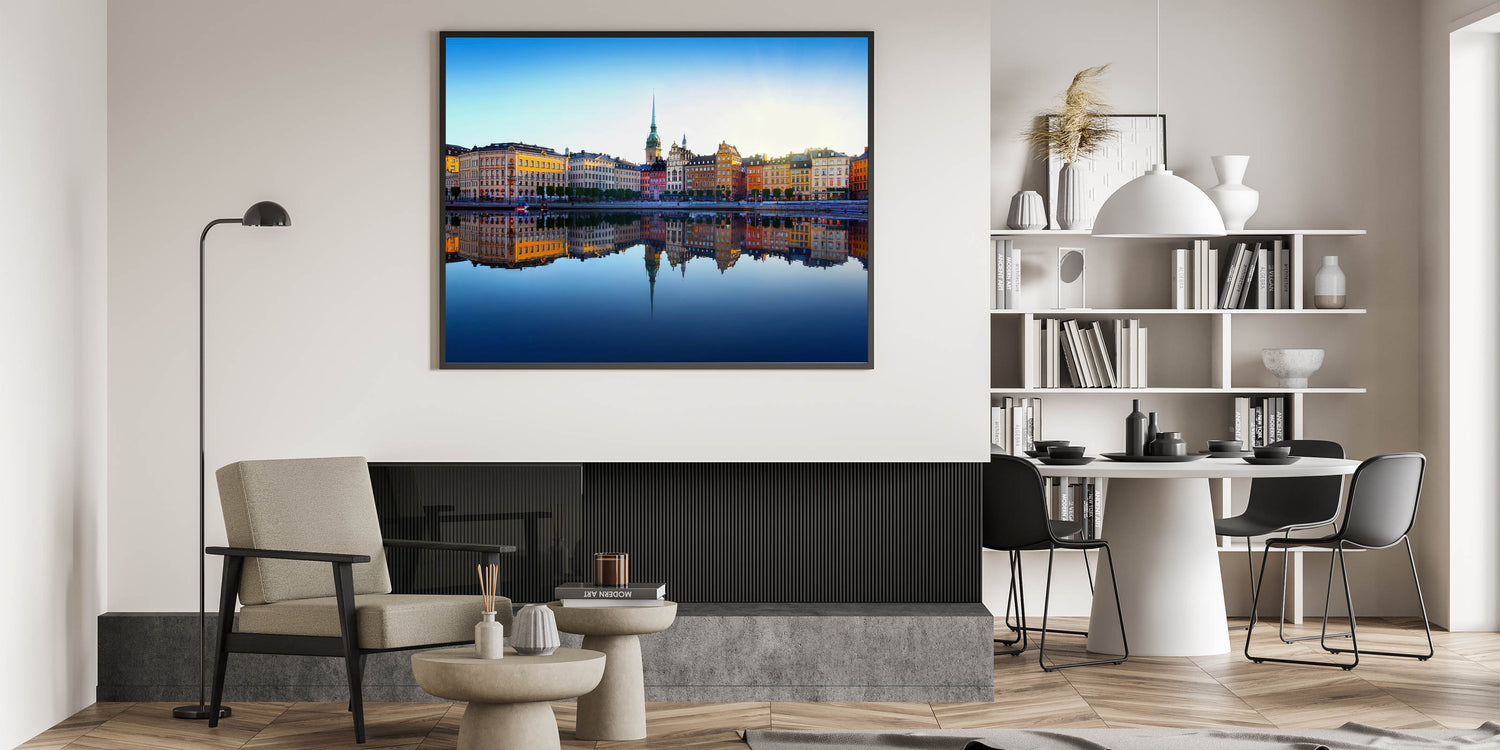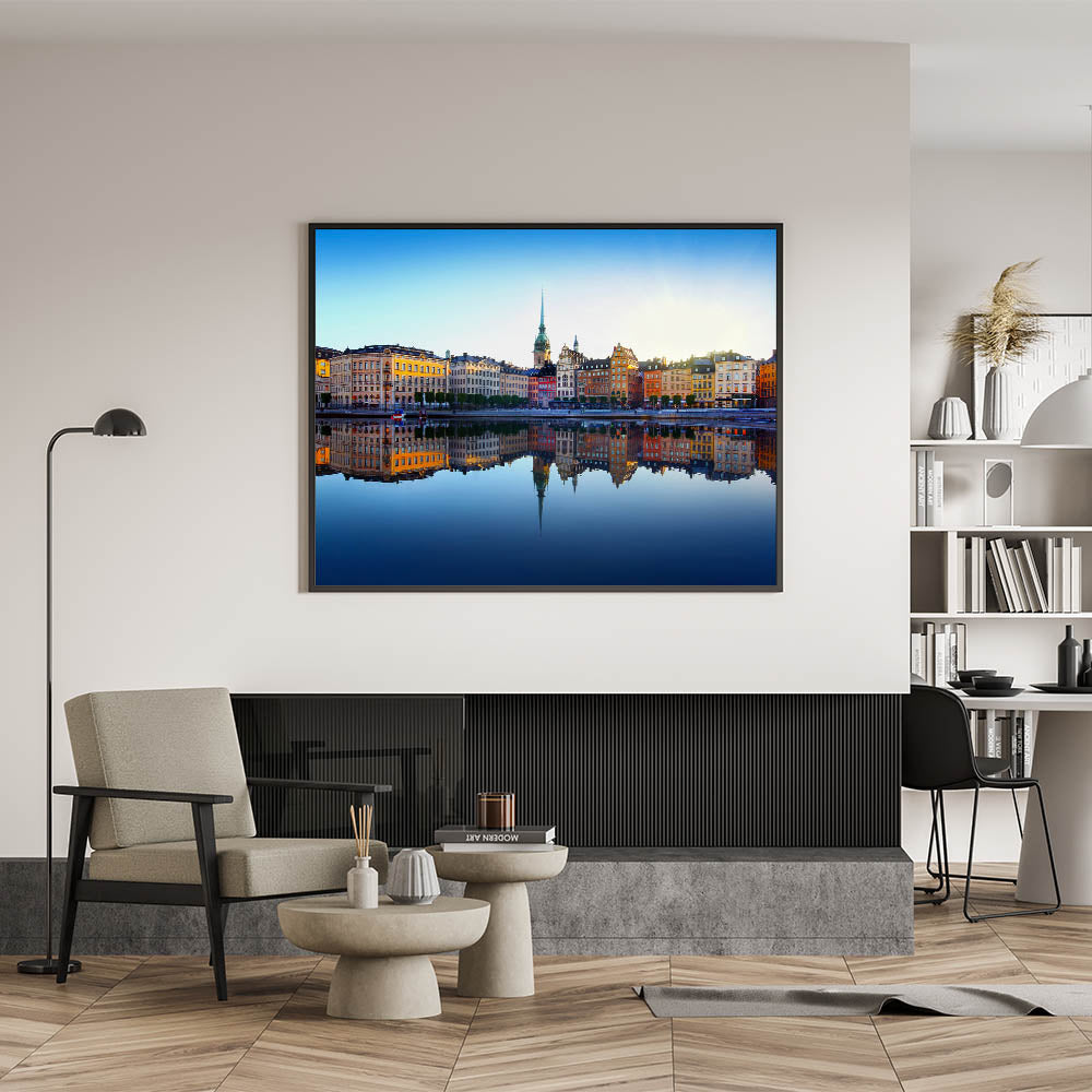 Experience the charm of Stockholm’s waterfront with this breathtaking cityscape wall art. This vibrant artwork captures the serene beauty of Stockholm’s historic architecture reflected perfectly in still waters under a radiant sky. This stunning piece is ideal for those who want to bring the iconic streets and scenic views of Stockholm into their living space. Available in several formats, such as stretched canvas, framed canvas, acrylic glass, and rolled prints, this artwork adds a touch of elegance and sophistication to any room.