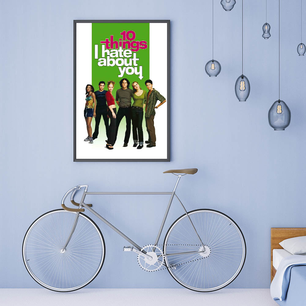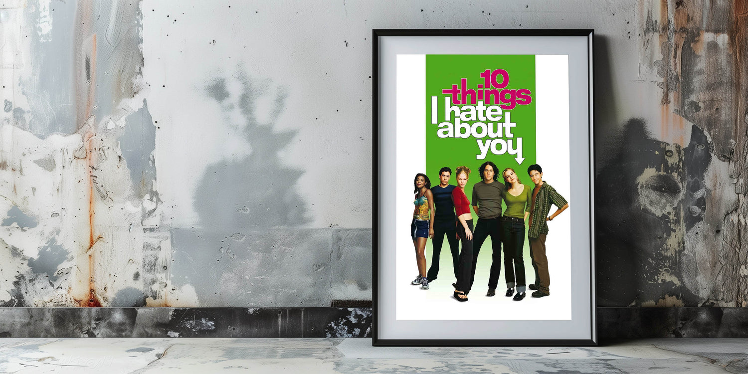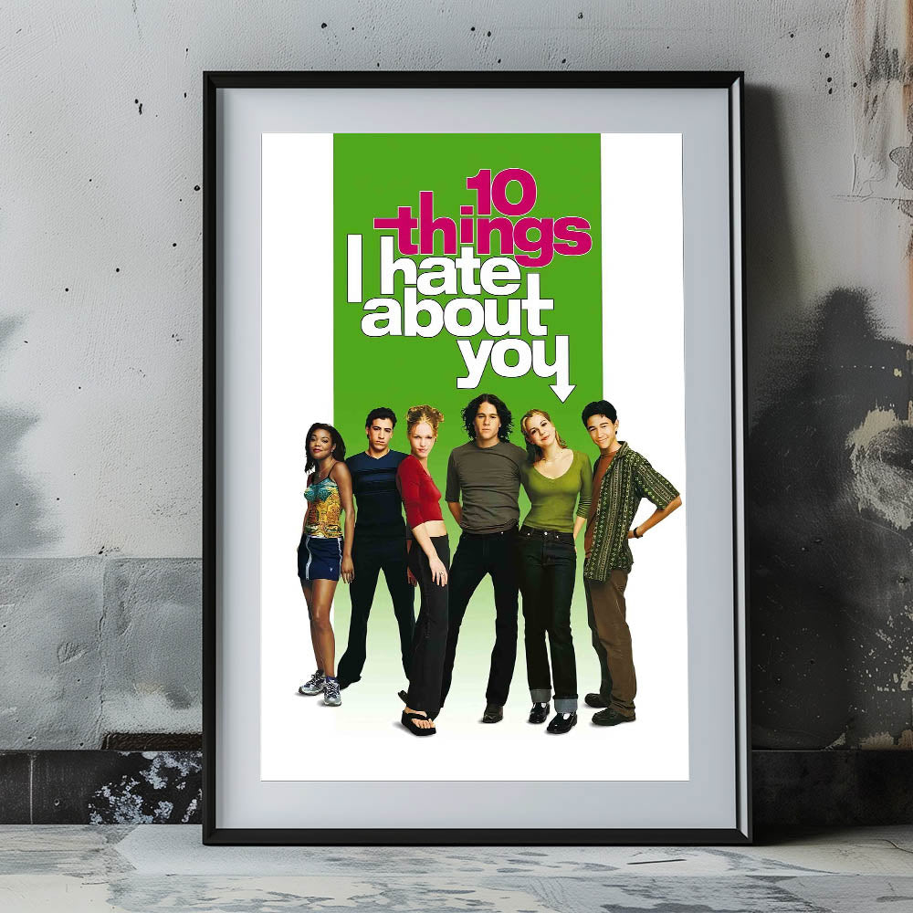 Bring the charm of the late 90s to your space with this nostalgic 90s cinema art featuring the classic film poster of 10 Things I Hate About You. A perfect blend of retro 1990s movie print and teenage romance, this collectible movie memorabilia is a must-have for film lovers.