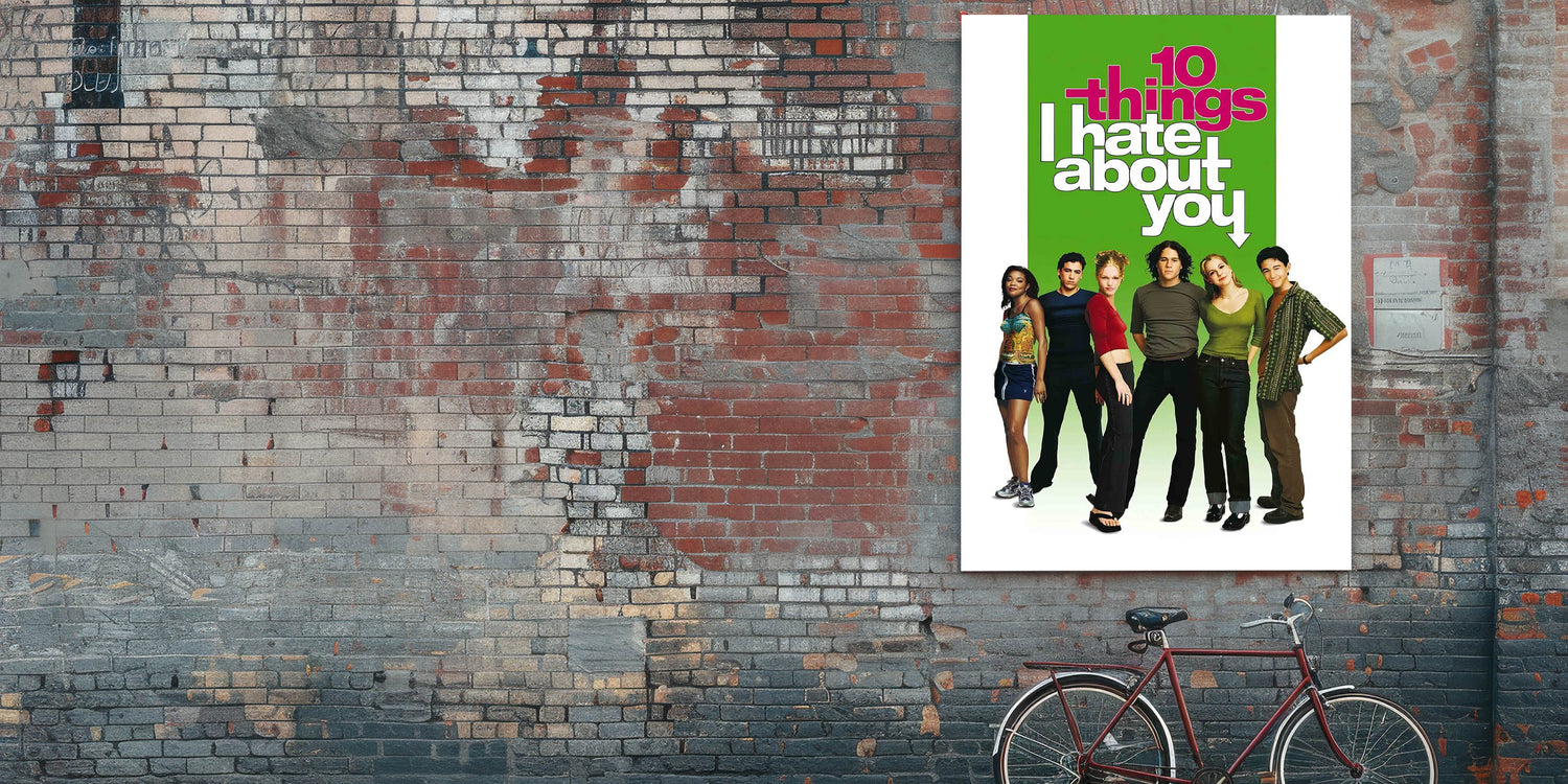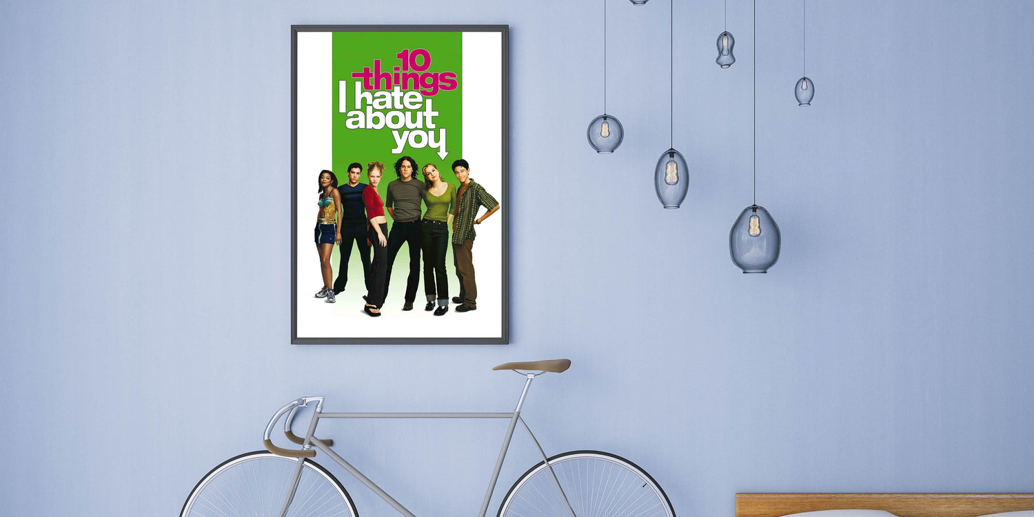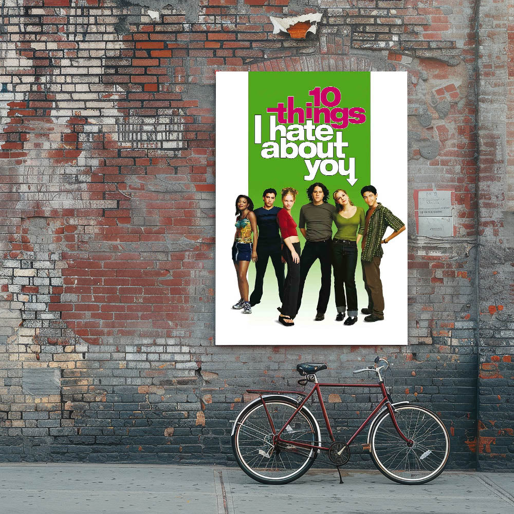 Bring the charm of the late 90s to your space with this nostalgic 90s cinema art featuring the classic film poster of 10 Things I Hate About You. A perfect blend of retro 1990s movie print and teenage romance, this collectible movie memorabilia is a must-have for film lovers.