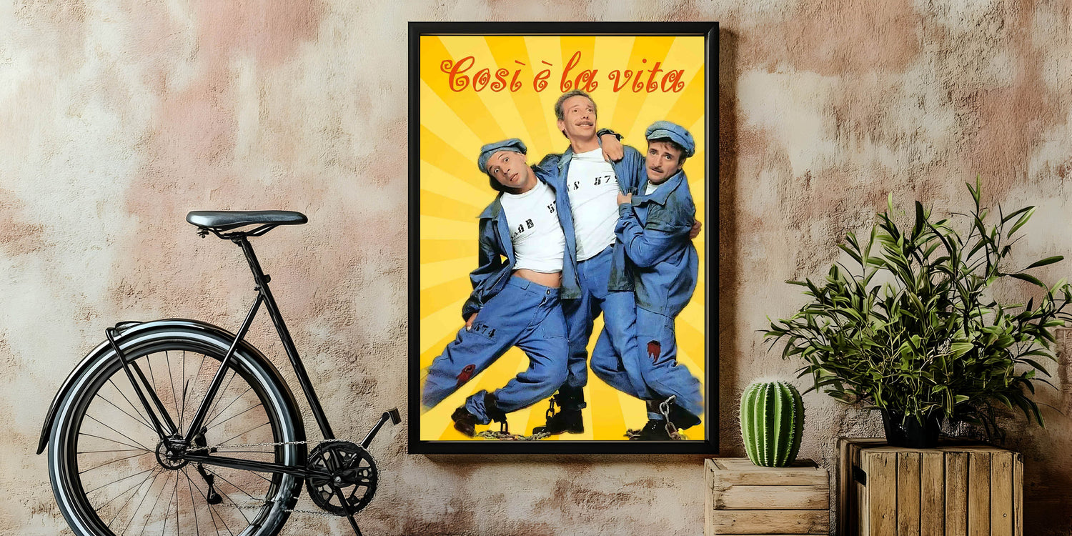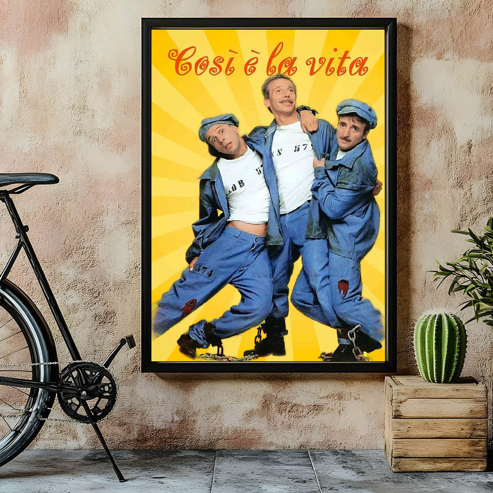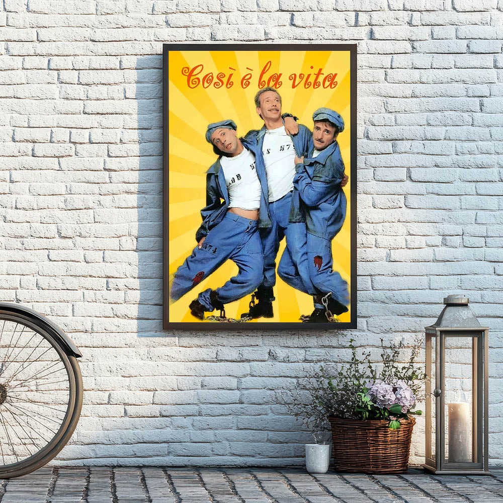 Brighten up your space with this nostalgic 90s cinema art, featuring the vintage film poster from the 90s for Così è la Vita. This iconic 90s film poster perfectly showcases the comedic energy and playful spirit of the legendary trio Aldo, Giovanni & Giacomo. With its vibrant yellow backdrop and exaggerated expressions, this authentic 1990s movie collectible is a must-have for fans of Italian comedy and classic humor.