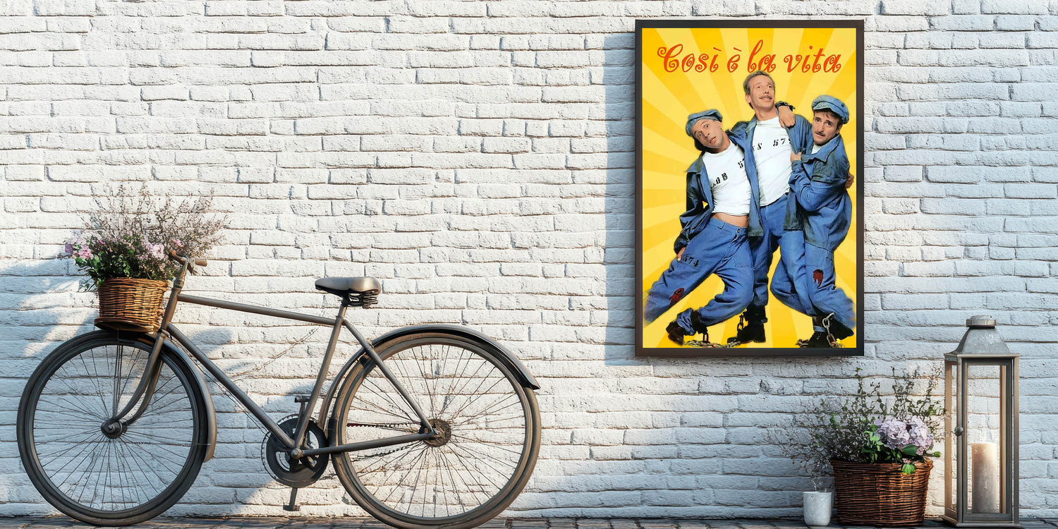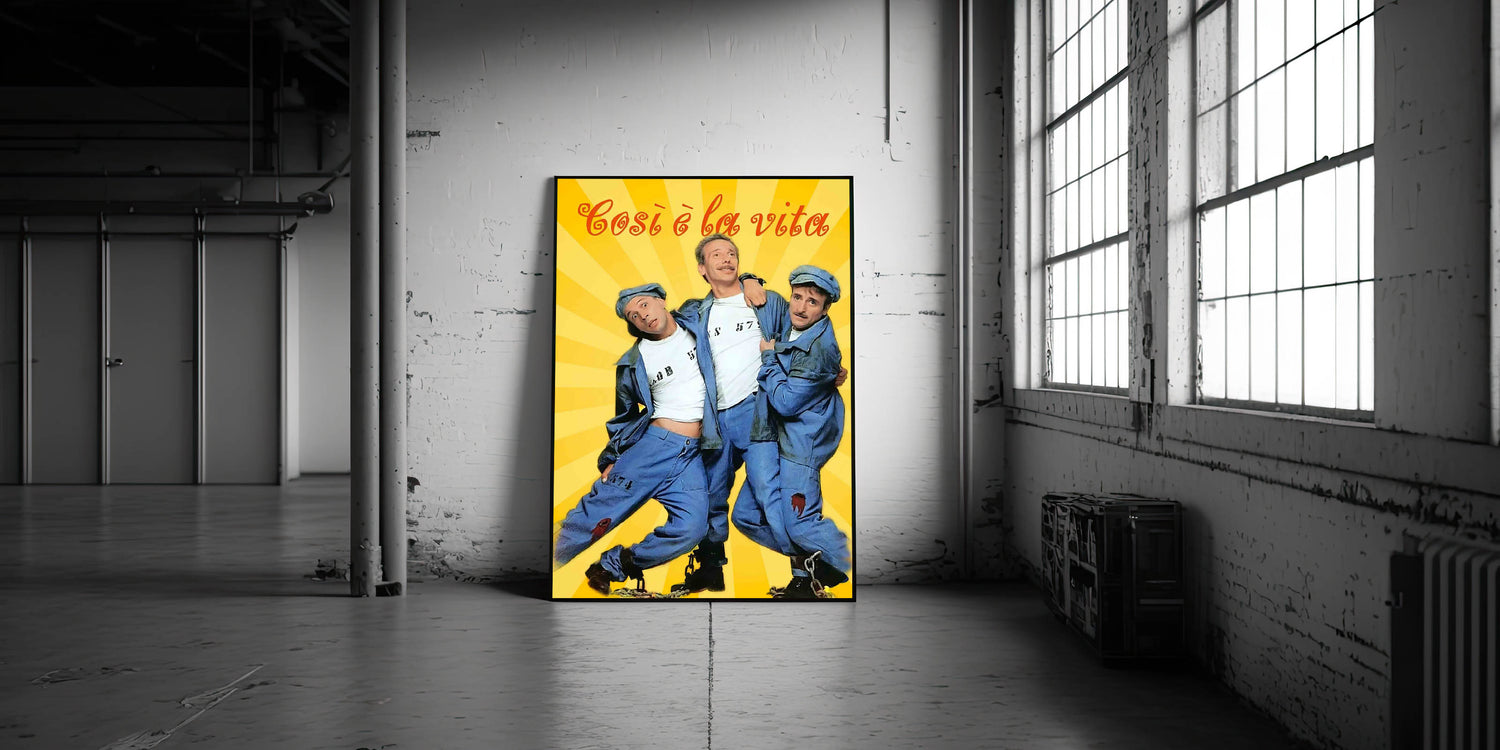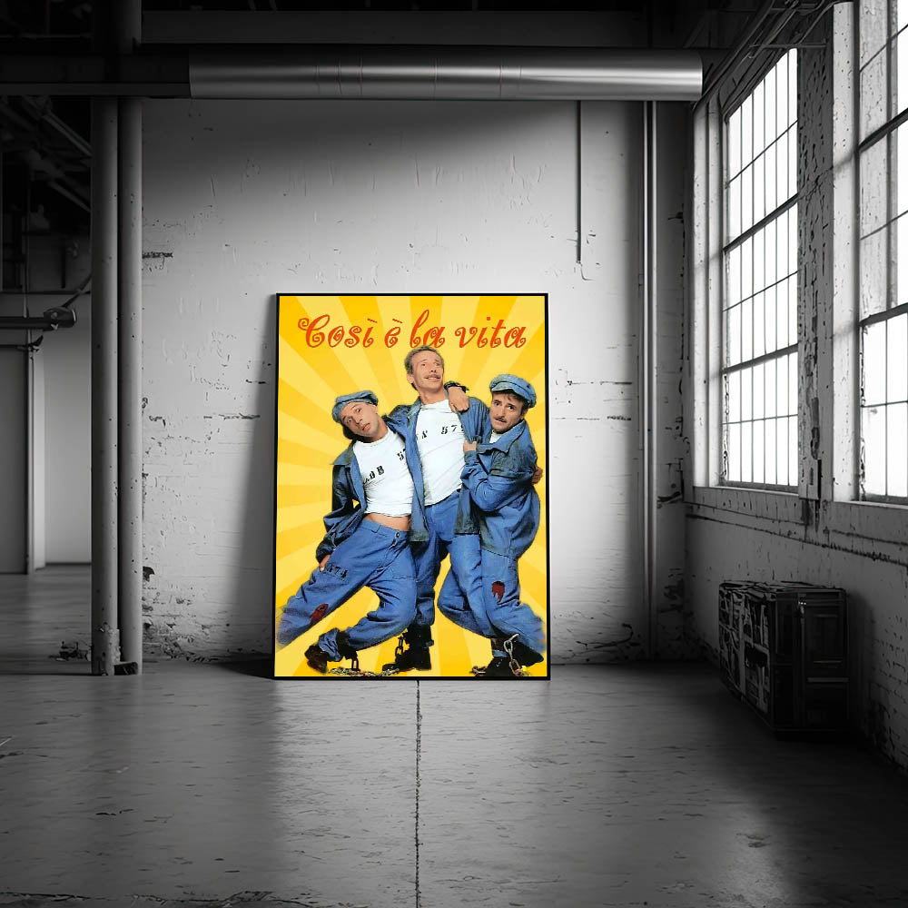 Brighten up your space with this nostalgic 90s cinema art, featuring the vintage film poster from the 90s for Così è la Vita. This iconic 90s film poster perfectly showcases the comedic energy and playful spirit of the legendary trio Aldo, Giovanni & Giacomo. With its vibrant yellow backdrop and exaggerated expressions, this authentic 1990s movie collectible is a must-have for fans of Italian comedy and classic humor.