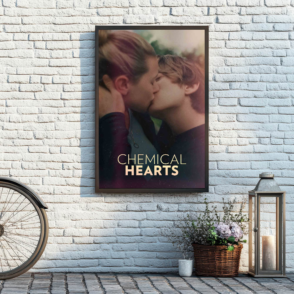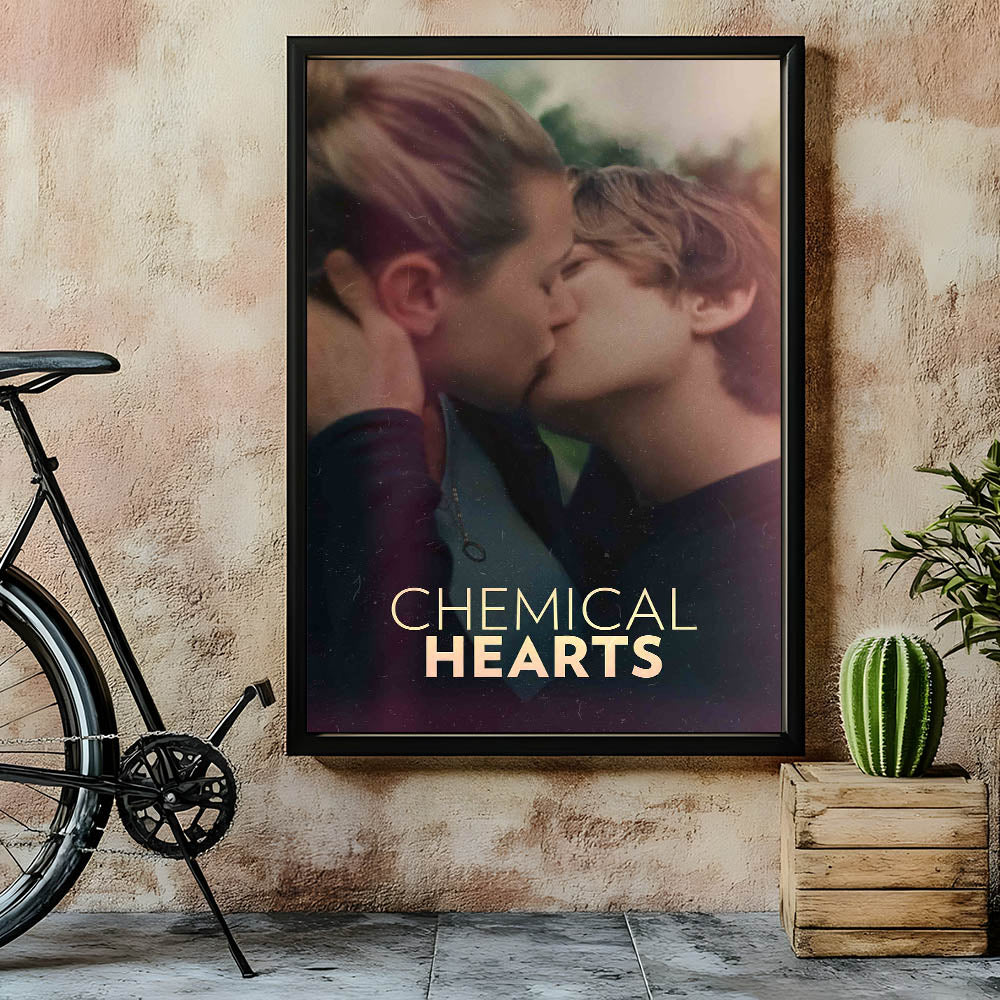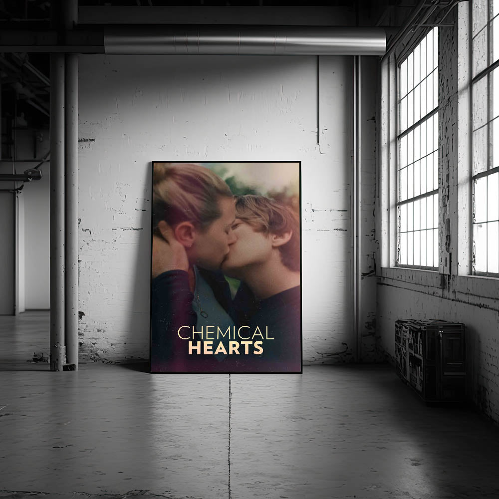 Capture the essence of young love with this striking Chemical Hearts vintage movie poster. The film explores the tender and complex emotions of a teenager as he navigates love, loss, and self-discovery. Featuring an intimate moment between the two leads, this poster beautifully conveys the raw, emotional nature of the story. Ideal for fans of coming-of-age films and romantic dramas, this art piece is a perfect addition to any collection.