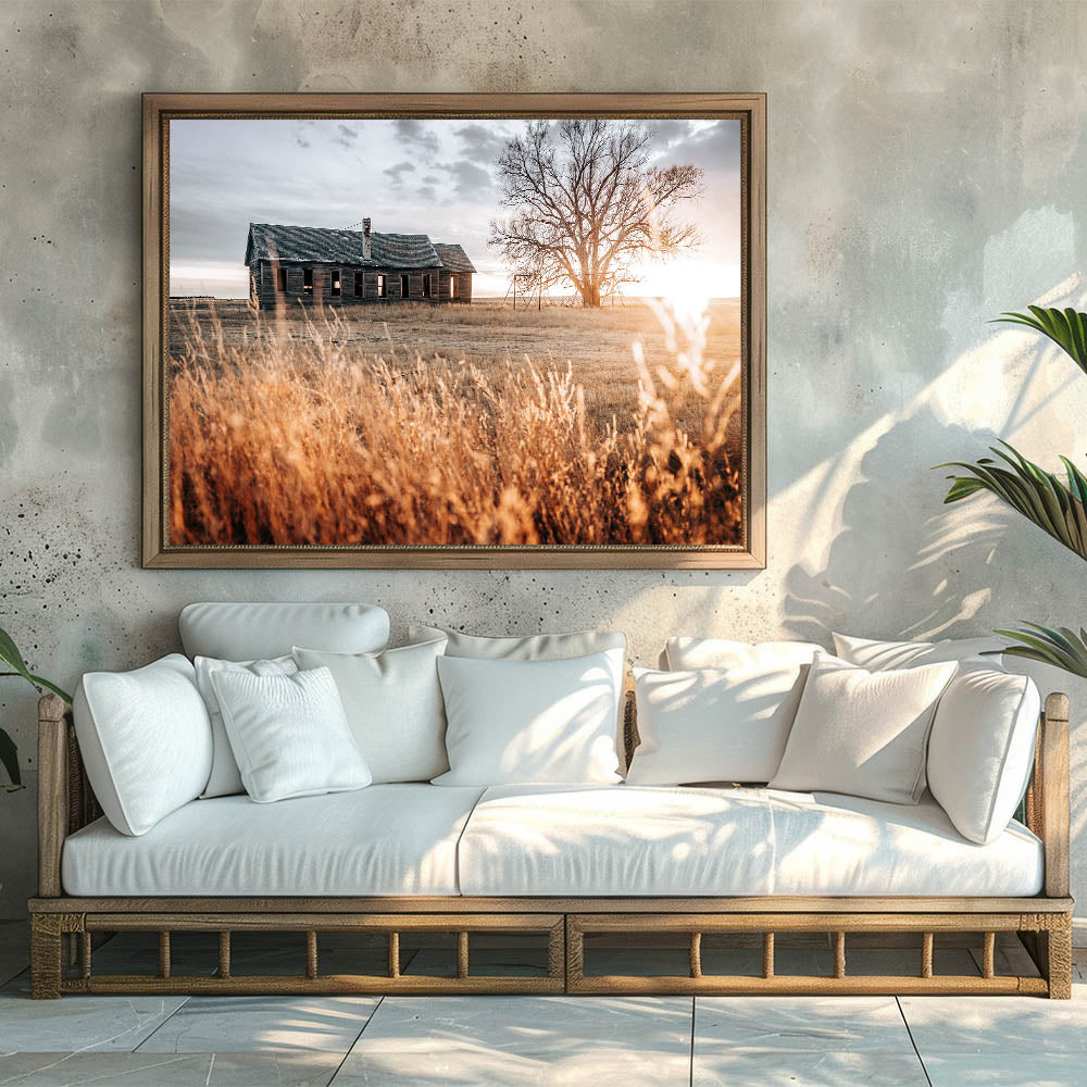 Bring the timeless beauty of rural life into your home with this stunning abandoned farmhouse wall art. Set against a warm sunset, this artwork captures the peaceful yet nostalgic feeling of an old farmhouse standing amidst golden fields. The large, weathered tree and soft golden grasses add depth and character to the scene, making it an ideal choice for rustic and farmhouse-style interiors.