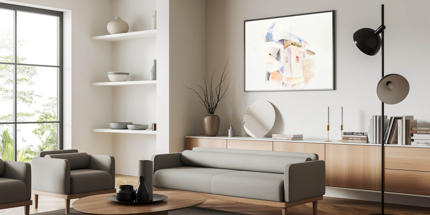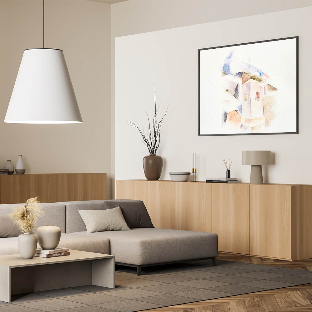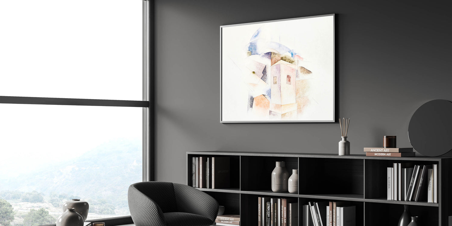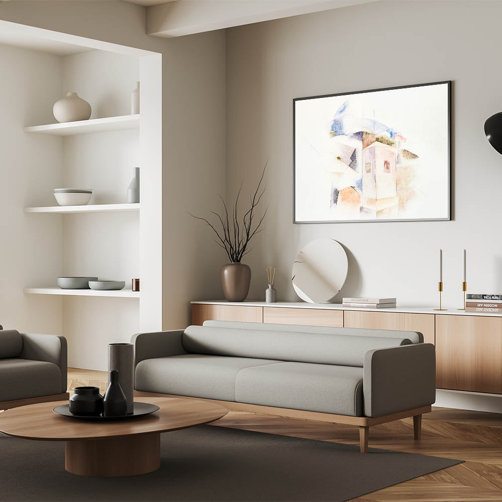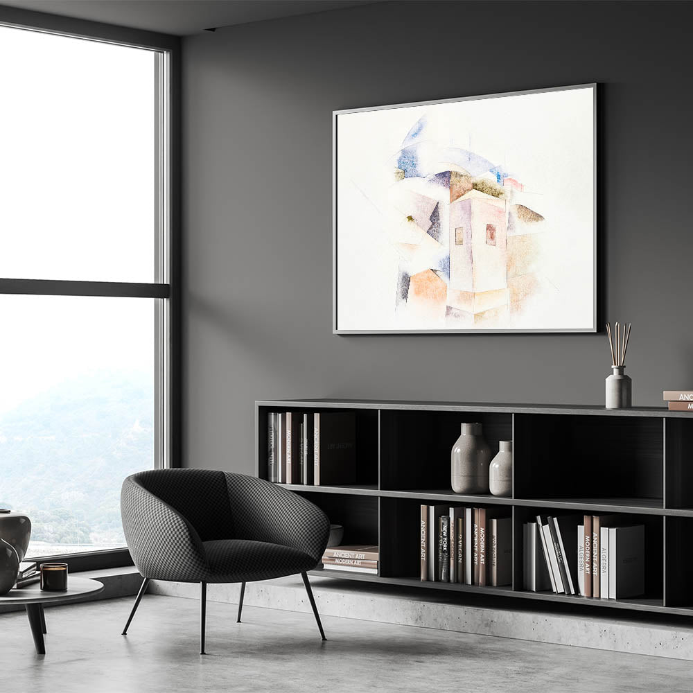 This unique modern art piece adds a layer of quiet beauty to your home. Its subtle color palette and architectural abstraction make it a captivating focal point, ideal for creating a serene and stylish ambiance.