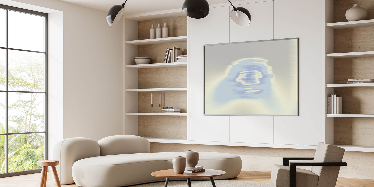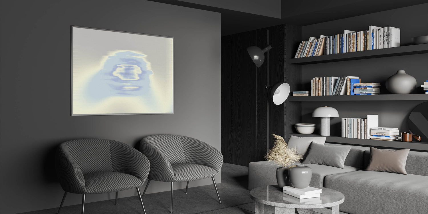 This modern wall art piece merges artistic color transitions with natural, flowing forms, providing a serene and sophisticated addition to any space. Its subtle movement and gentle blue tones bring a sense of harmony and tranquility to your interior decor.