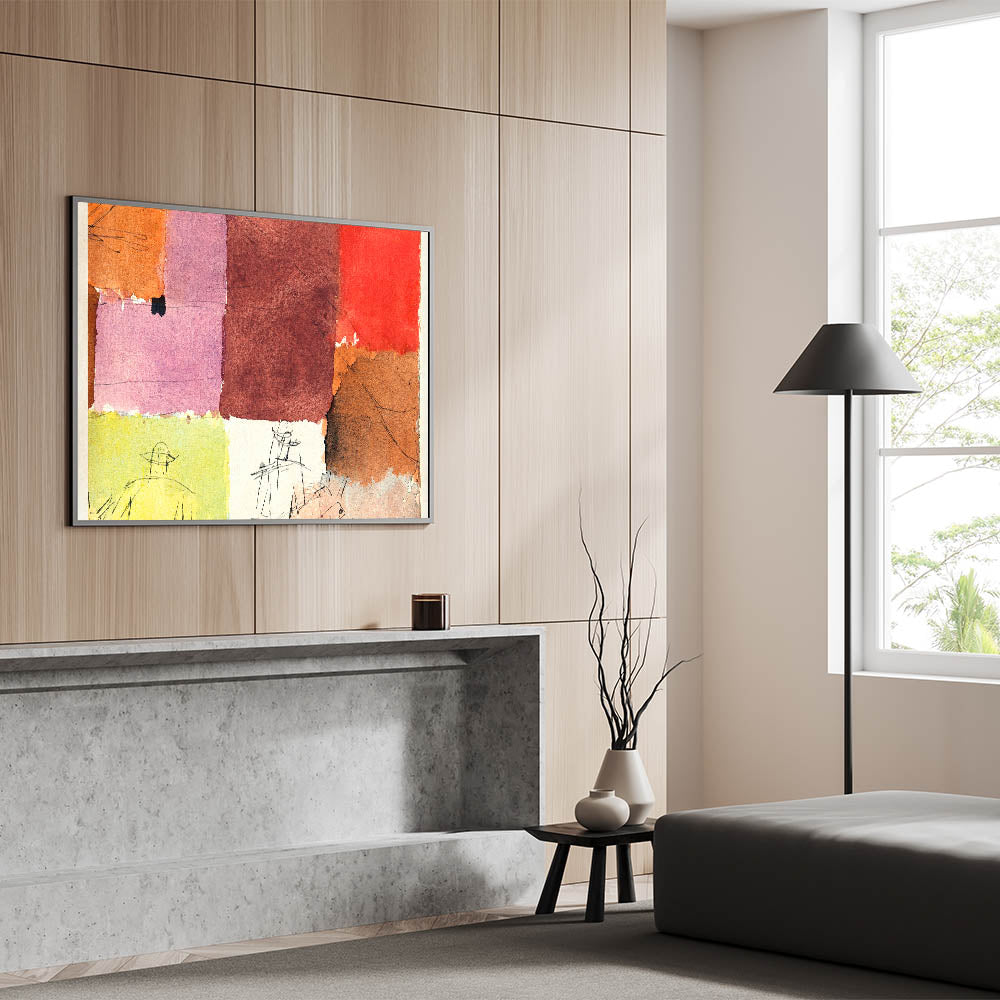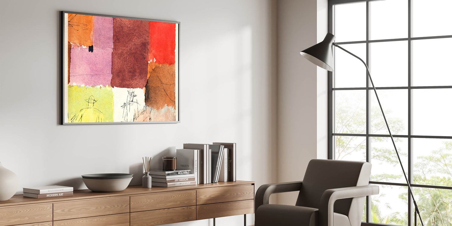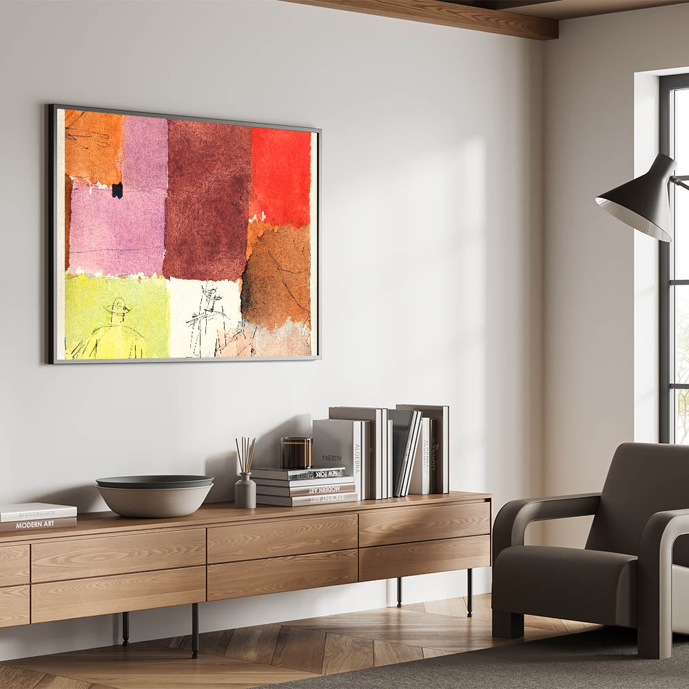 This abstract composition combines vibrant blocks of color with minimalist line figures, creating a stunning piece of modern wall art. The rich hues of red, orange, pink, and brown blend harmoniously, making it an eye-catching addition to any contemporary or minimalist decor. Perfect for those looking to enhance their home with stylish wall art that embodies unique modern art.