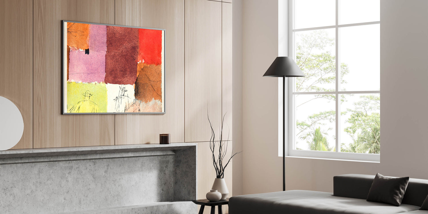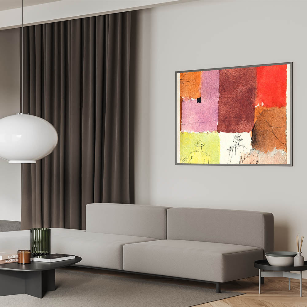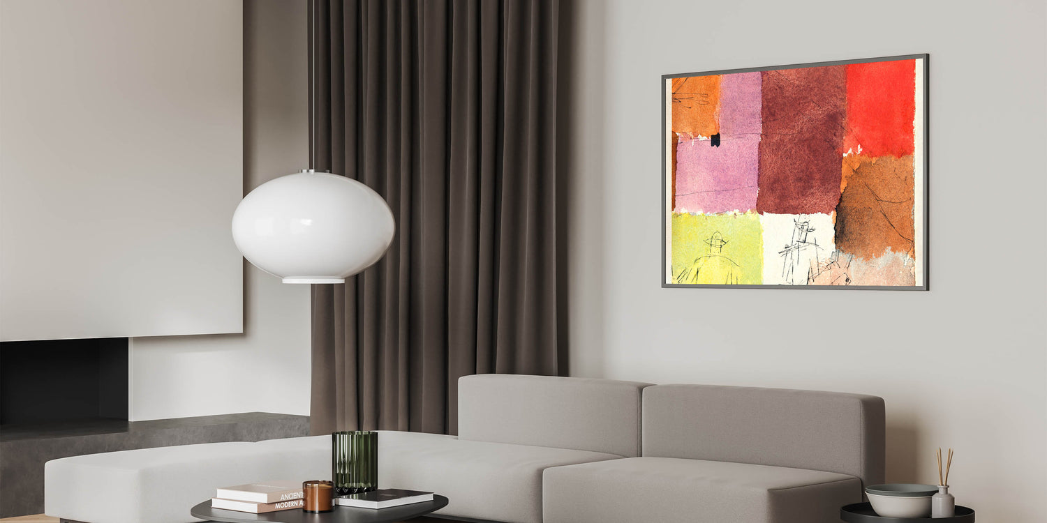 This abstract composition combines vibrant blocks of color with minimalist line figures, creating a stunning piece of modern wall art. The rich hues of red, orange, pink, and brown blend harmoniously, making it an eye-catching addition to any contemporary or minimalist decor. Perfect for those looking to enhance their home with stylish wall art that embodies unique modern art.