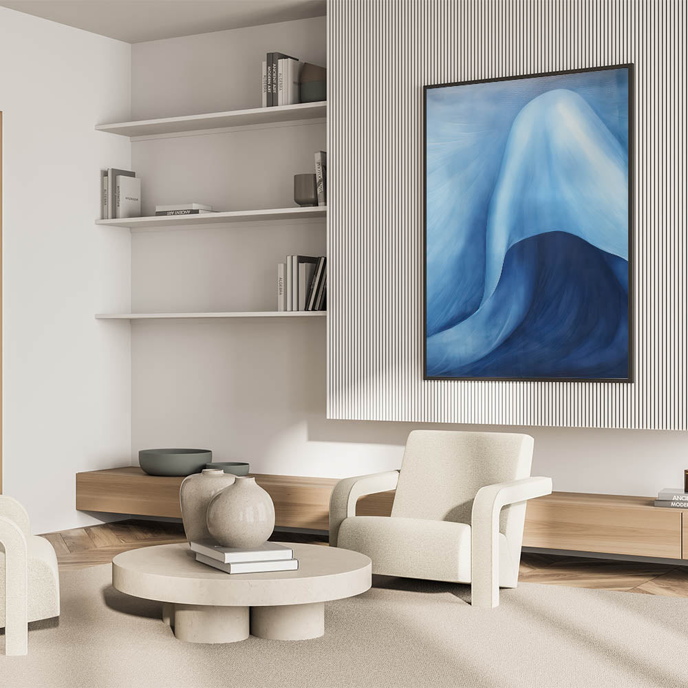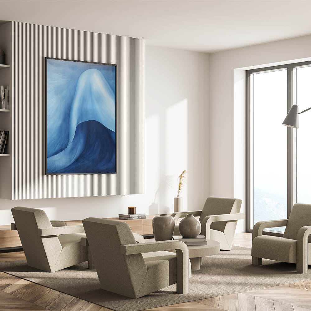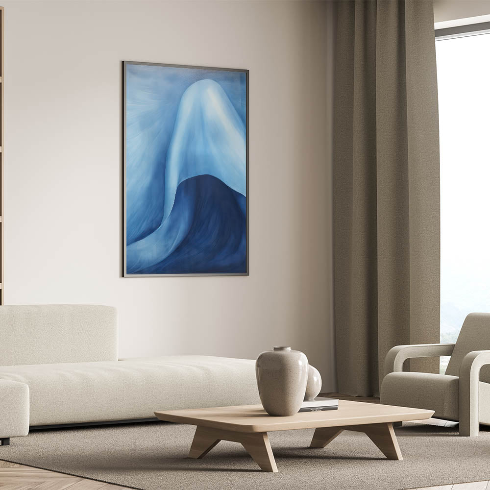 This mesmerizing electric blue wall art captures the essence of flowing waves, blending various shades of blue in a smooth, abstract form. The fluid movement and the play of light and shadow create a sense of calm and mystery, perfect for enhancing modern and minimalist interiors. The soft gradients of blue, from sky to deep navy, evoke an electric yet serene atmosphere.