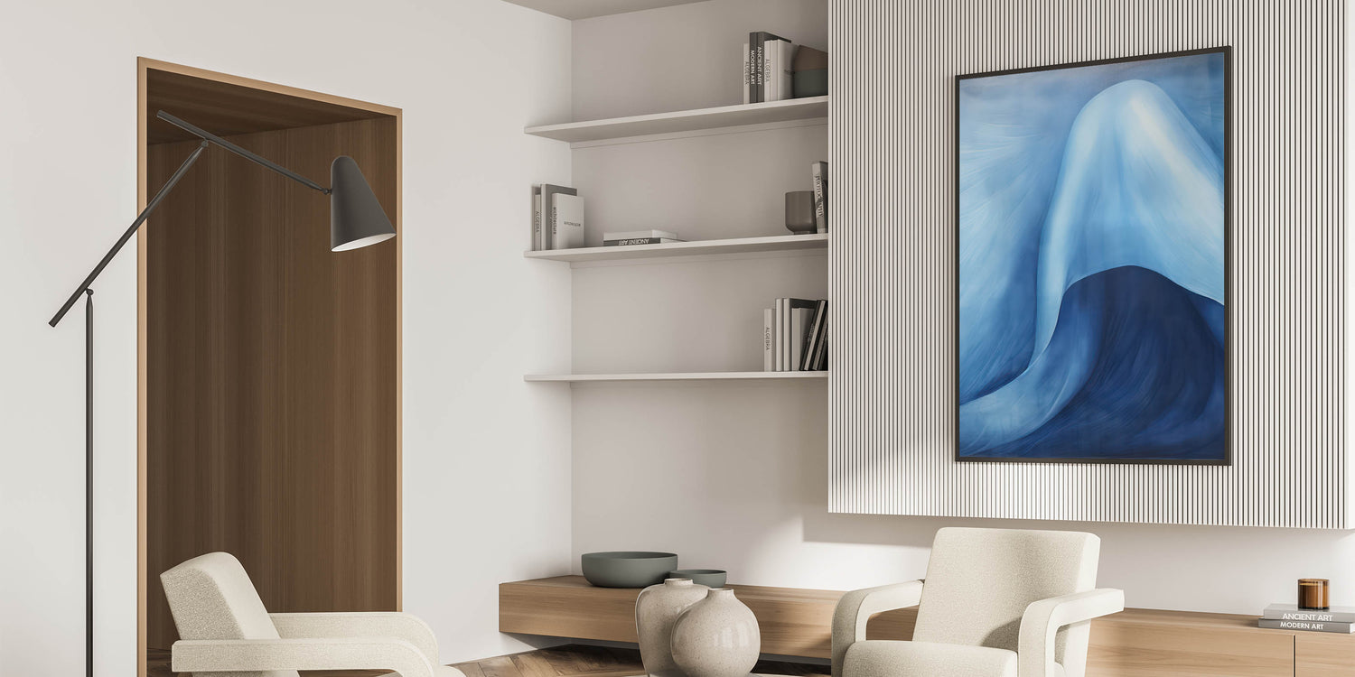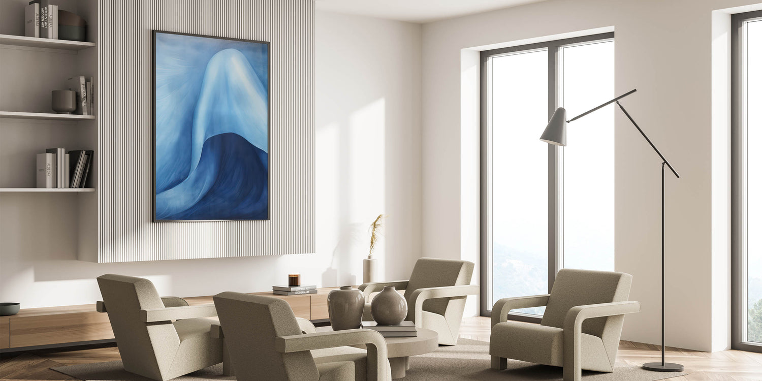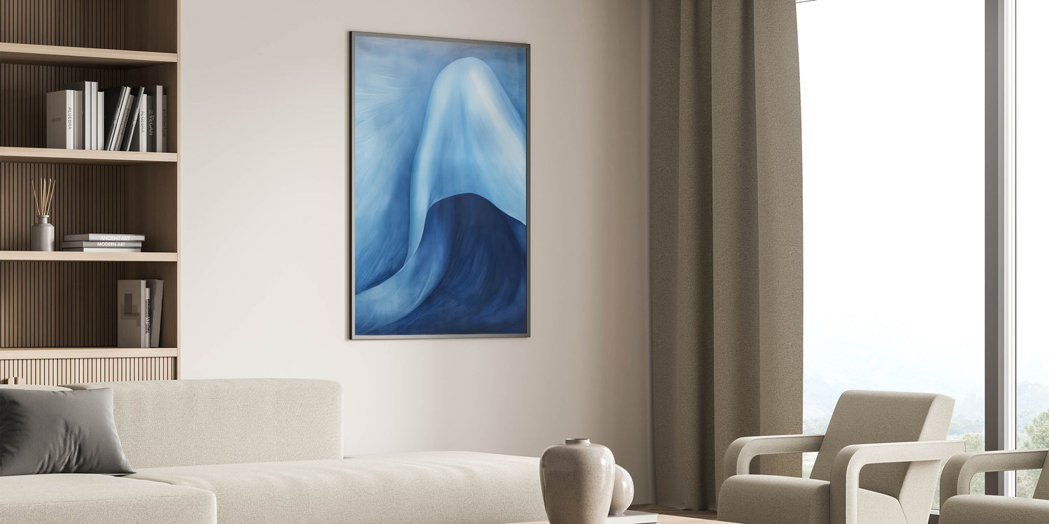 This mesmerizing electric blue wall art captures the essence of flowing waves, blending various shades of blue in a smooth, abstract form. The fluid movement and the play of light and shadow create a sense of calm and mystery, perfect for enhancing modern and minimalist interiors. The soft gradients of blue, from sky to deep navy, evoke an electric yet serene atmosphere.