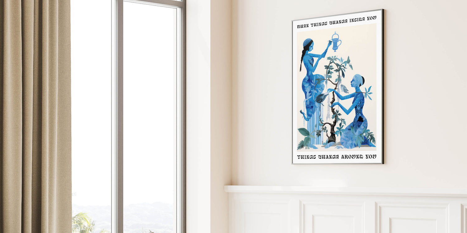 Transform your space with the Abstract Electric Blue Figures Canvas, an artistic representation of dynamic energy and transformation. This captivating piece features two blue figures surrounded by nature-inspired elements, all set against a bright backdrop. The design is accentuated with an electric blue palette, making it perfect for those who appreciate modern electric-themed decor. The motivational quote, “When things change inside you, things change around you,” adds an uplifting touch, making this piece both visually stunning and inspiring.