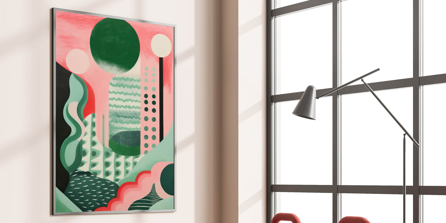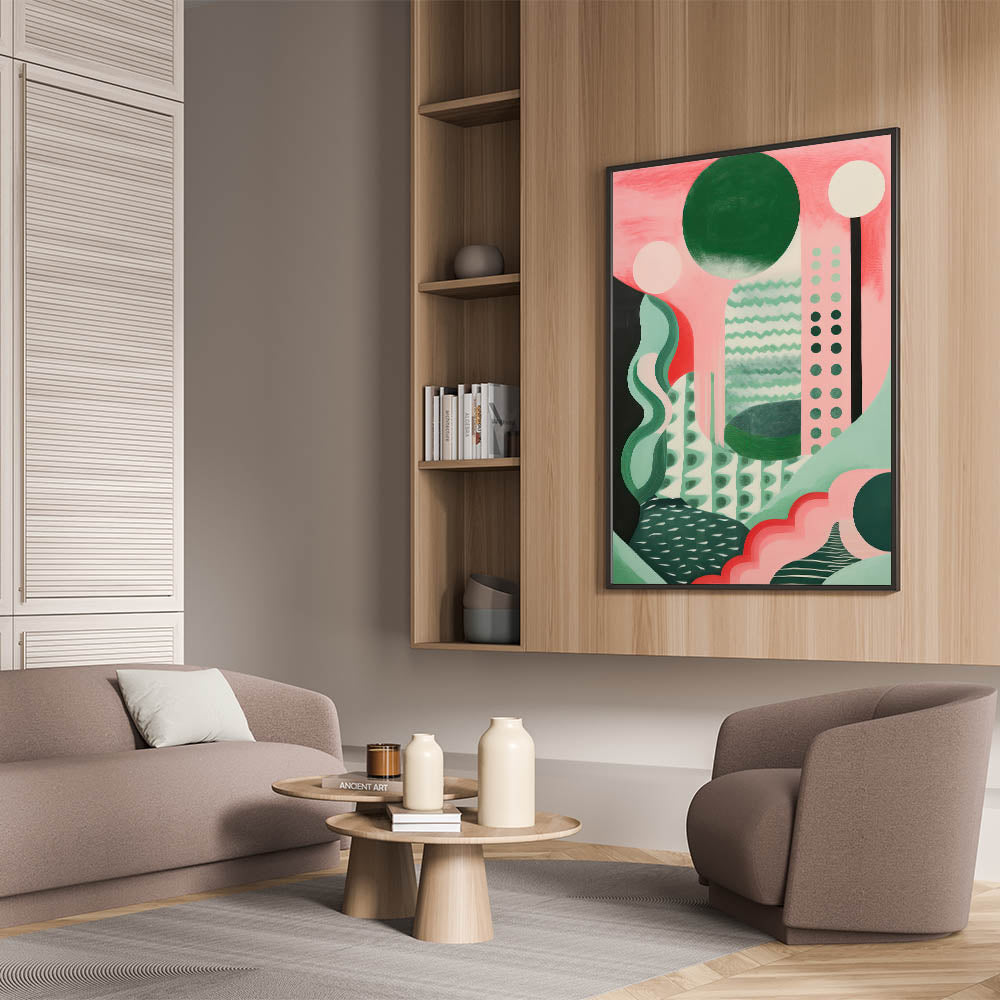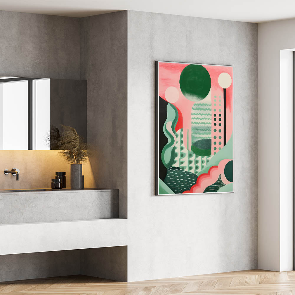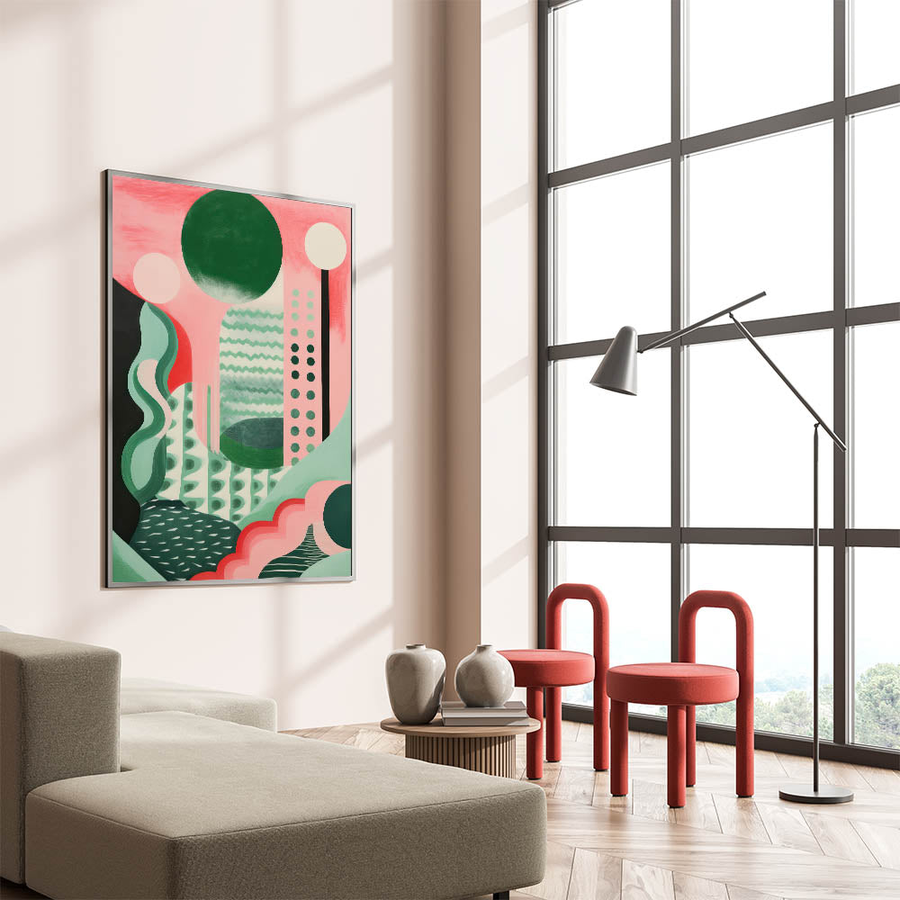 Add a pop of energy to your space with this abstract electric wall art. Featuring bold shapes and vivid hues, this piece is a striking combination of deep greens, pinks, and soft mint tones, perfect for those who love dynamic and colorful art. The fluid patterns and vibrant palette create a playful yet sophisticated atmosphere, making it an excellent choice for living rooms, home offices, or creative spaces.