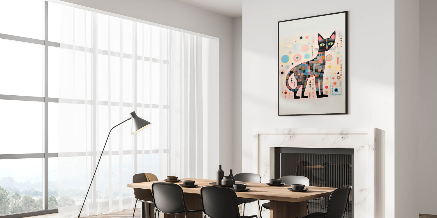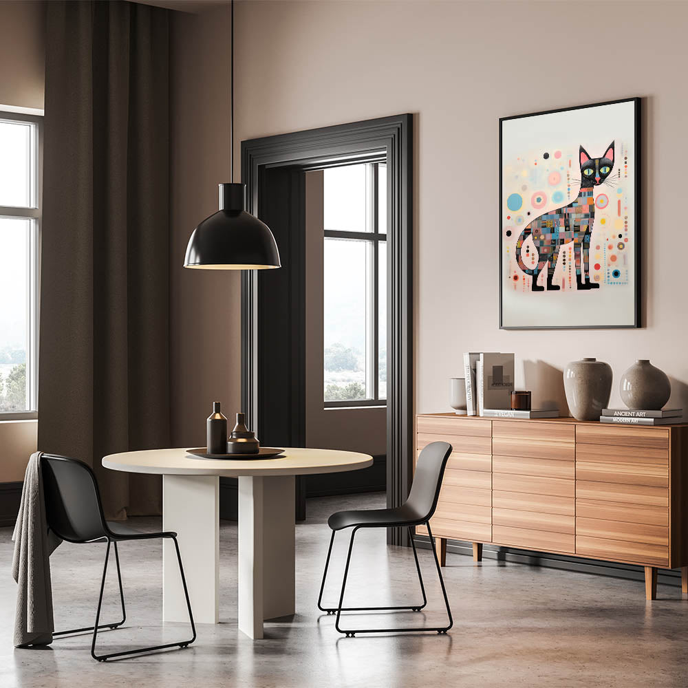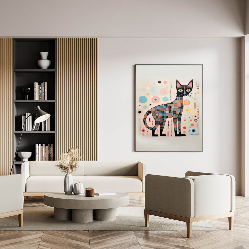 Introduce a playful and vibrant touch to your space with the "Abstract Electric Cat Canvas." This colorful piece of electric wall art showcases a stylized cat adorned with geometric and mosaic patterns, set against a lively background filled with circles and shapes in pastel and bold hues. Perfect for eclectic and contemporary interiors, this modern electric decor piece adds character and charm to any room.