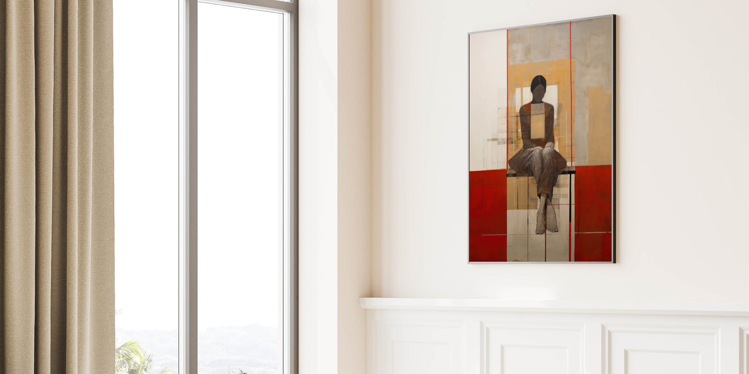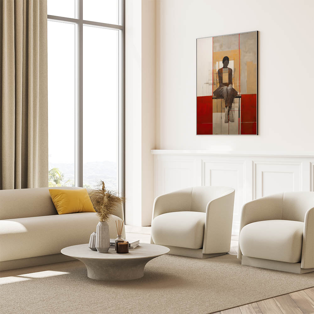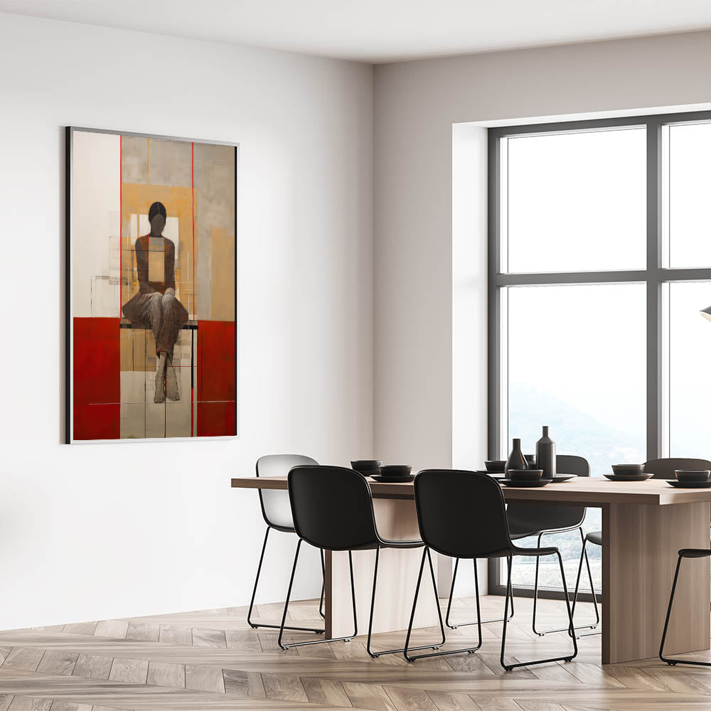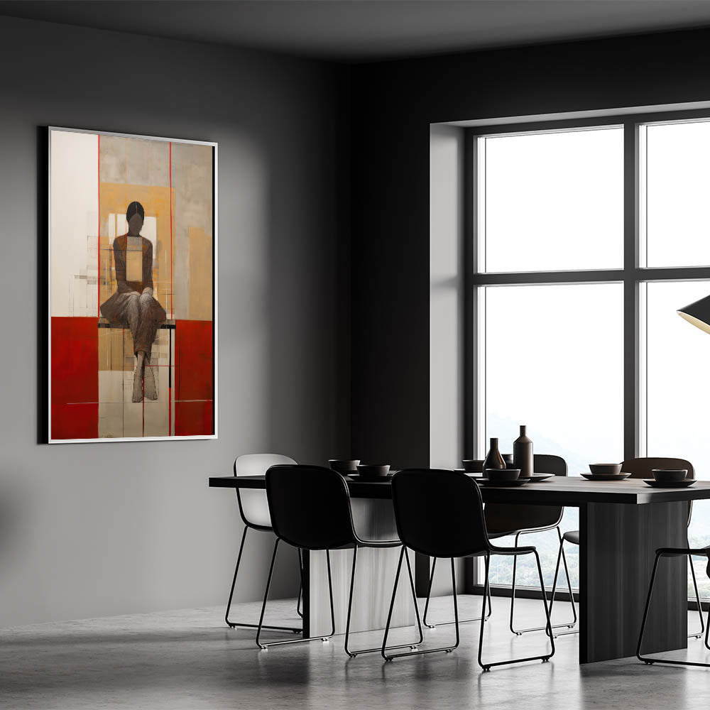 This electric wall art features an abstract portrait set against a striking backdrop of red, beige, and earthy tones. The faceless figure, rendered in geometric patterns and bold lines, creates a sense of introspection and mystery, making this piece a captivating focal point for contemporary spaces. The blend of warm and neutral hues adds depth and energy, perfect for those who appreciate modern art with an electric twist.