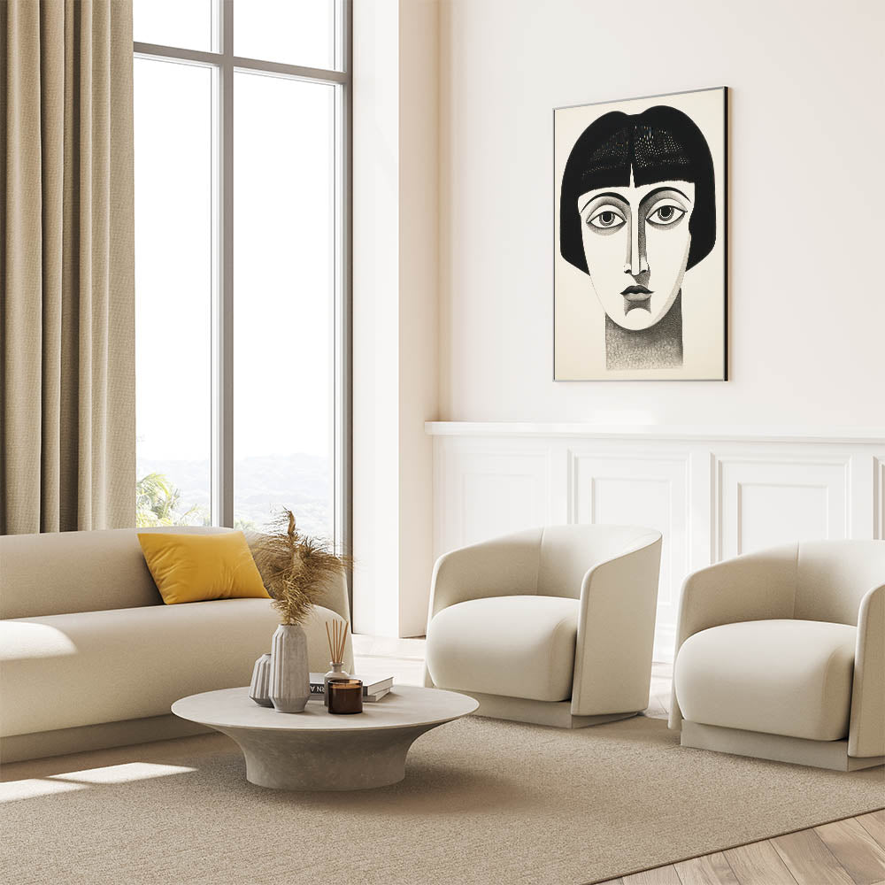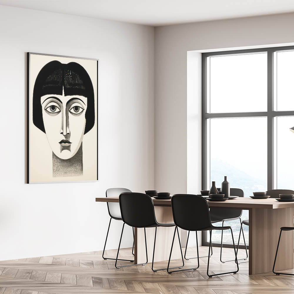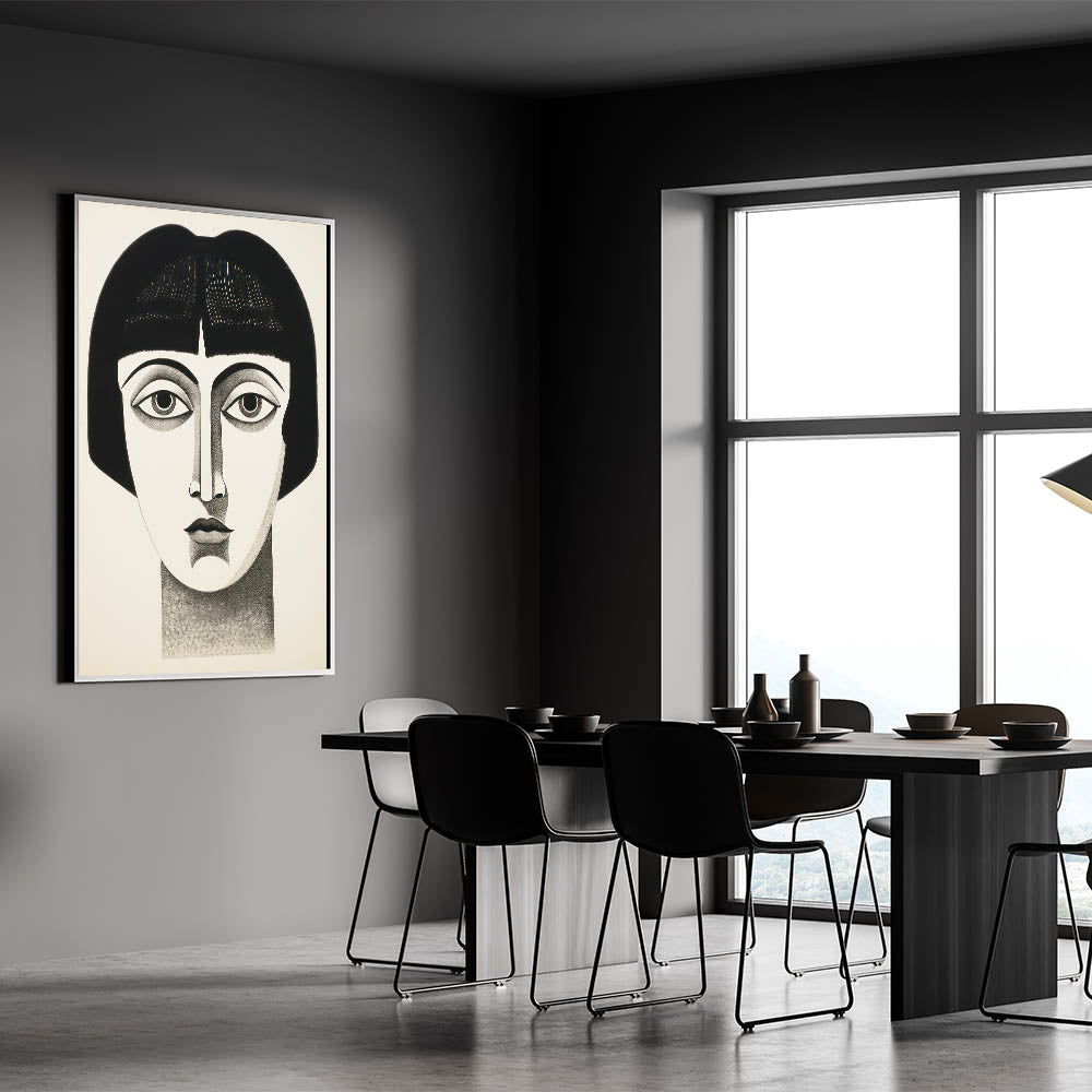 Add a striking and sophisticated touch to your decor with the Abstract Electric Portrait Canvas. This monochromatic artwork showcases a bold face with sharp, geometric lines and intense, expressive eyes, rendered in black and white. The clean and minimalistic design captures an electric aesthetic that merges modern and classic styles. This piece is perfect for those who appreciate contemporary, abstract portraiture with a touch of elegance.