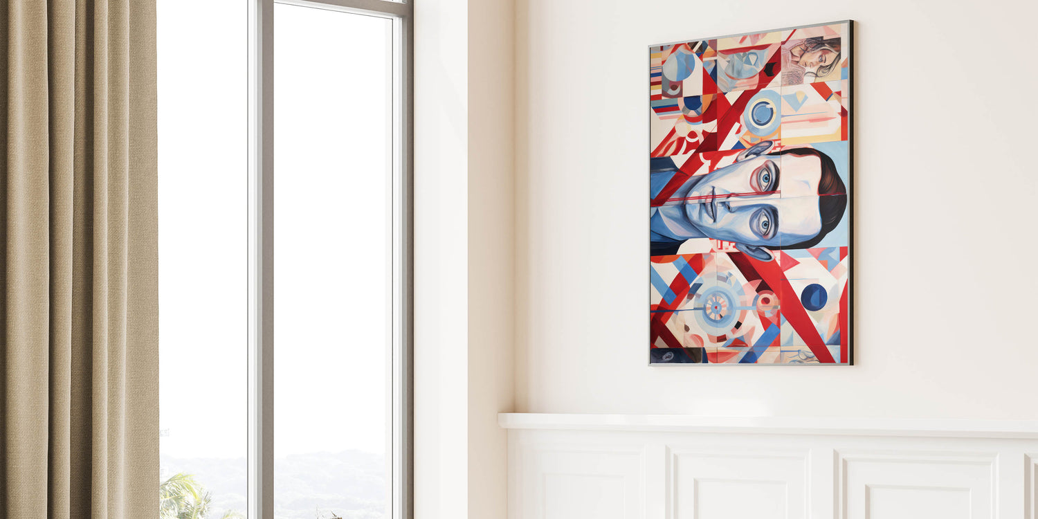The "Abstract Electric Portrait Canvas" is a bold and dynamic piece of electric wall art that combines abstract shapes, vivid colors, and fragmented imagery to create an eye-catching design. Featuring a striking portrait intertwined with geometric patterns in red, blue, and white, this artwork delivers a sense of movement and energy, perfect for modern and contemporary interiors.