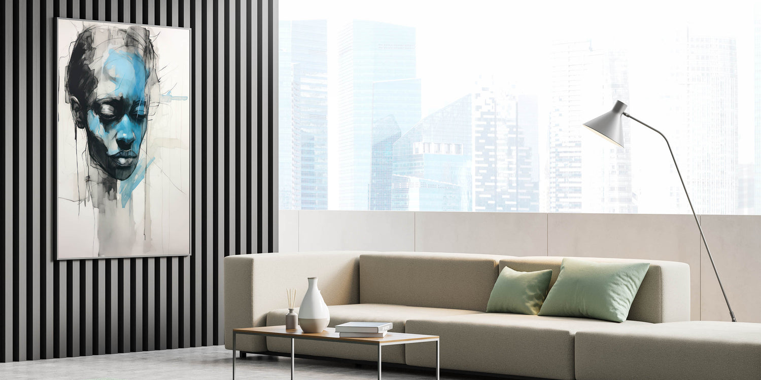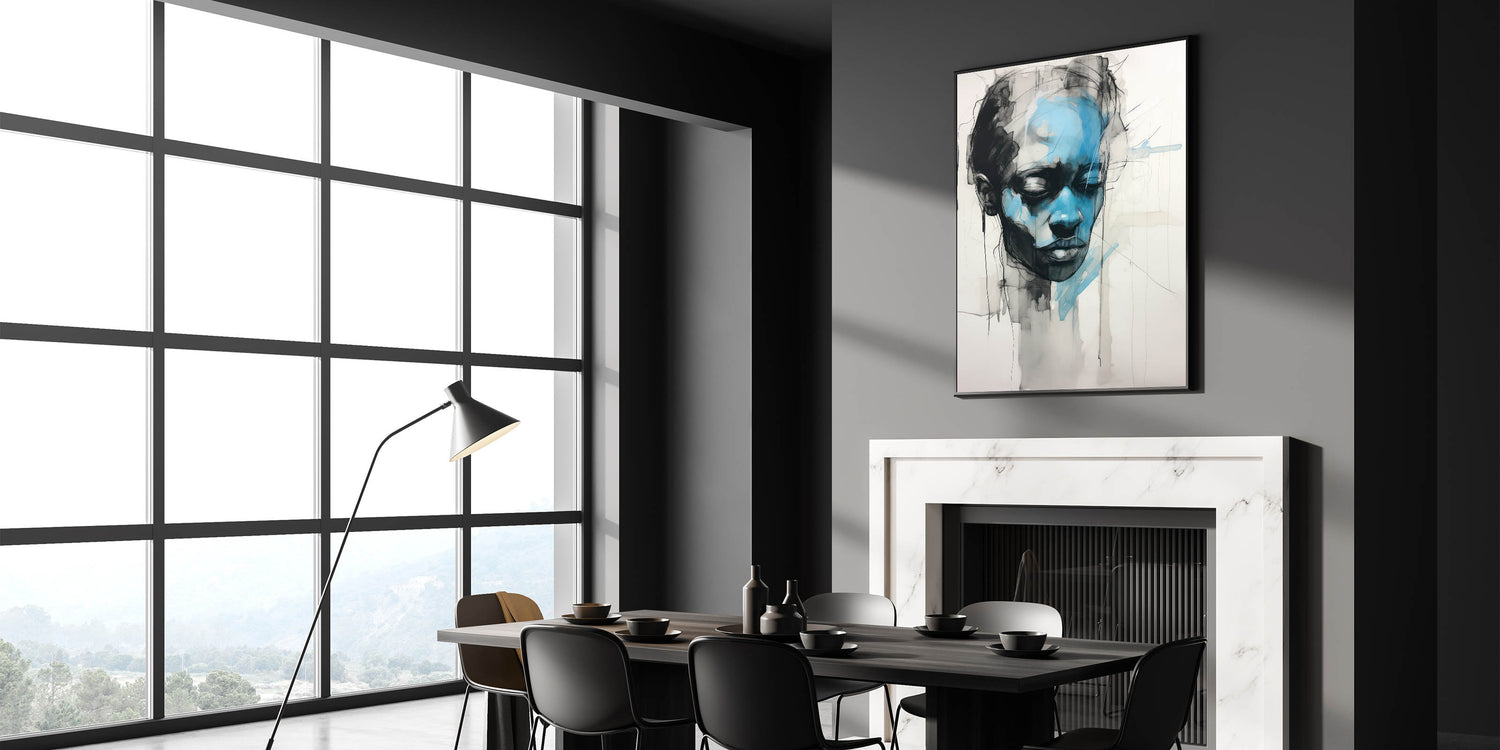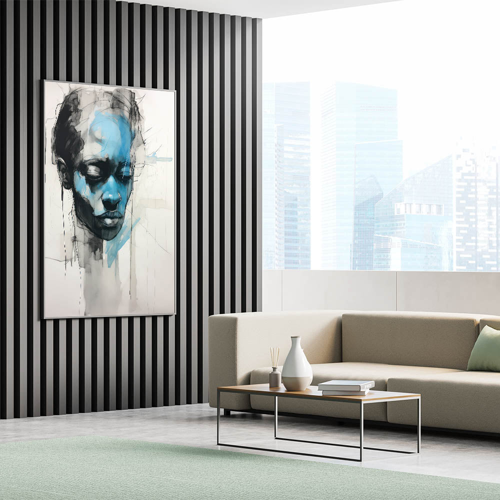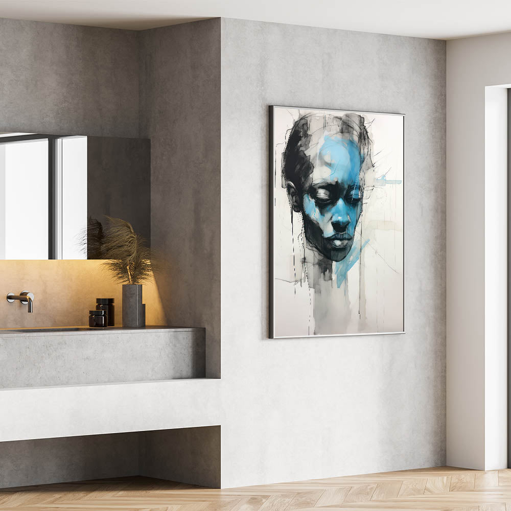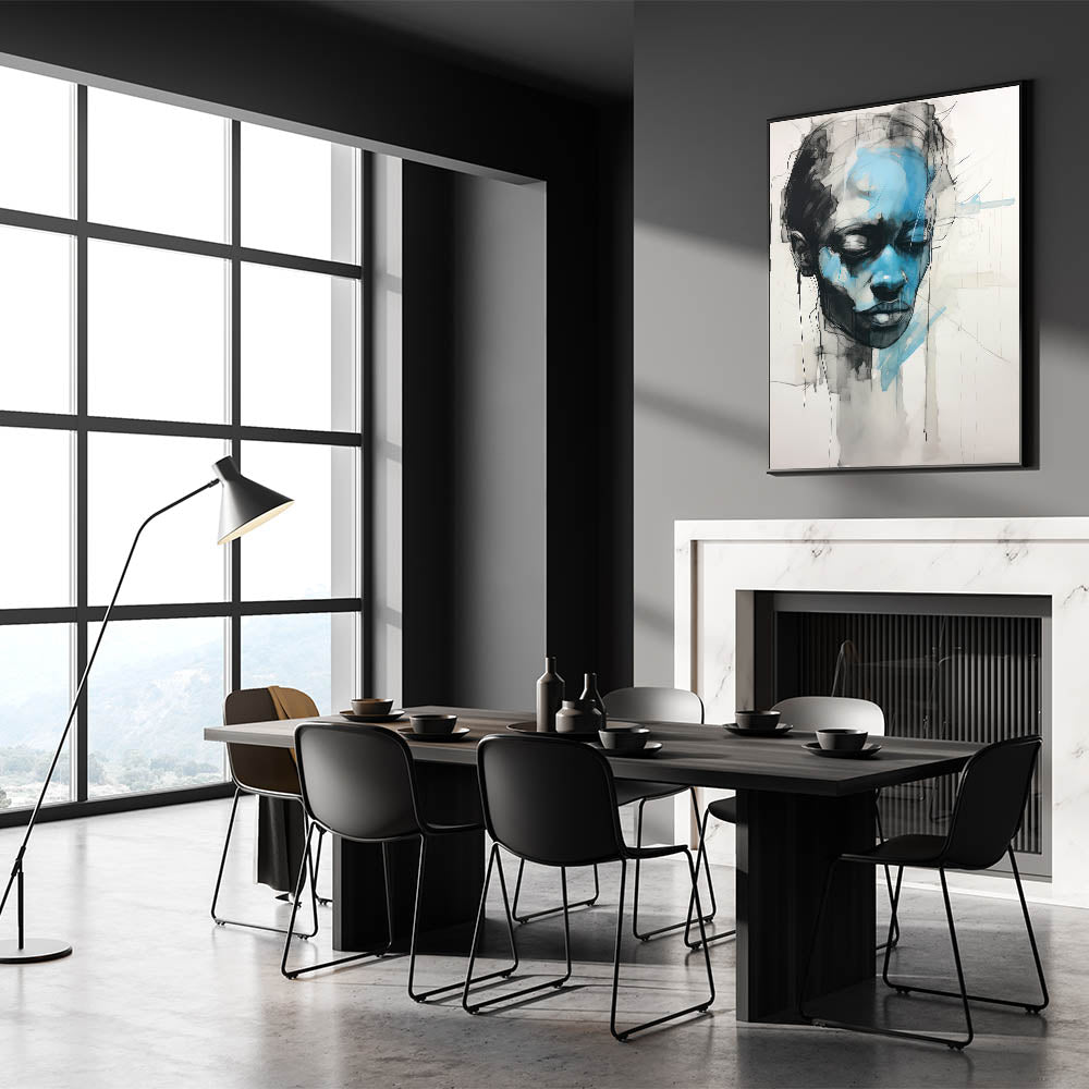 Immerse yourself in the emotion and intensity of this Abstract Electric Portrait. The artwork presents a powerful and expressive figure rendered in black and blue tones, blending abstract strokes and minimalistic elements. The dynamic brushwork and fluid lines create a captivating effect, evoking a sense of introspection and depth. The use of vibrant blue against a monochromatic base adds contrast and energy, making it a standout piece for modern and contemporary interiors.