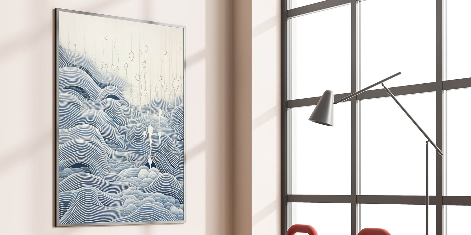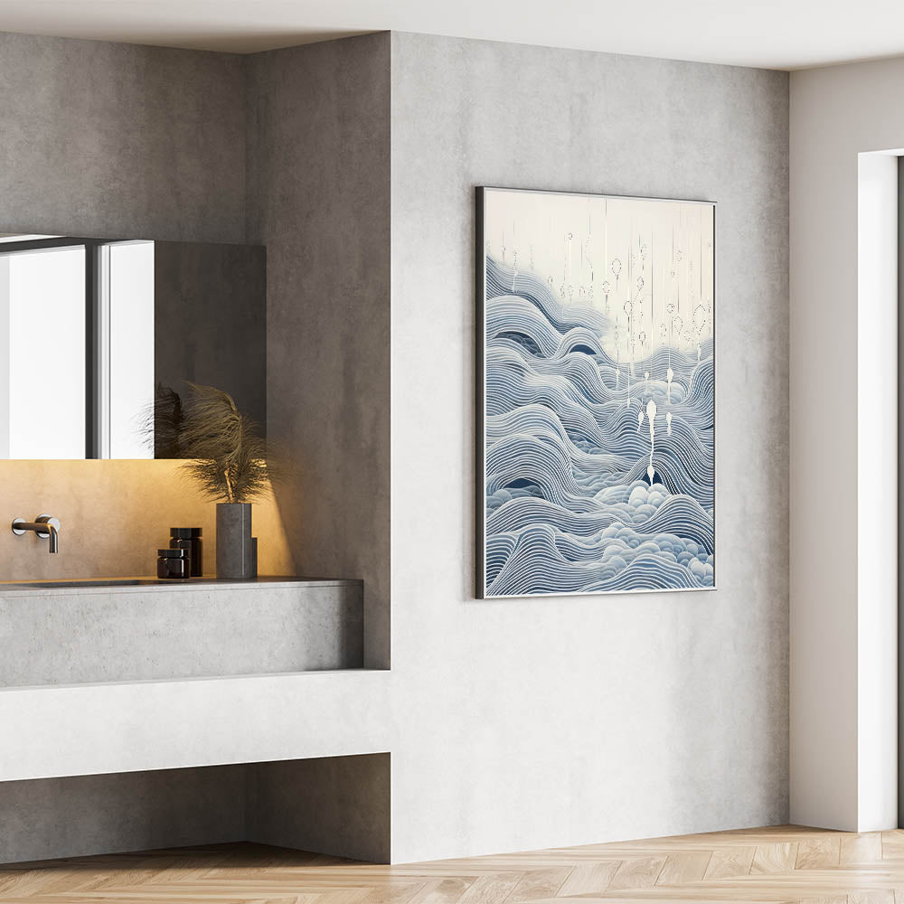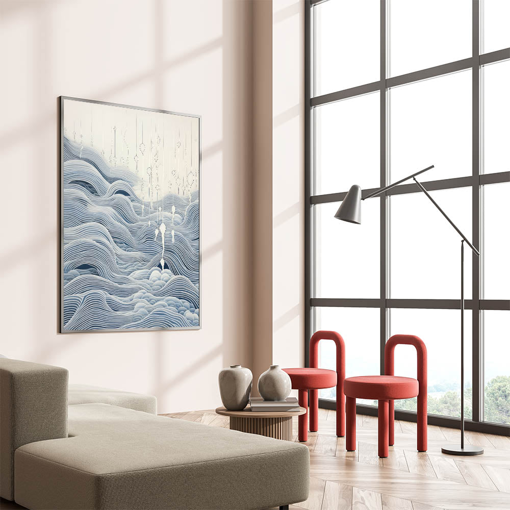 This electric art canvas is designed to bring tranquility and visual appeal, whether displayed as a sleek acrylic glass piece or a classic framed print. Its flowing waves and soft hues create an inviting atmosphere, perfect for those looking to enhance their space with a touch of elegance and calm.