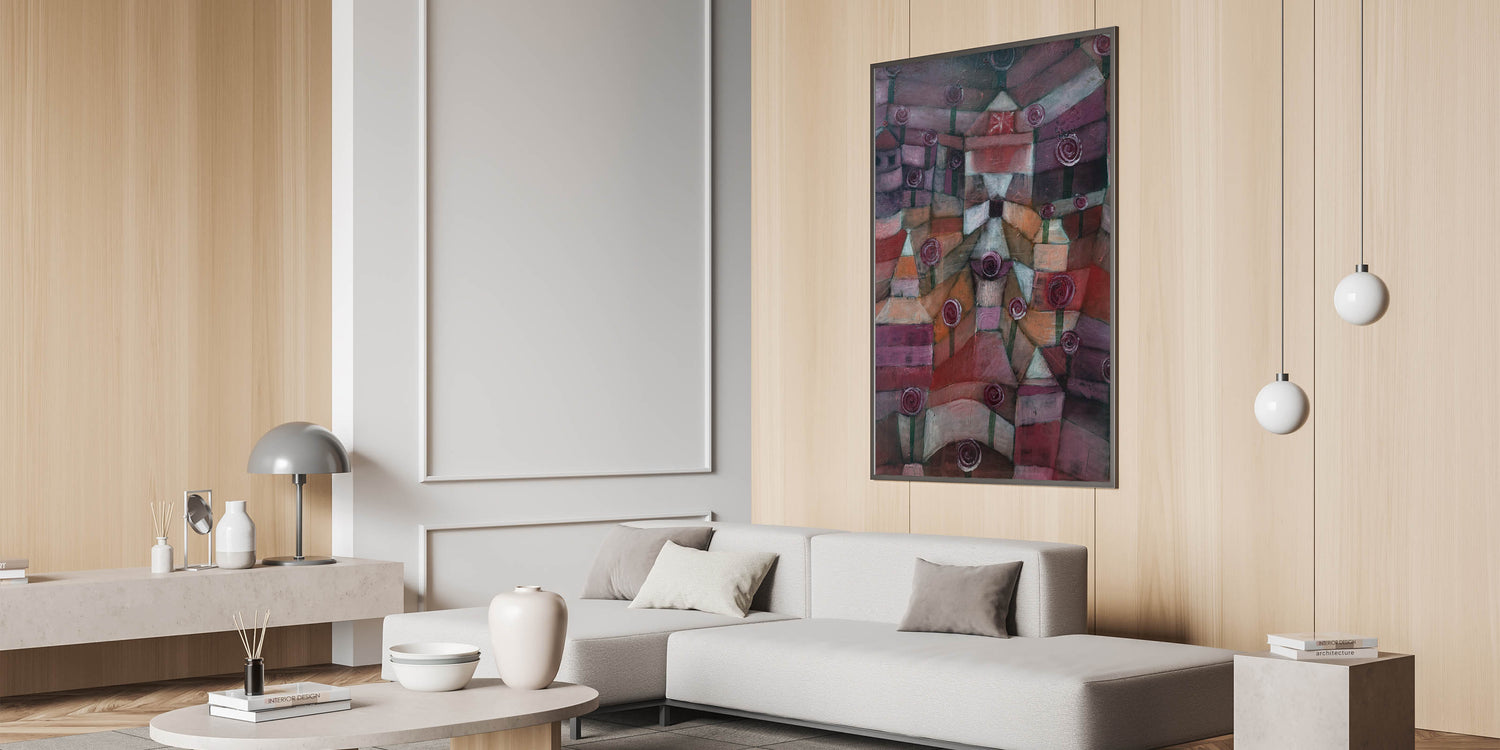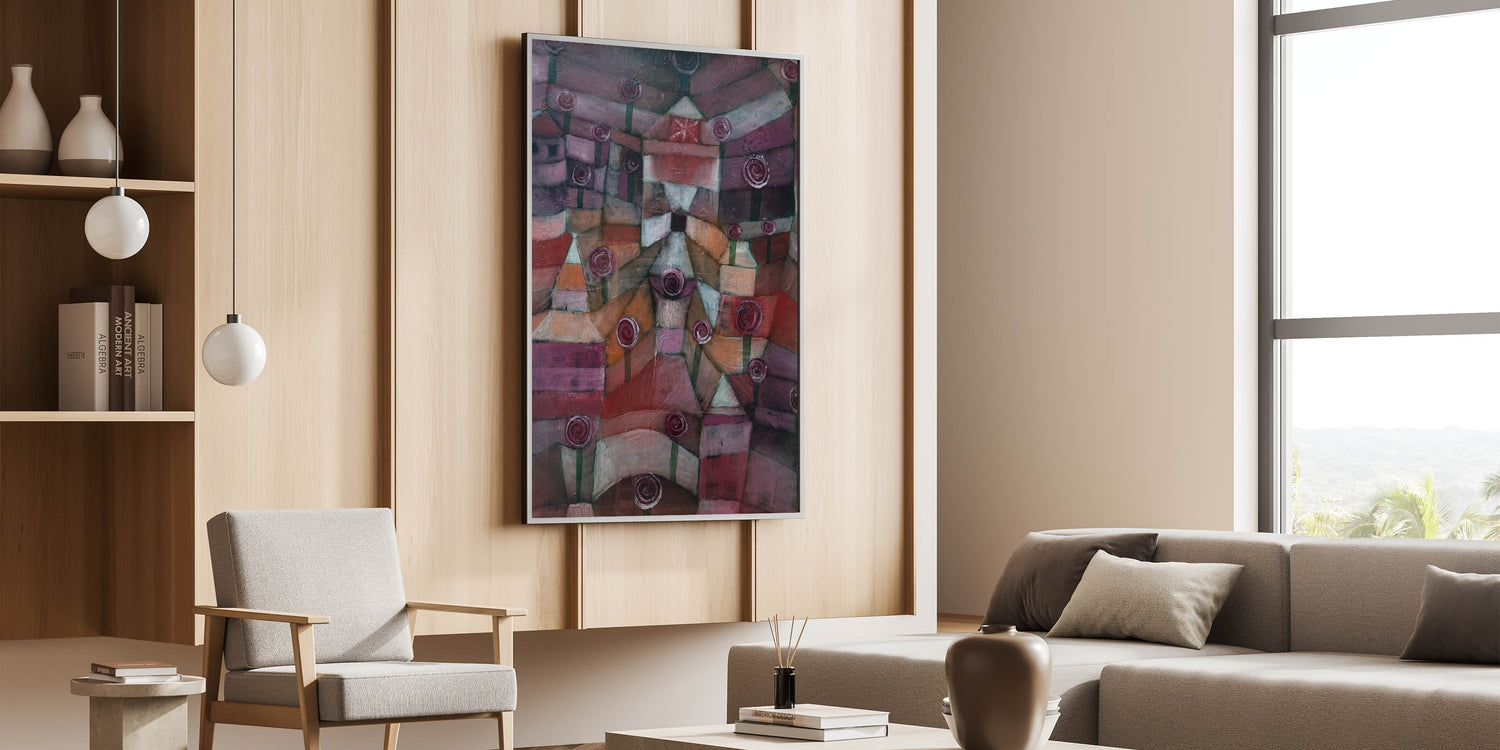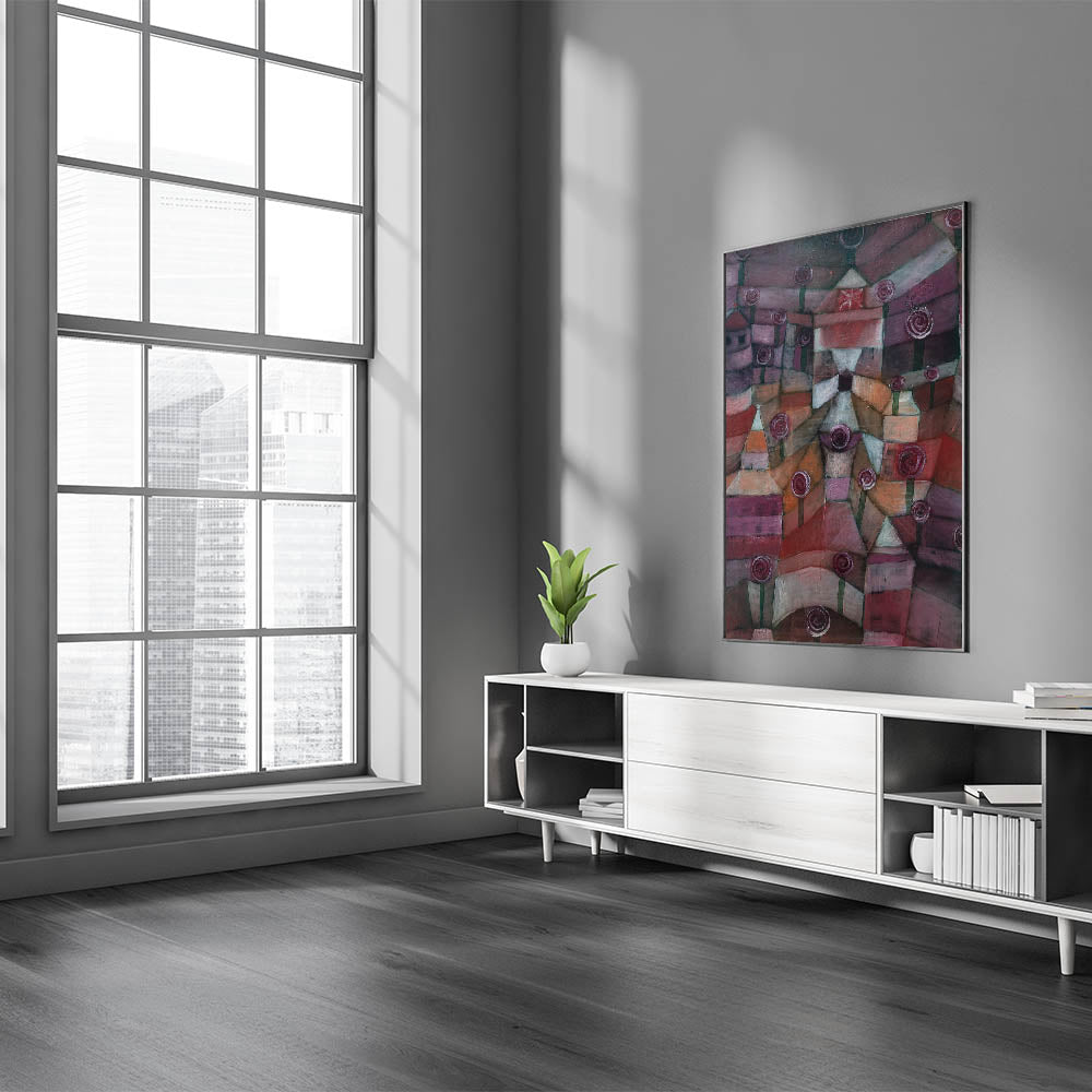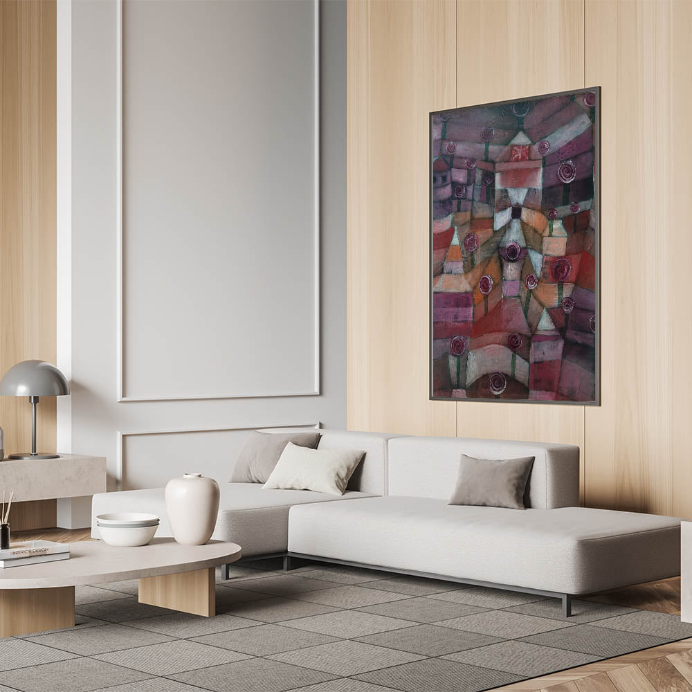 Enhance your space with the rich, abstract beauty of "Rose Garden" by Paul Klee. This artwork features a unique, stylized garden with roses, rendered in deep hues of burgundy, plum, and muted earth tones. With its captivating geometric patterns and symbolic representation, it brings a touch of modern elegance and intrigue to any room.