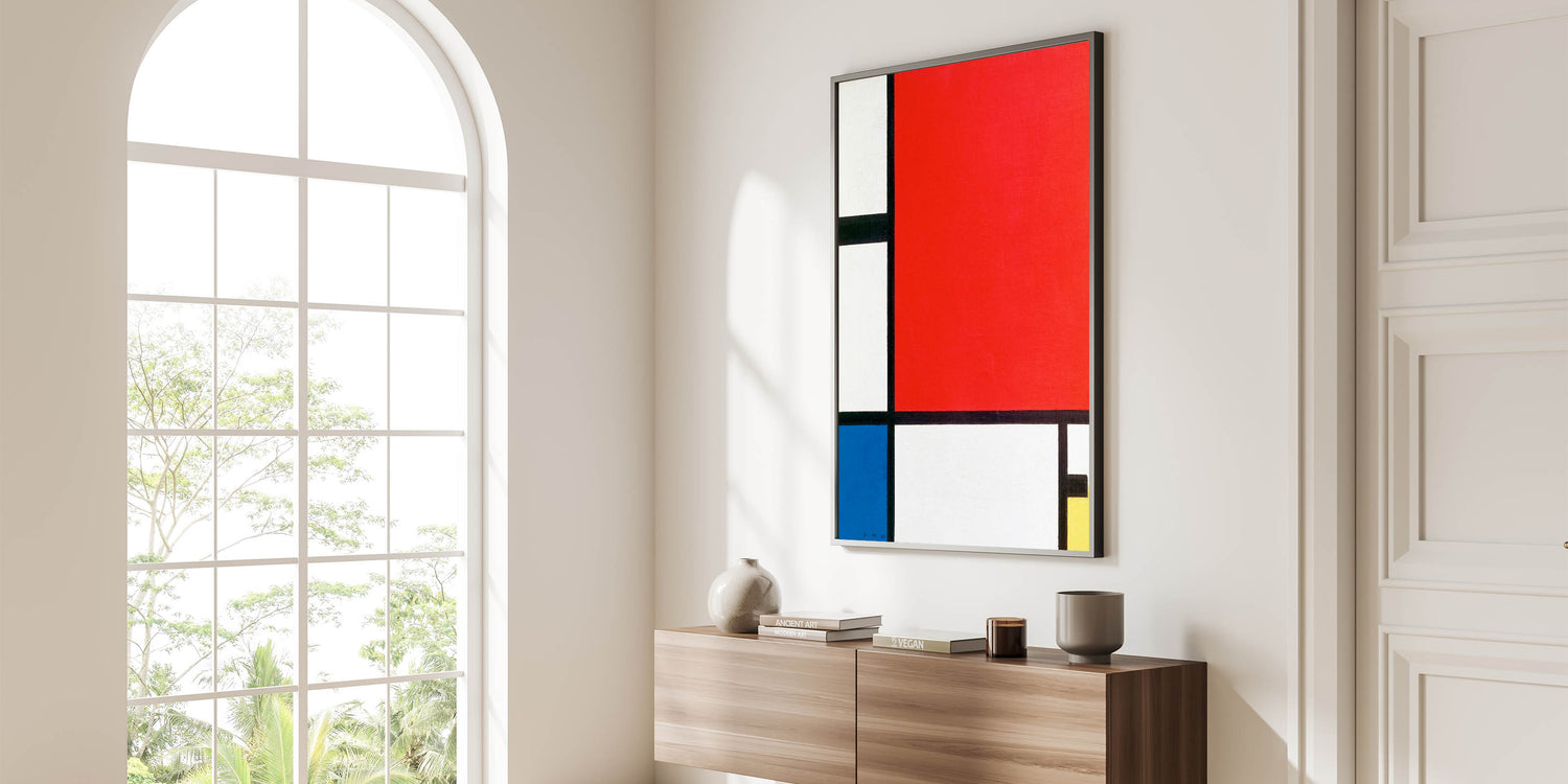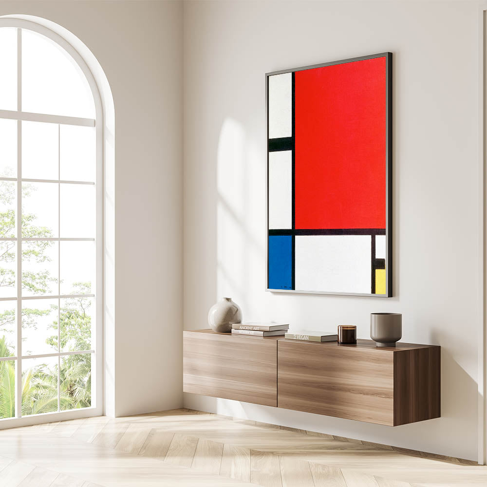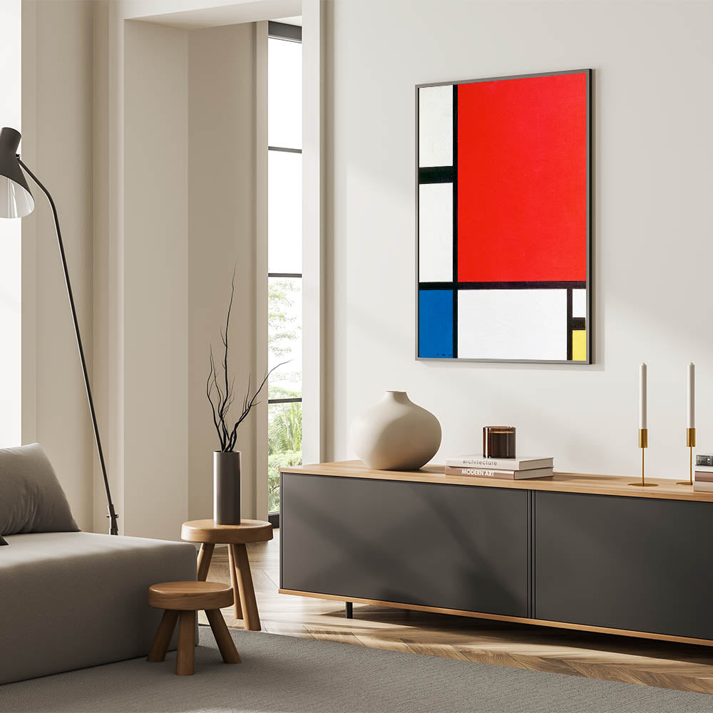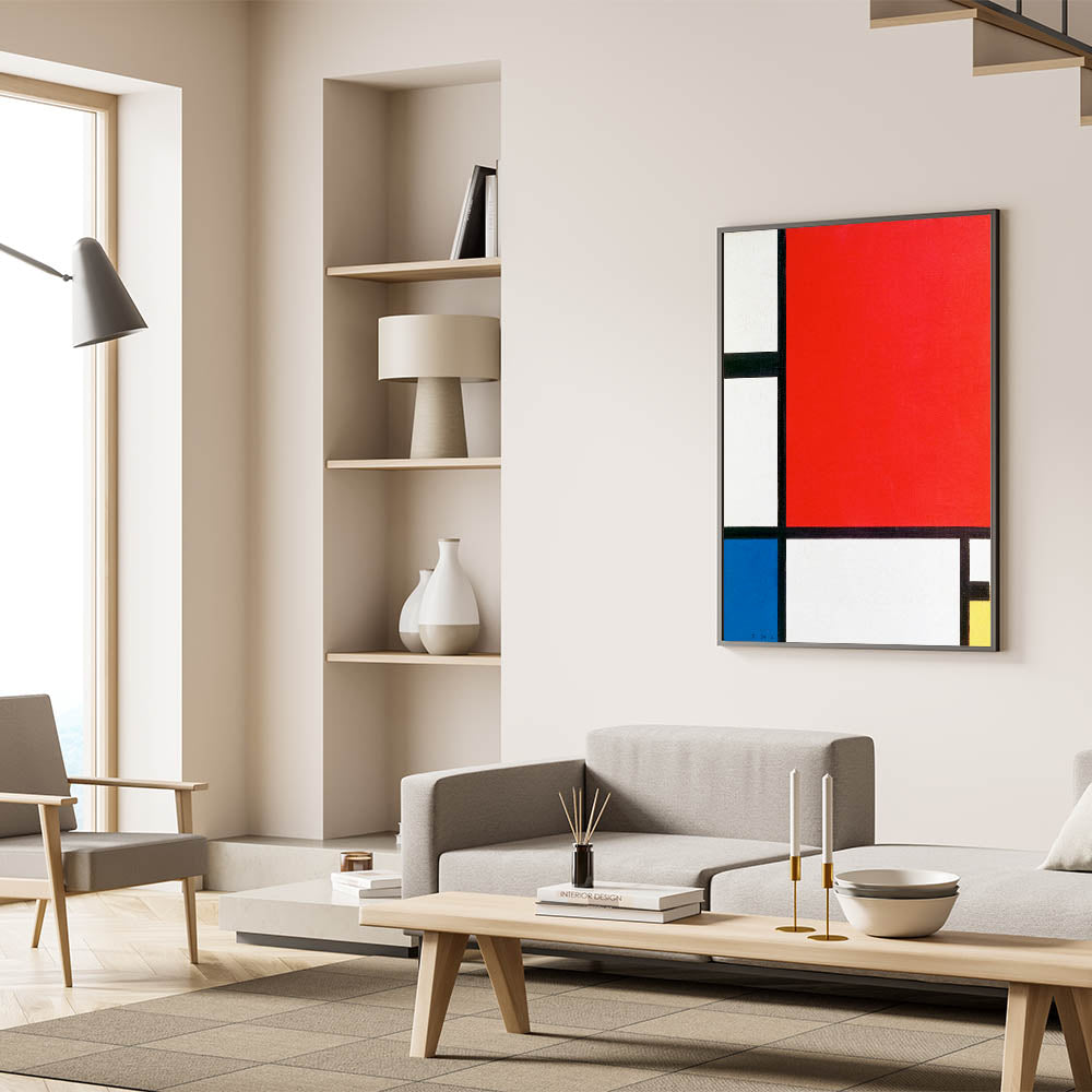Add a touch of modern sophistication to your decor with this minimalist abstract wall art, inspired by Piet Mondrian’s iconic style. Featuring bold blocks of red, blue, and yellow with striking black lines, this artwork embodies the essence of geometric abstraction and minimalist modern decor. Perfect for those who appreciate clean, structured design, this unique modern art piece enhances any room with a sense of balance and harmony.