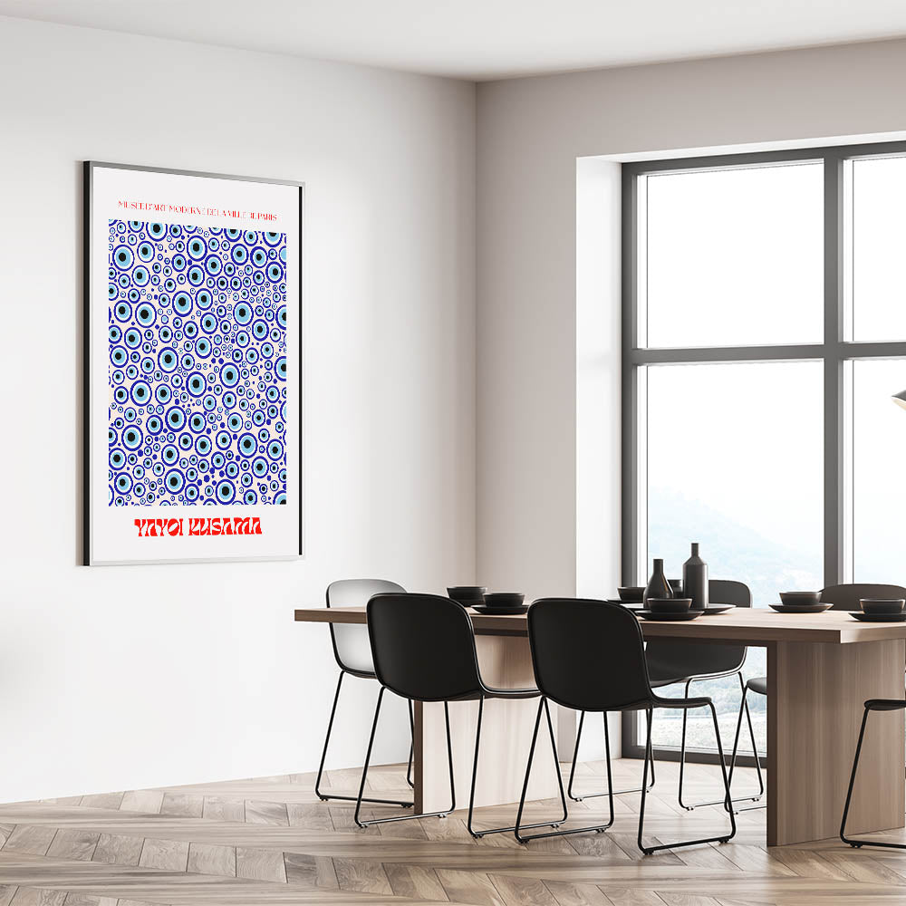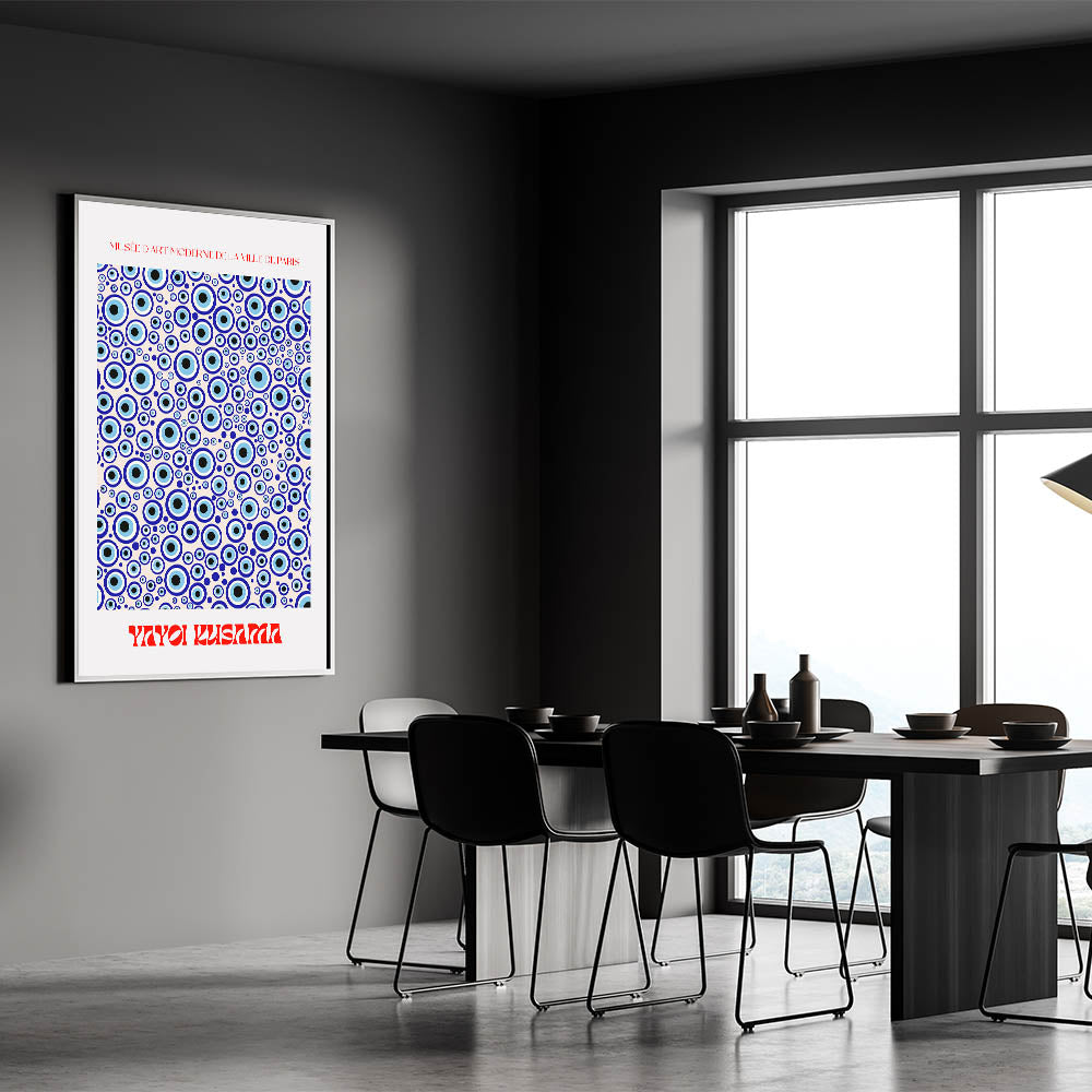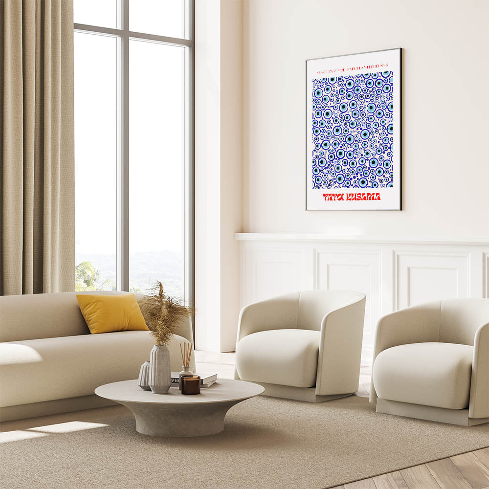 Transform your space with this dynamic contemporary canvas art featuring a vibrant blue circular pattern inspired by Yayoi Kusama's renowned style. The composition showcases a series of concentric circles in various shades of blue, creating a playful and captivating visual effect. The pattern is set against a soft beige background, which adds balance and makes the vivid blue colors pop, making it an ideal choice for modern wall decor that stands out.