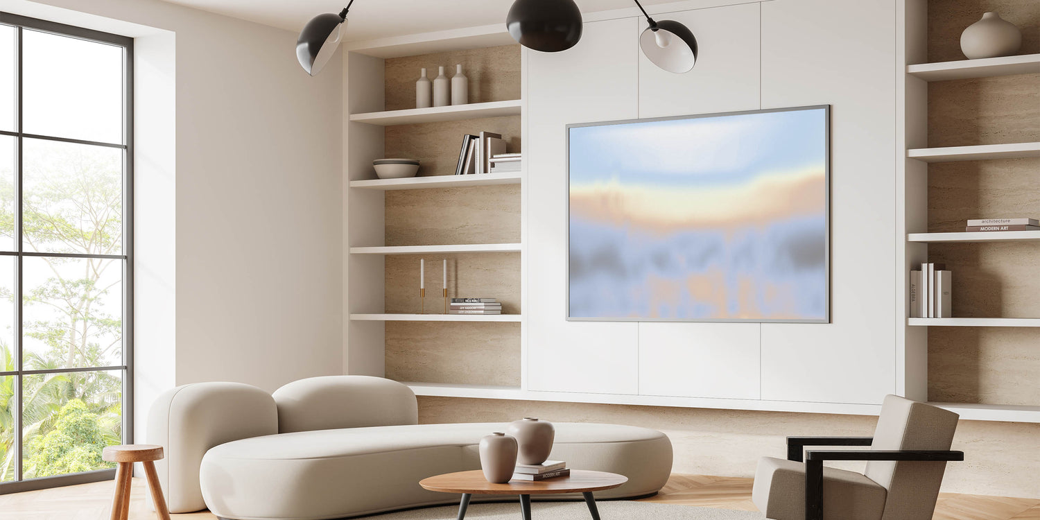 - Sky-inspired abstract design with pastel gradient hues of blue, cream, and beige