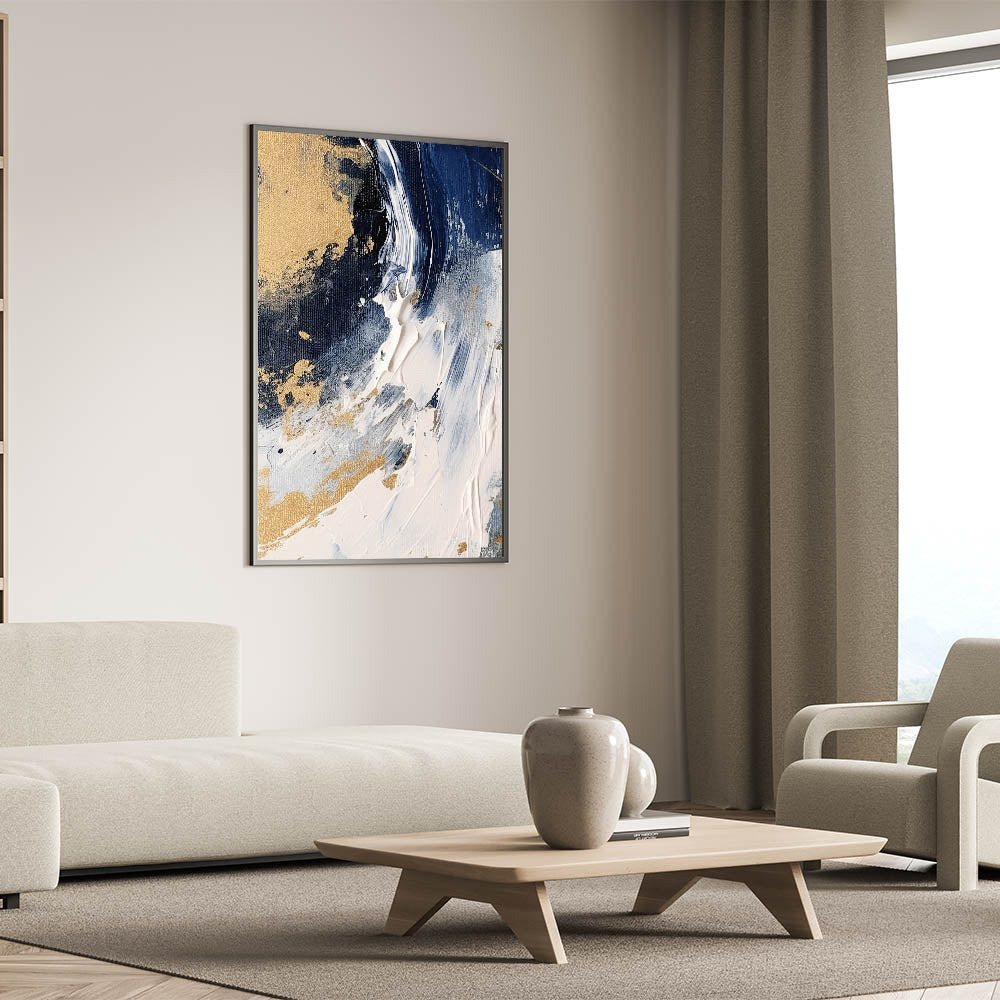 Bring elegance and modern sophistication to your space with this abstract navy and gold glam wall art. Featuring bold strokes of navy, white, and shimmering gold, this artwork exudes a luxurious and contemporary feel. The textured design and rich color palette make it a stunning focal point, perfect for adding a touch of glamor to your modern or chic interiors.
