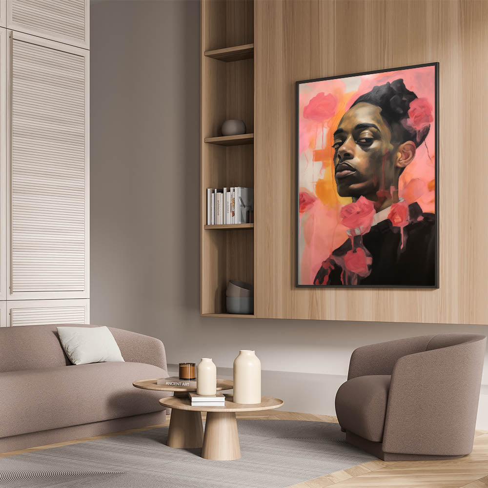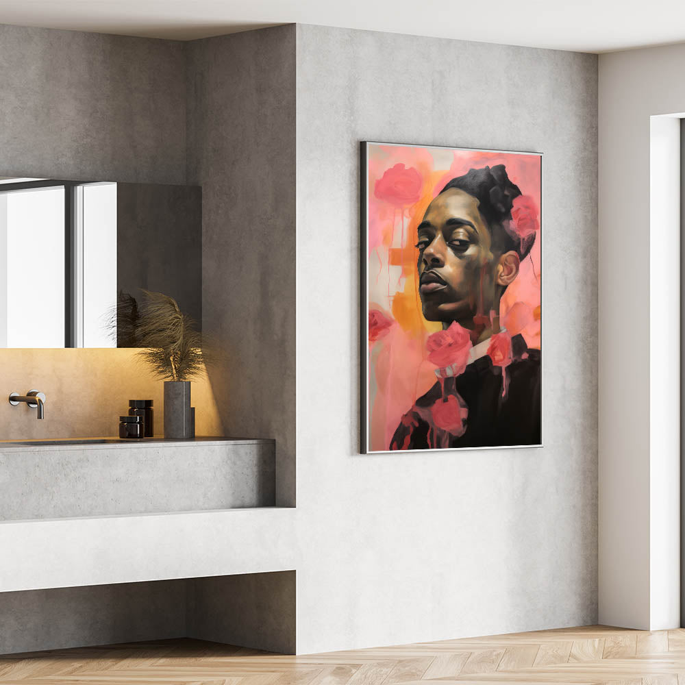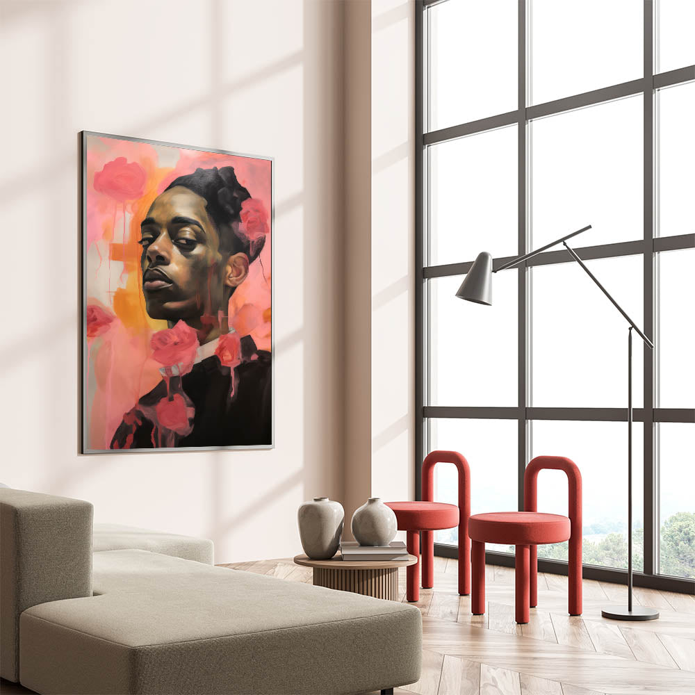 This striking abstract portrait showcases a modern and expressive figure set against a vibrant background, enhanced with bold floral motifs in pink and orange hues. The dynamic brushstrokes and dripping textures create an electric atmosphere, blending realism with an abstract twist. This piece is perfect for contemporary art lovers seeking a statement piece that merges bold emotion with vibrant colors.